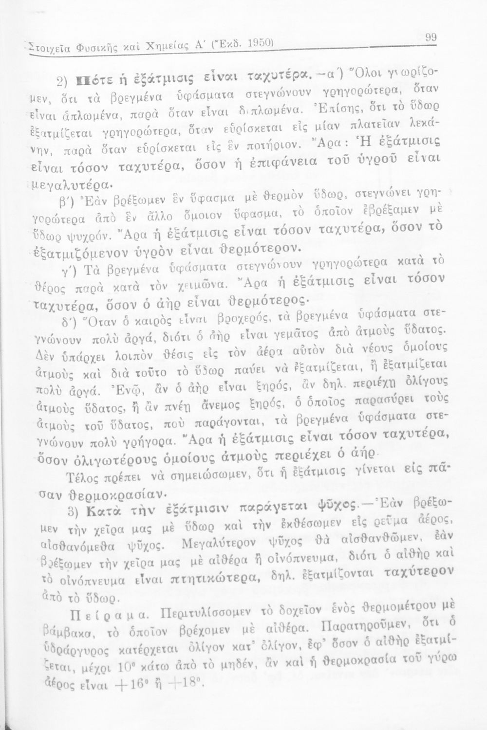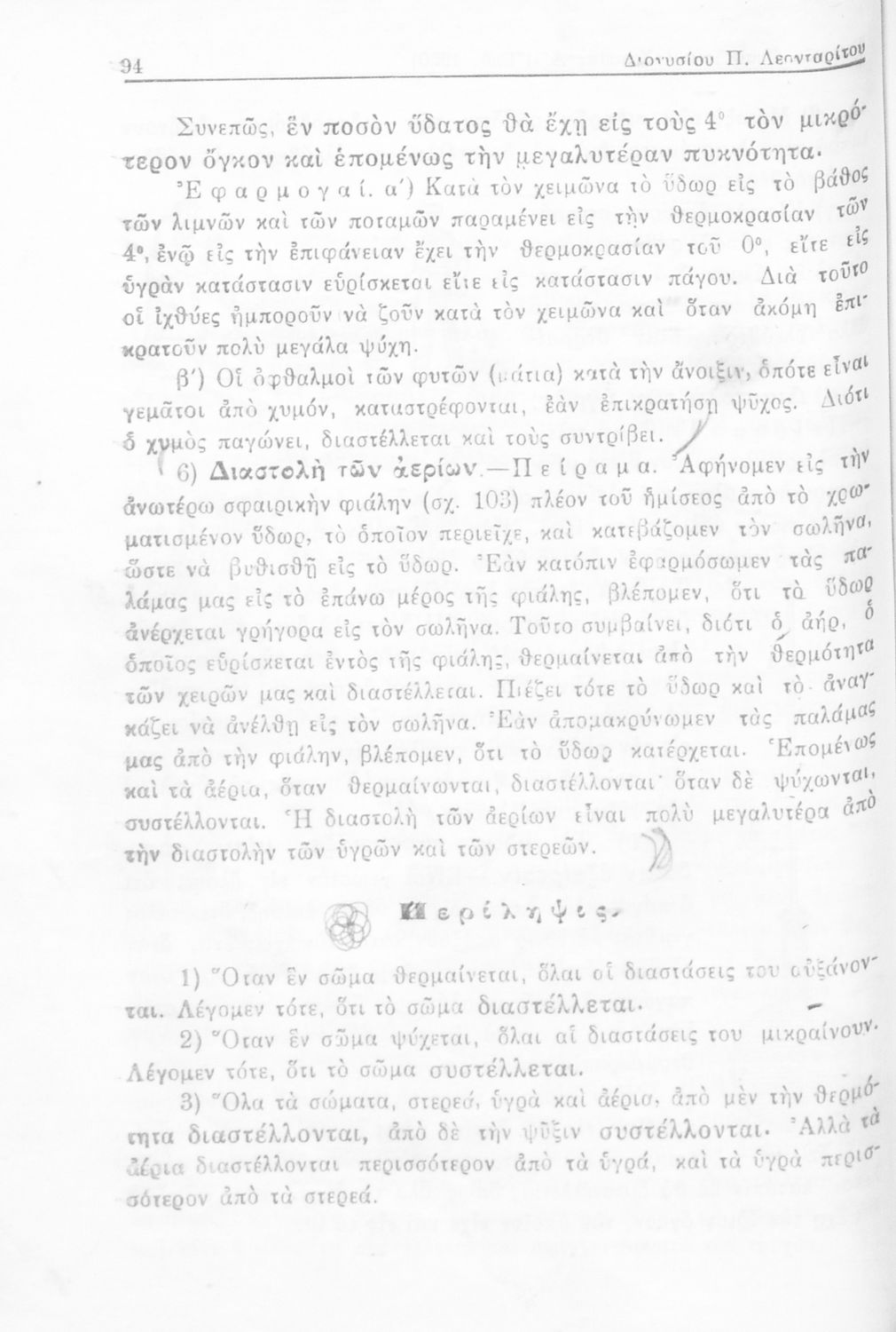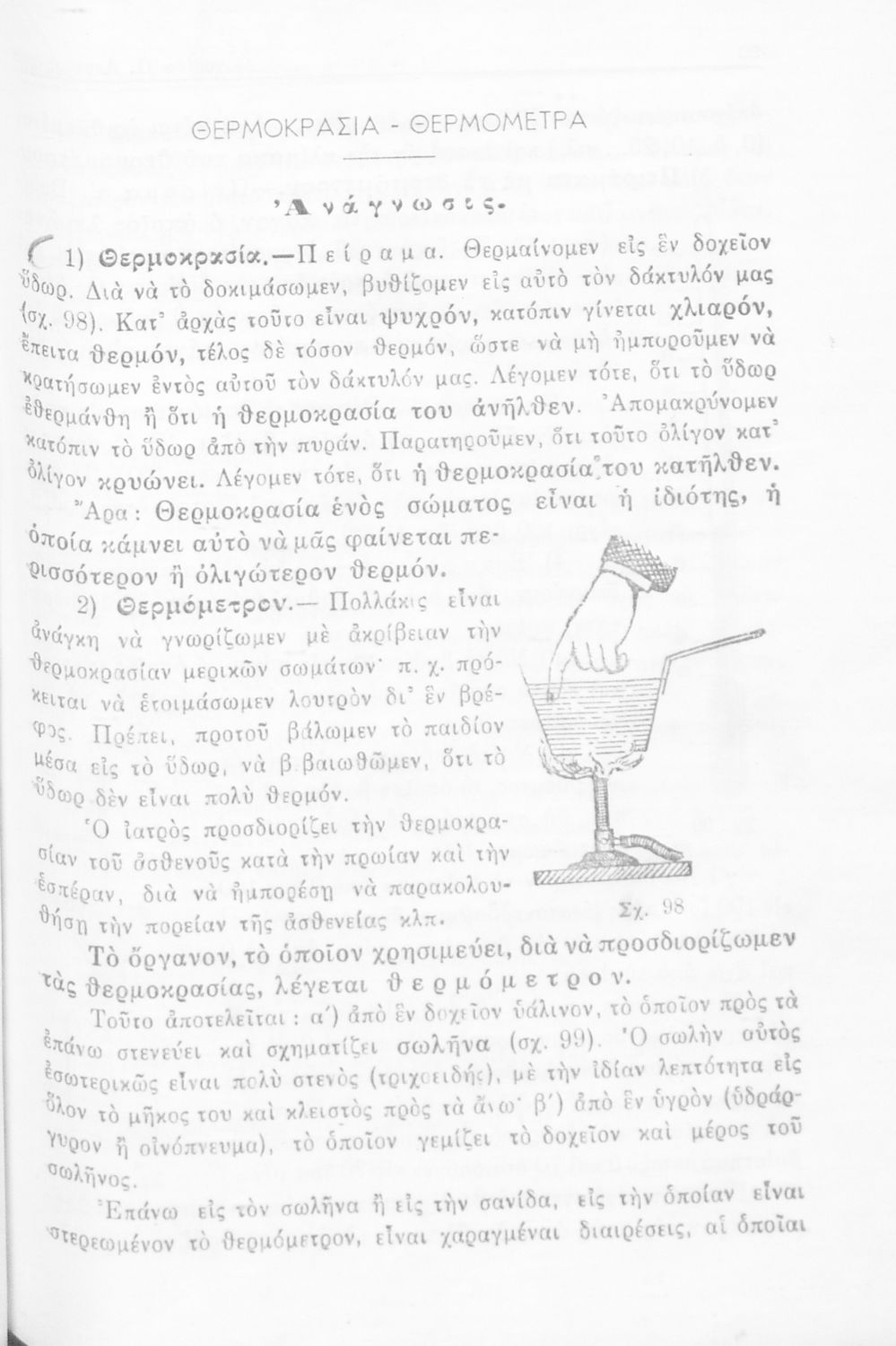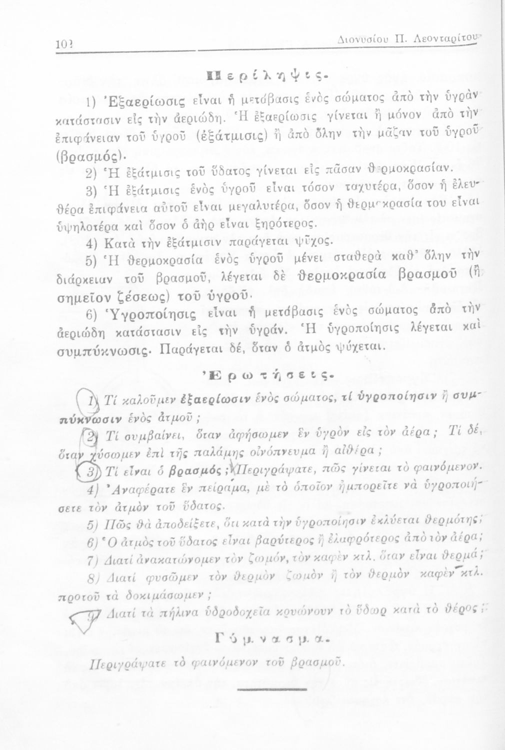 Βαθμίδα εκπαίδευσης: Δευτεροβάθμια Τάξη: Α' Γυμνασίου Γλώσσα: Καθαρεύουσα Παρουσίαση περιεχομένου: Σχολικό εγχειρίδιο Χημείας και Φυσικής της Α΄ Γυμνασίου. Ασχολείται με τις ιδιότητες των υγρών και των αερίων, την επίδραση που έχει η θερμοκρασία στα στερεά και τα υγρά, τη μετάδοση του ήχου, και τις ιδιότητες του φωτός. Τέλος, το βιβλίο ολοκληρώνει εστιάζοντας σε ζητήματα ηλεκτρισμού και ηλεκτρομαγνητισμού |