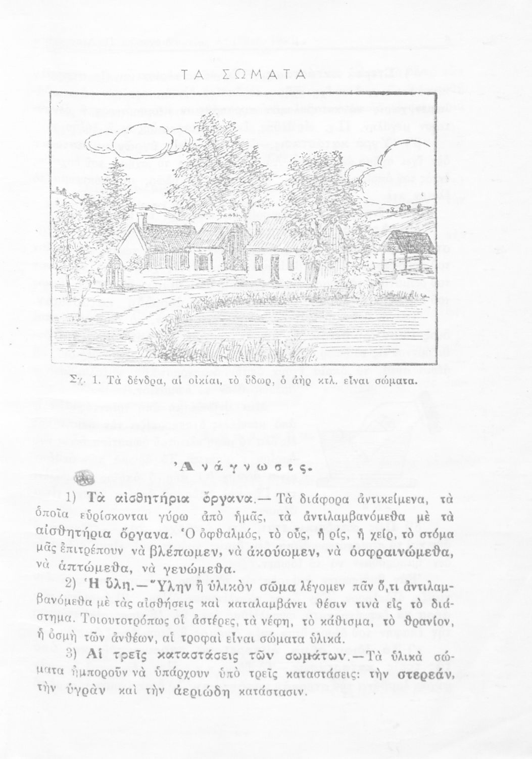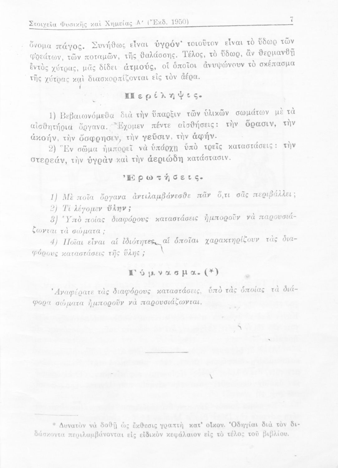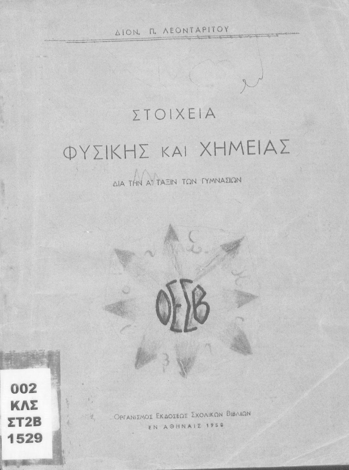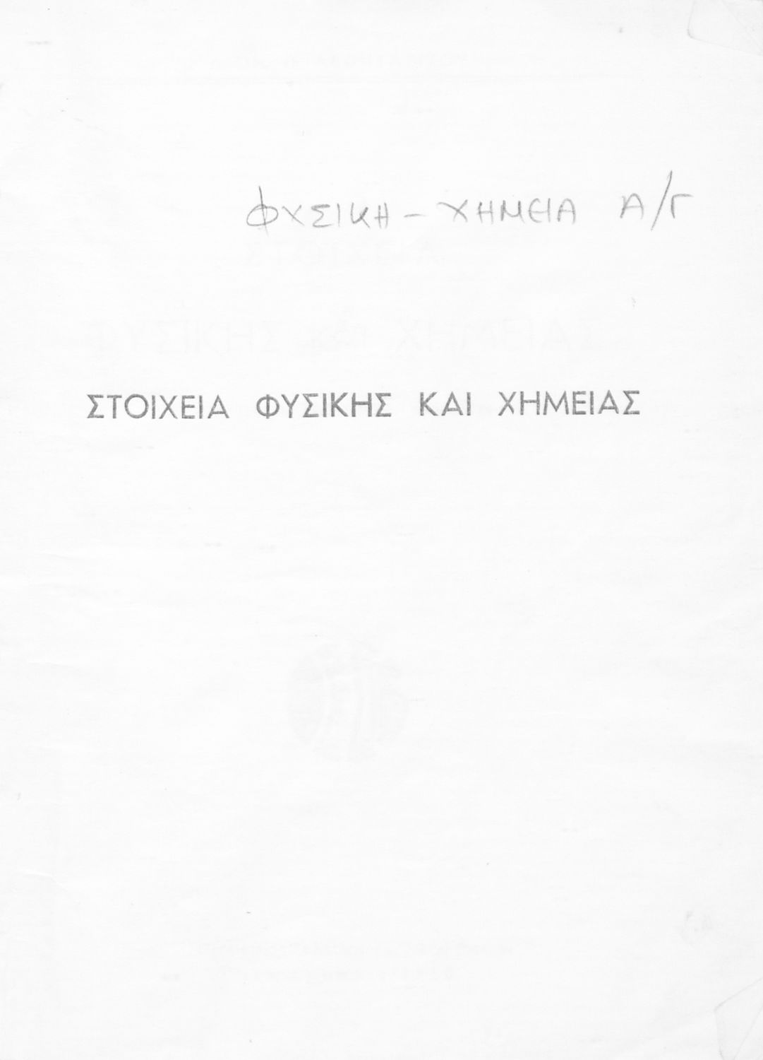 Βαθμίδα εκπαίδευσης: Δευτεροβάθμια Τάξη: Α' Γυμνασίου Γλώσσα: Καθαρεύουσα Παρουσίαση περιεχομένου: Σχολικό εγχειρίδιο Χημείας και Φυσικής της Α΄ Γυμνασίου. Ασχολείται με τις ιδιότητες των υγρών και των αερίων, την επίδραση που έχει η θερμοκρασία στα στερεά και τα υγρά, τη μετάδοση του ήχου, και τις ιδιότητες του φωτός. Τέλος, το βιβλίο ολοκληρώνει εστιάζοντας σε ζητήματα ηλεκτρισμού και ηλεκτρομαγνητισμού |