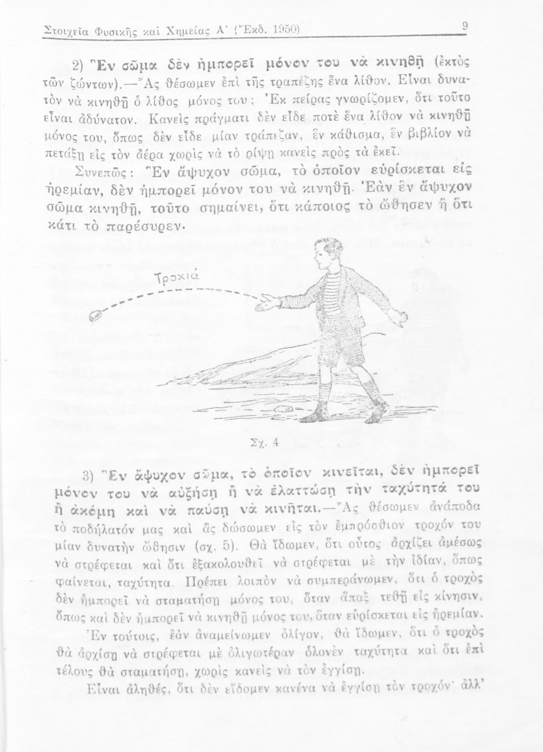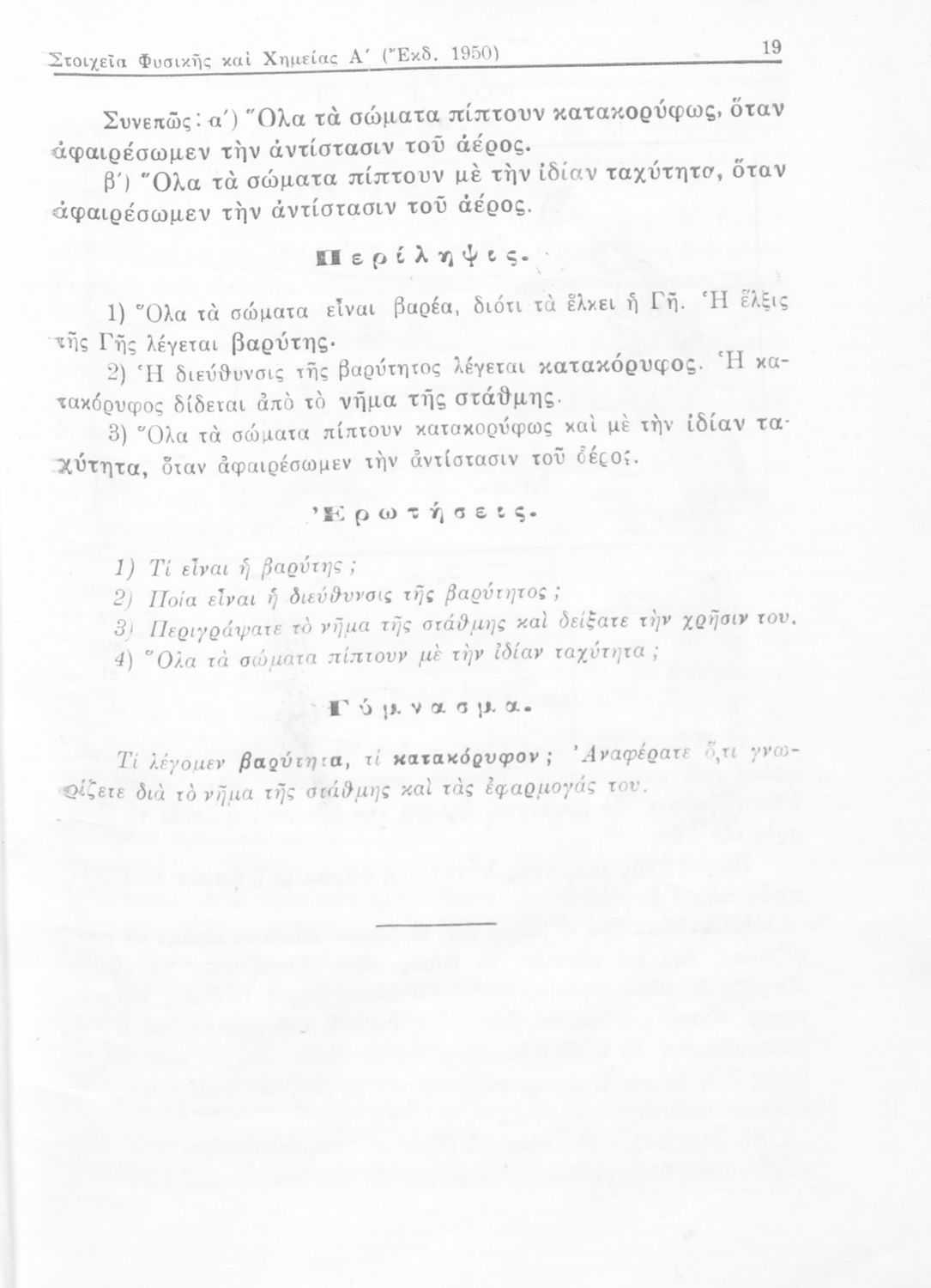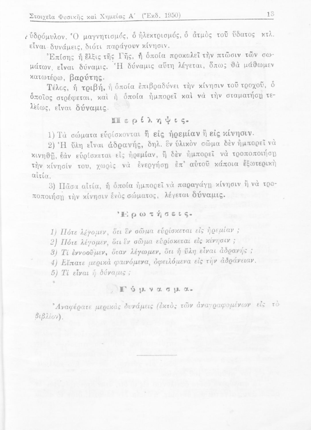 Βαθμίδα εκπαίδευσης: Δευτεροβάθμια Τάξη: Α' Γυμνασίου Γλώσσα: Καθαρεύουσα Παρουσίαση περιεχομένου: Σχολικό εγχειρίδιο Χημείας και Φυσικής της Α΄ Γυμνασίου. Ασχολείται με τις ιδιότητες των υγρών και των αερίων, την επίδραση που έχει η θερμοκρασία στα στερεά και τα υγρά, τη μετάδοση του ήχου, και τις ιδιότητες του φωτός. Τέλος, το βιβλίο ολοκληρώνει εστιάζοντας σε ζητήματα ηλεκτρισμού και ηλεκτρομαγνητισμού |