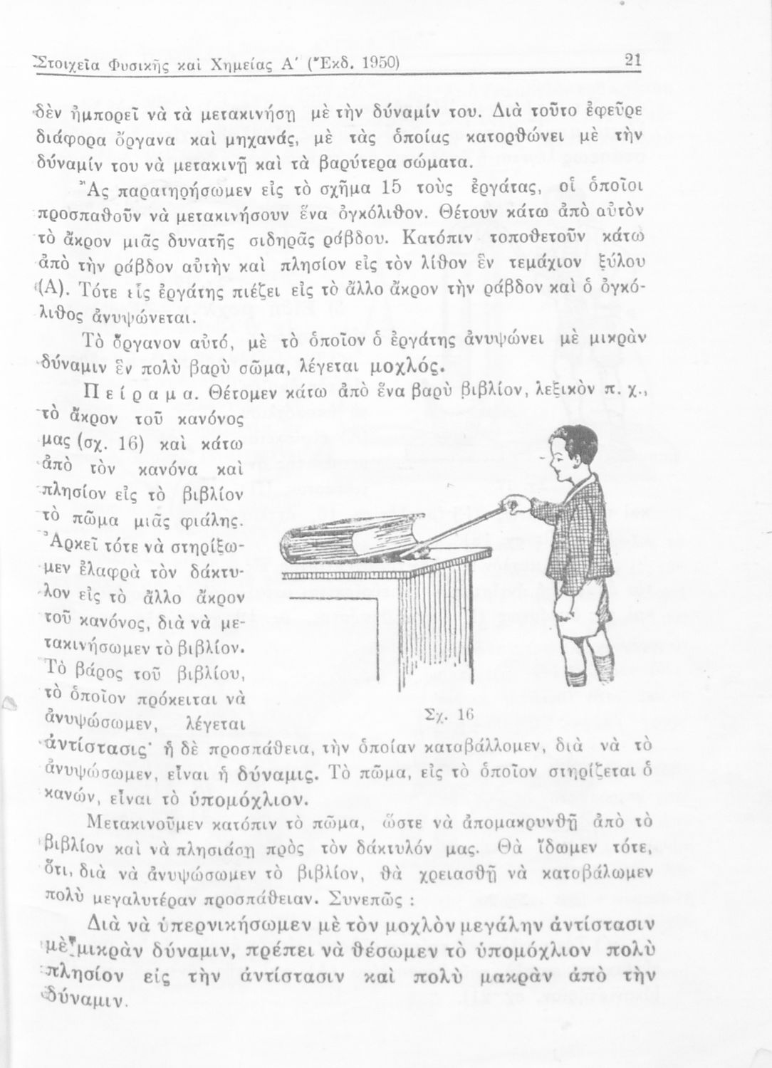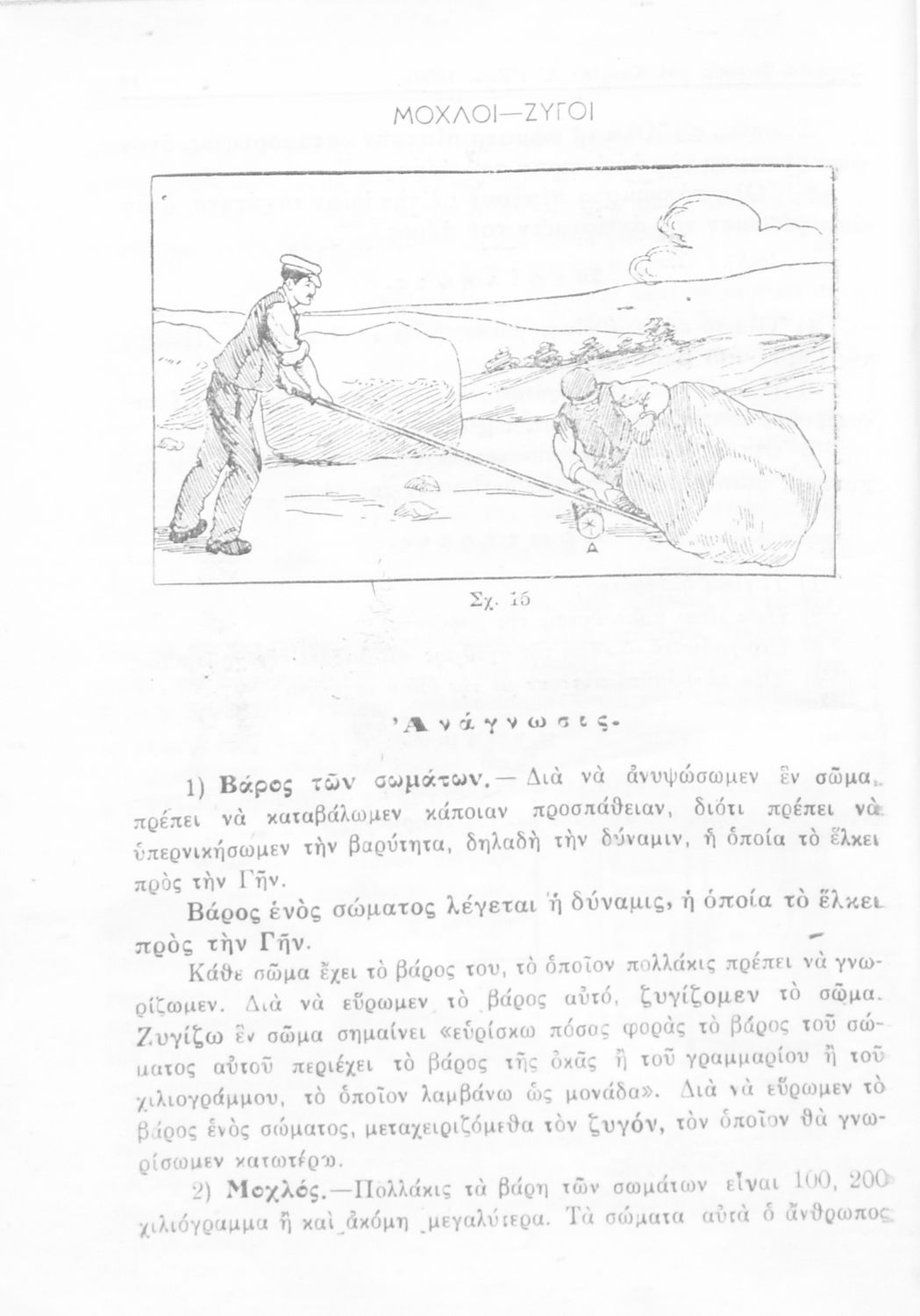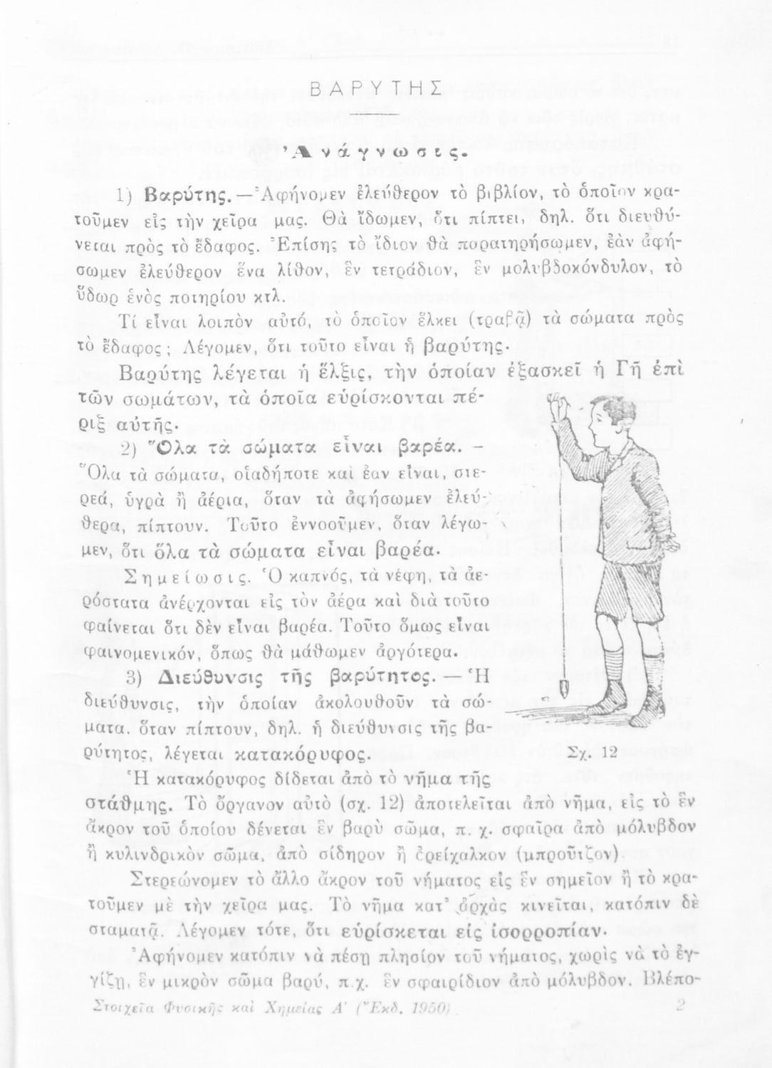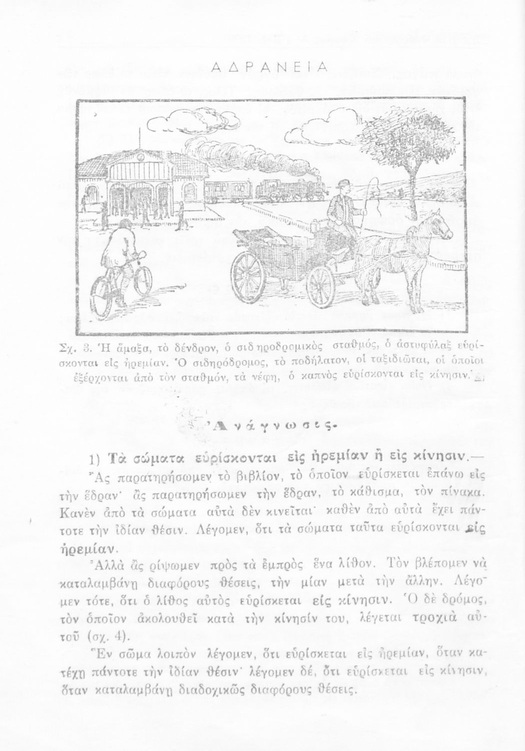 Βαθμίδα εκπαίδευσης: Δευτεροβάθμια Τάξη: Α' Γυμνασίου Γλώσσα: Καθαρεύουσα Παρουσίαση περιεχομένου: Σχολικό εγχειρίδιο Χημείας και Φυσικής της Α΄ Γυμνασίου. Ασχολείται με τις ιδιότητες των υγρών και των αερίων, την επίδραση που έχει η θερμοκρασία στα στερεά και τα υγρά, τη μετάδοση του ήχου, και τις ιδιότητες του φωτός. Τέλος, το βιβλίο ολοκληρώνει εστιάζοντας σε ζητήματα ηλεκτρισμού και ηλεκτρομαγνητισμού |