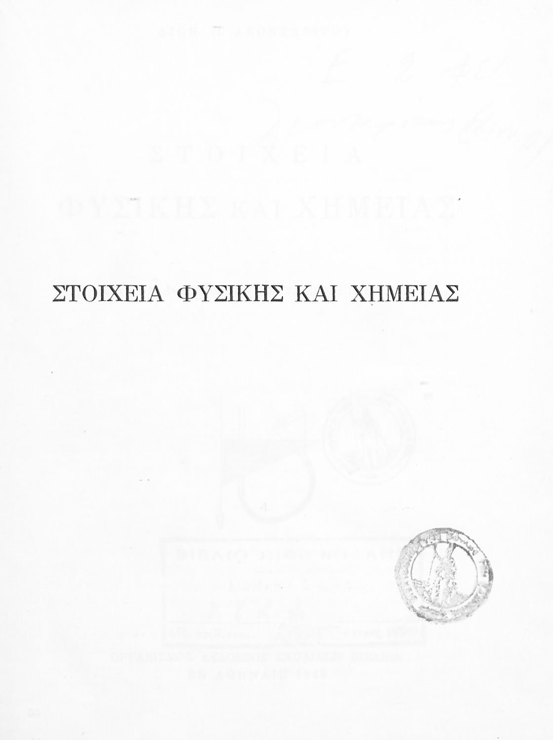 Βαθμίδα εκπαίδευσης: Δευτεροβάθμια Τάξη: Α' Γυμνασίου Γλώσσα: Απλή καθαρεύουσα Παρουσίαση περιεχομένου: Σχολικό εγχειρίδιο Φυσικής και Χημείας της Α' Γυμνασίου. Το βιβλίο ξεκινάει με την κίνηση των σωμάτων, την επίδραση που έχει η θερμότητα πάνω τους, εξετάζει ζητήματα φωτός, ήχου και ηλεκτρισμού. |