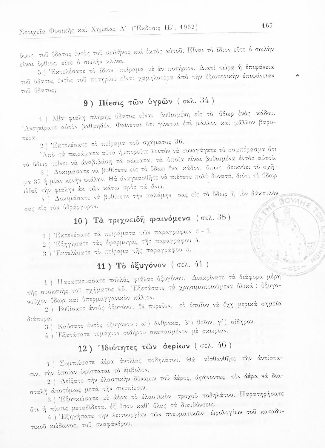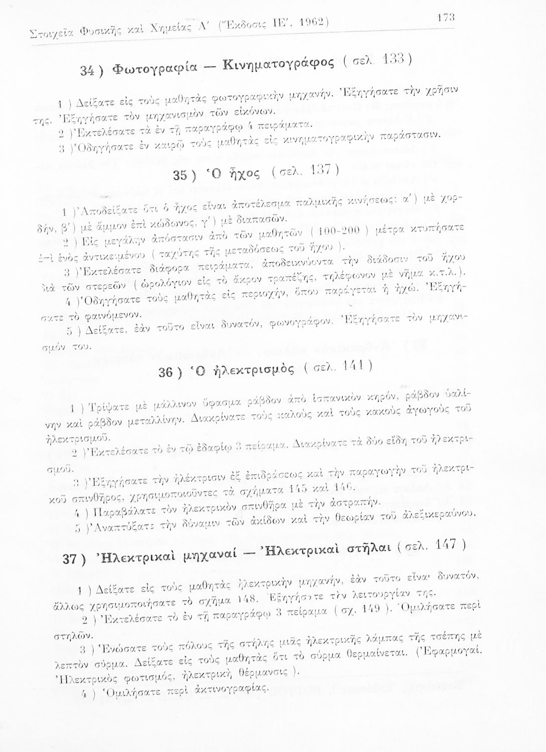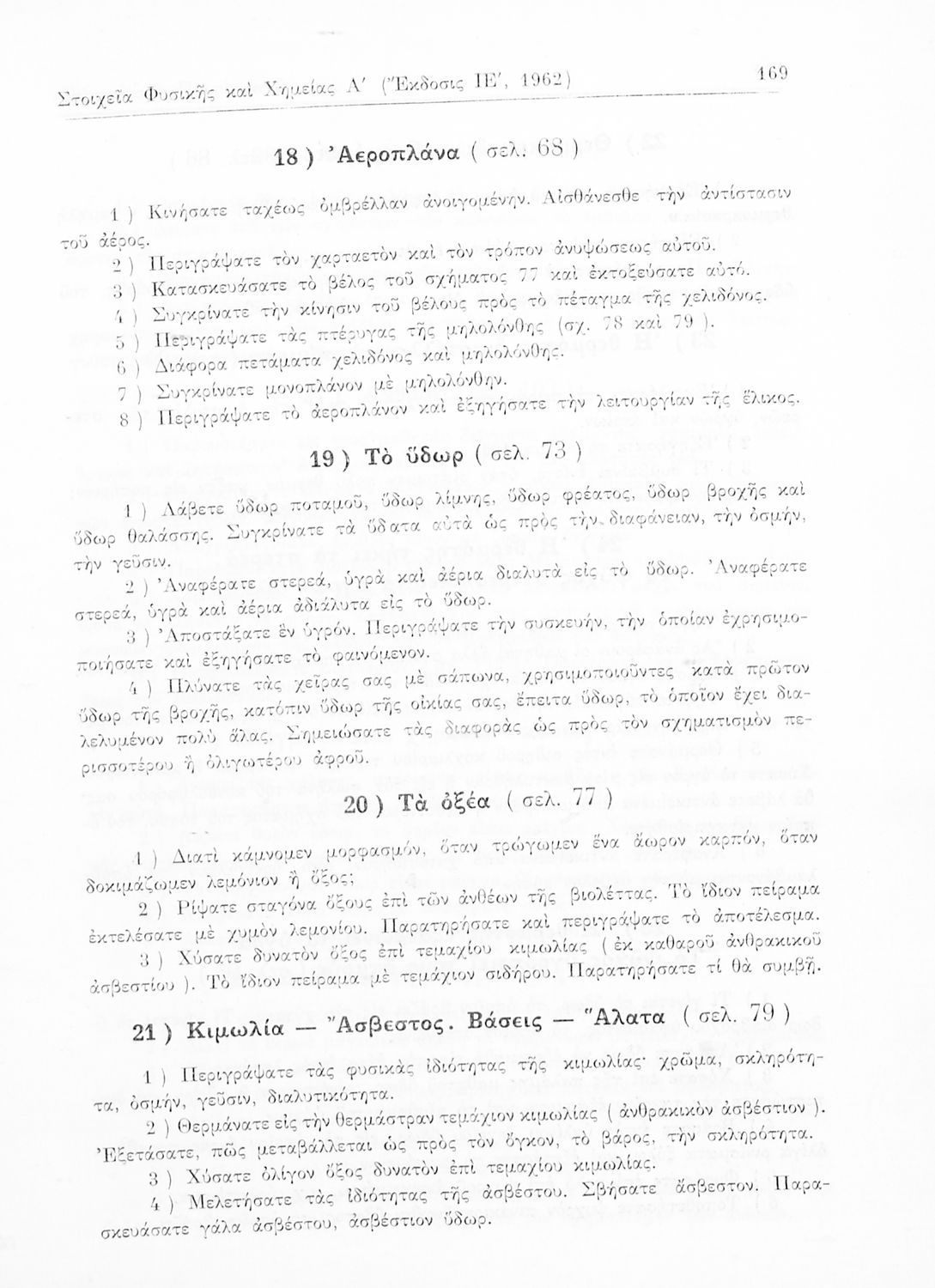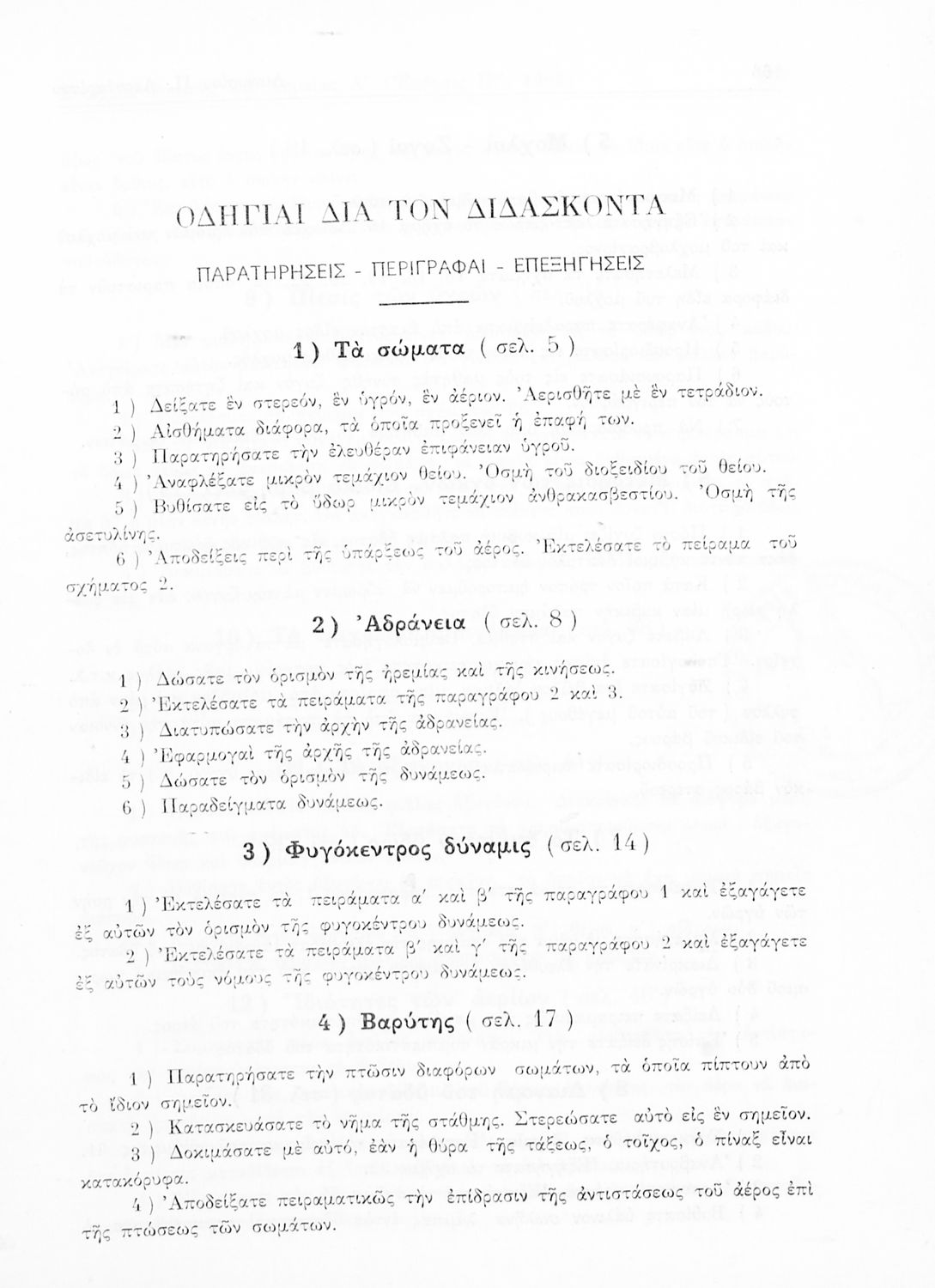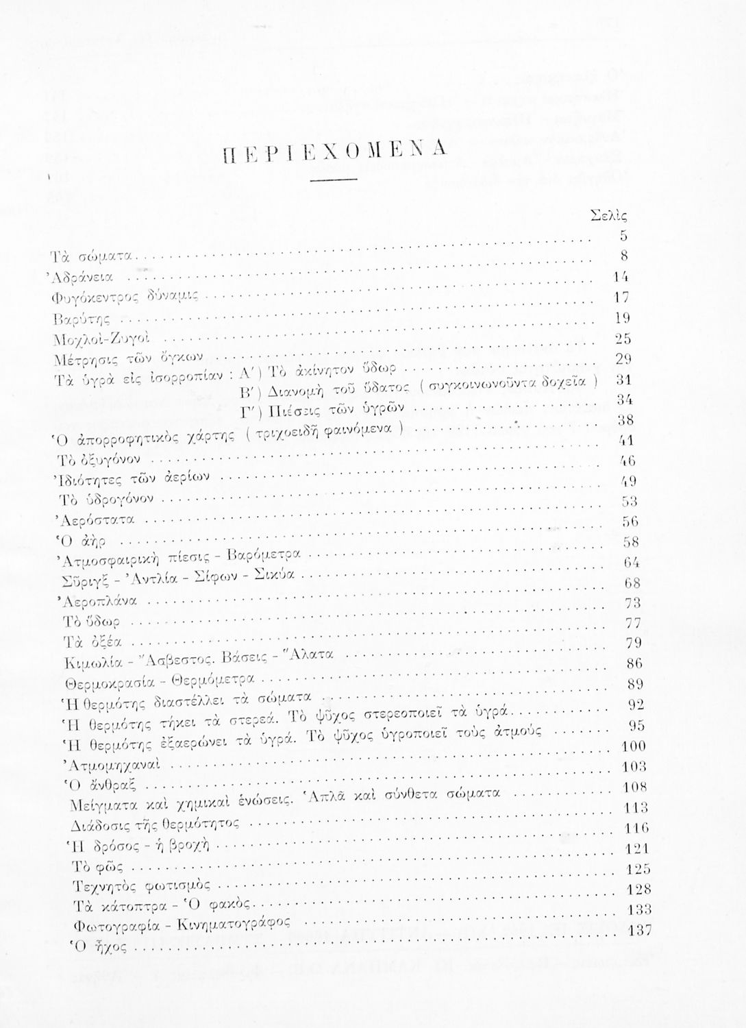 520 ## _aΣχολικό εγχειρίδιο Φυσικής και Χημείας της Α' Γυμνασίου. Το βιβλίο ξεκινάει με την κίνηση των σωμάτων, την επίδραση που έχει η θερμότητα πάνω τους, εξετάζει ζητήματα φωτός, ήχου και ηλεκτρισμού.