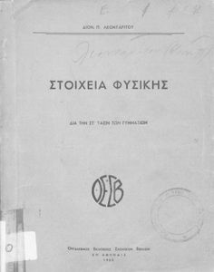 Κωδικός αναγνώρισης: 03-20557685 Τίτλος: Στοιχεία Φυσικής δια την ΣΤ΄ Τάξιν των Γυμνασίων Συγγραφέας: Διον. Π. Λεονταρίτης Μέγεθος και υπόστρωμα: Σχολικό εγχειρίδιο, μαλακό εξώφυλλο, 280 σελίδες. Σκίτσα, σχεδιαγράμματα (ασπρόμαυρα). |
