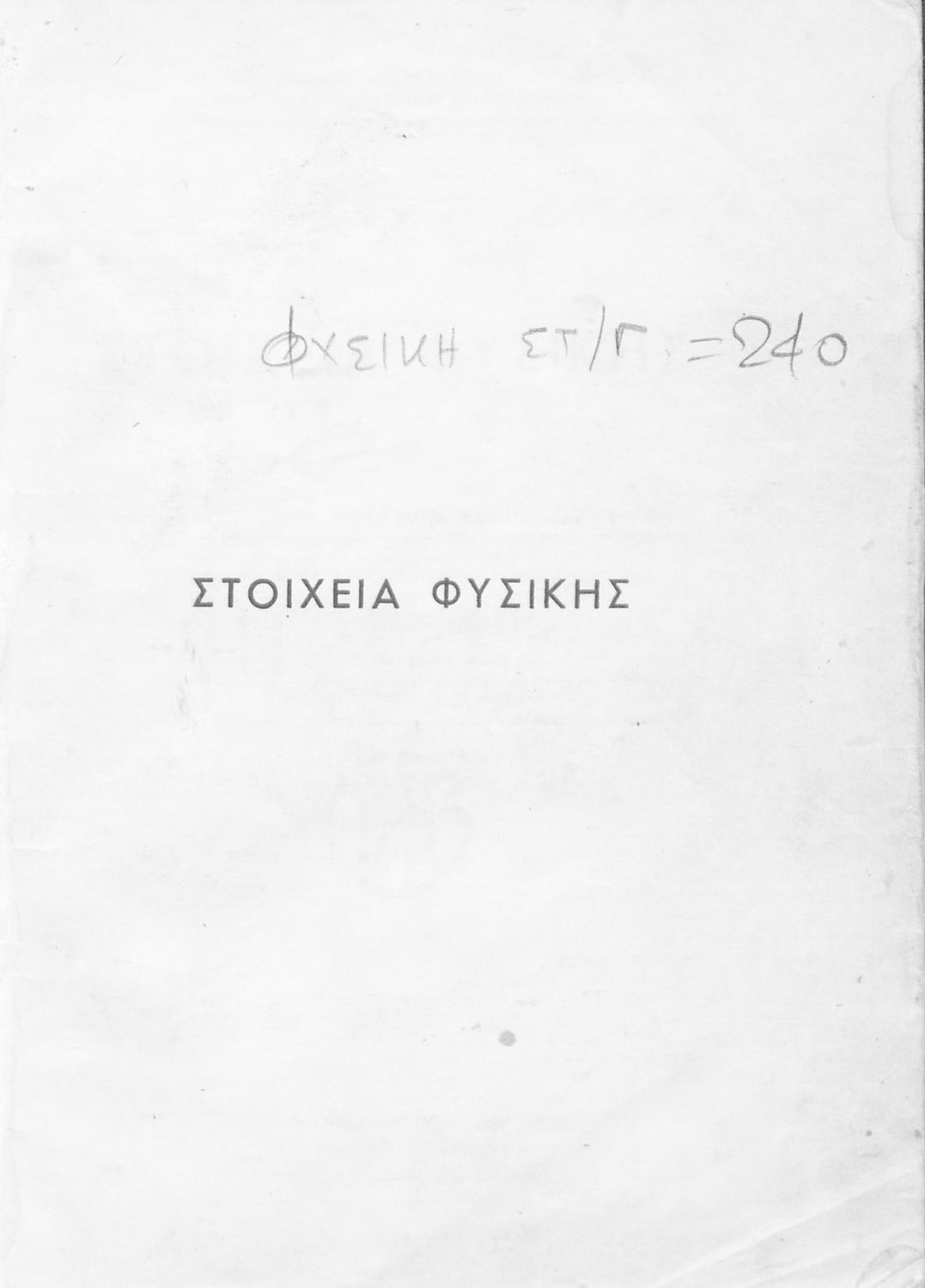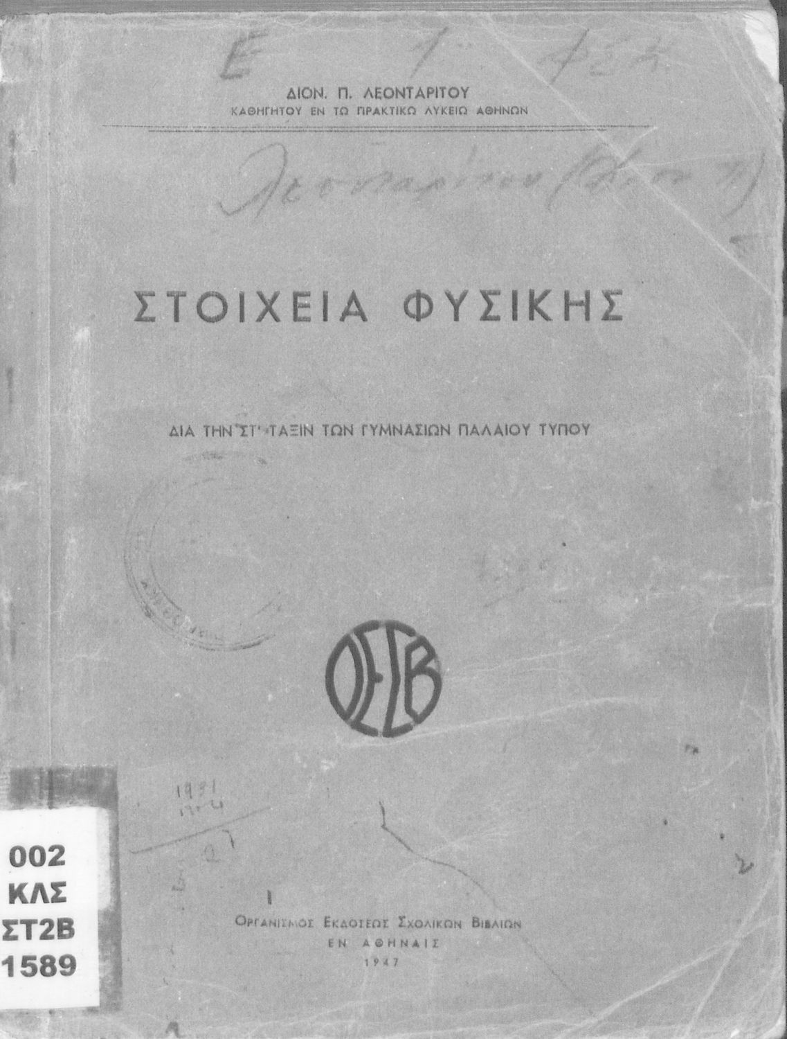 Κωδικός αναγνώρισης: 03-20557686 Τίτλος: Στοιχεία φυσικής δια την ΣΤ΄ τάξιν των Γυμνασίων παλαιού τύπου Συγγραφέας: Διον. Π. Λεονταρίτης Μέγεθος και υπόστρωμα: Σχολικό εγχειρίδιο, 20εκ., μαλακό εξώφυλλο, 280 σελίδες. Σκίτσα (ασπρόμαυρα). |