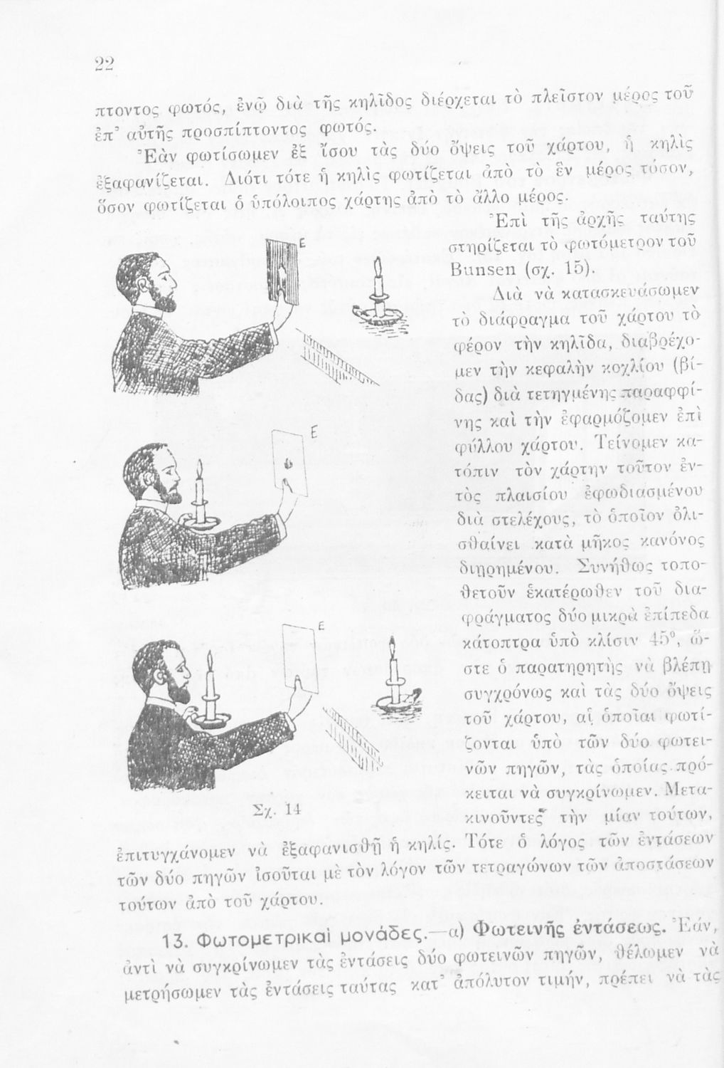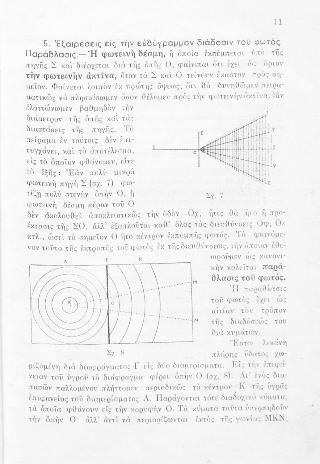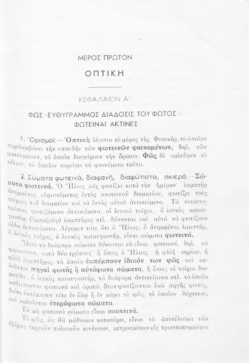 Βαθμίδα εκπαίδευσης: Δευτεροβάθμια Τάξη: ΣΤ' Γυμνασίου Μάθημα: Φυσική Γλώσσα: Καθαρεύουσα Παρουσίαση περιεχομένου: Σχολικό εγχειρίδιο της ΣΤ΄ Γυμνασίου για το μάθημα της Φυσικής. Το εγχειρίδιο περιλαμβάνει τα βασικά στοιχεία της οπτικής (ταχύτητα του φωτός, φωτομετρία, ανάκλαση του φωτός, κάτοπτρα, όραση, φωτεινά κύματα), την θεματική του ηλεκτρισμού (ηλεκτρική ενέργεια, αντιστάσεις, μαγνητικό πεδίο, επαγωγή, εναλλασσόμενα ρεύματα) και τέλος, το κεφάλαιο της ηλεκτροστατικής (ηλεκτροδυναμική, πυκνότητα, ηλεκτρικό πεδίο, αγωγοί, μονωτές). |