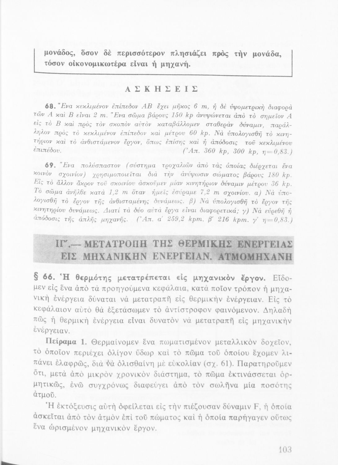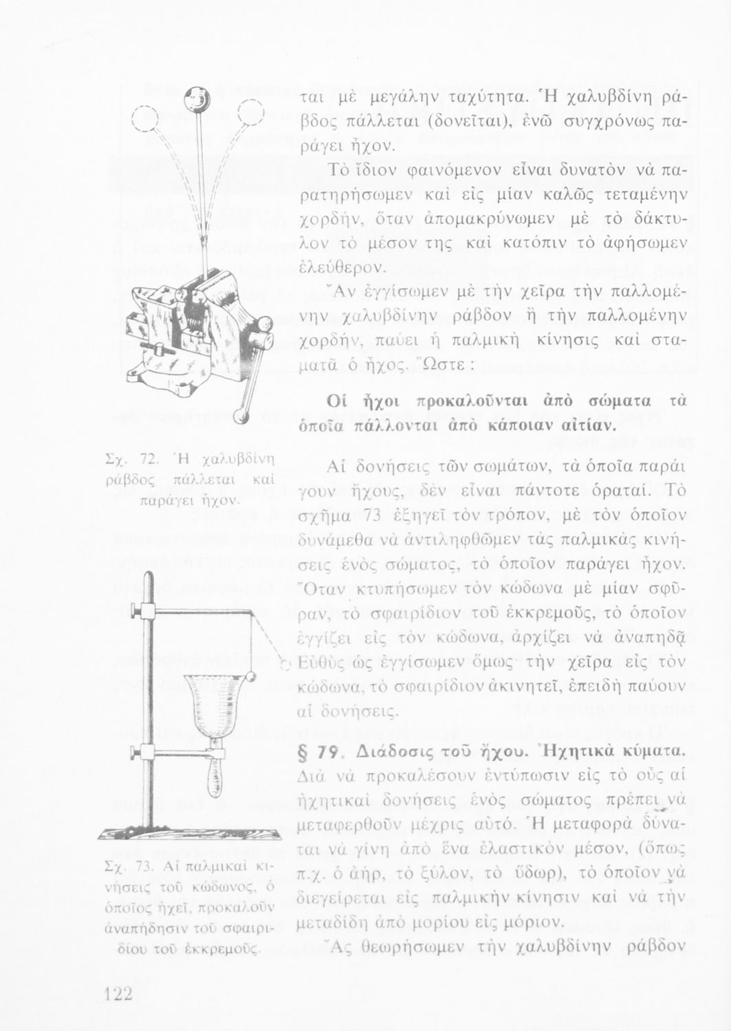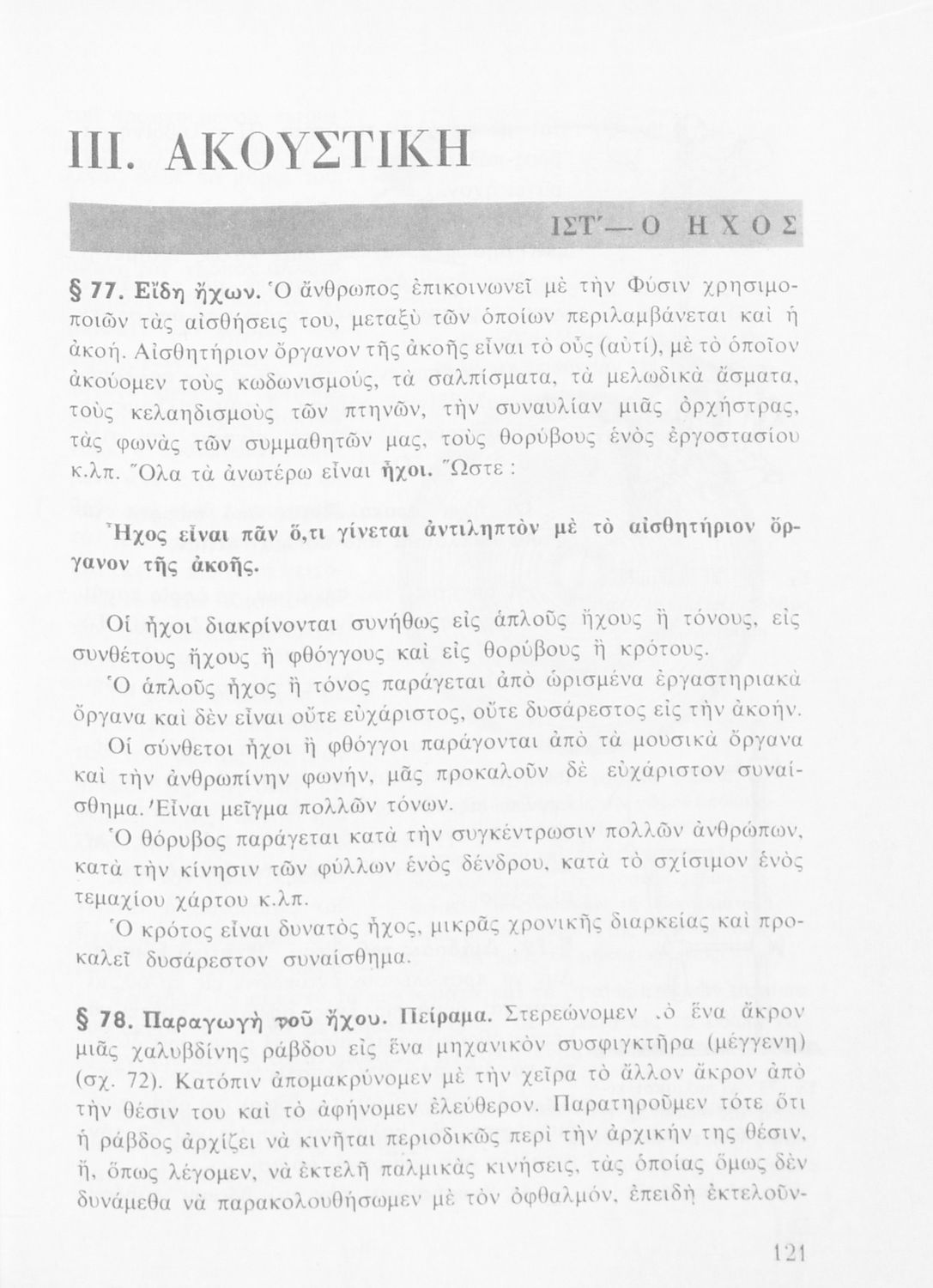 Βαθμίδα εκπαίδευσης: Δευτεροβάθμια Τάξη: Γ' Γυμνασίου Μάθημα: Φυσική Γλώσσα: Απλή καθαρεύουσα Παρουσίαση περιεχομένου: Σχολικό εγχειρίδιο Φυσικής της Γ' Γυμνασίου. Το βιβλίο προσφέρει μια γενική εικόνα των διαφόρων πεδίων της επιστήμης της Φυσικής. Αρχίζοντας με ζητήματα της μηχανικής, τα πρώτα τέσσερα κεφάλαια ασχολούνται με θέματα κίνησης των σωμάτων, το ρόλο της ενέργειας και των δυνάμεων οι οποίες αναπτύσσονται κατά τη διάρκεια της κίνησης και κρούσης των αντικειμένων. Στη συνέχεια περνάει στη θεματική του ηλεκτρισμού, των κυκλωμάτων, του εναλλασσόμενου ρεύματος και της ηλεκτρομαγνητικής θεωρίας. Στην τρίτη ενότητα, το βιβλίο ασχολείται με το ρόλο της θερμότητας και τις μεταβολές που επιφέρει στις ιδιότητες των αερίων. Στην τέταρτη ενότητα το βιβλίο παρουσιάζει ζητήματα ταλαντώσεων και μετάδοσης κυμάτων. Το βιβλίο τελειώνει παρουσιάζοντας την ειδική θεωρία της Σχετικότητας και τον μικρόκοσμο της Κβαντικής Φυσικής |