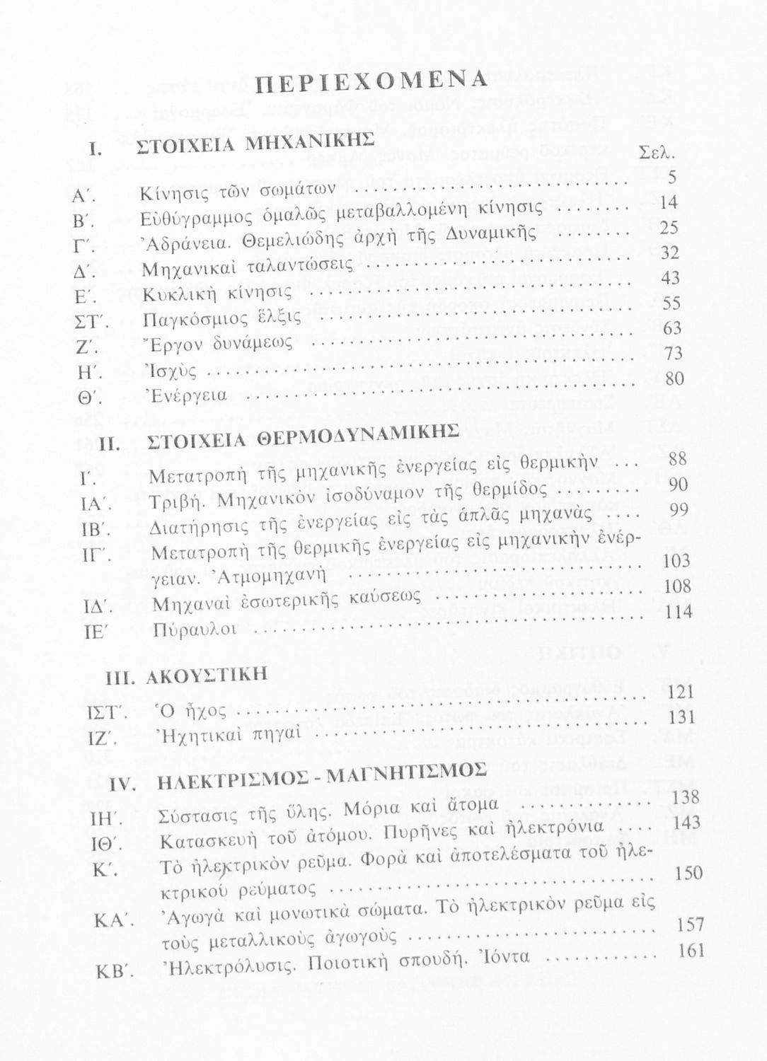 Σχολικό εγχειρίδιο Φυσικής της Γ' Γυμνασίου. Το βιβλίο προσφέρει μια γενική εικόνα των διαφόρων πεδίων της επιστήμης της Φυσικής. Αρχίζοντας με ζητήματα της μηχανικής, τα πρώτα τέσσερα κεφάλαια ασχολούνται με θέματα κίνησης των σωμάτων, το ρόλο της ενέργειας και των δυνάμεων οι οποίες αναπτύσσονται κατά τη διάρκεια της κίνησης και κρούσης των αντικειμένων. Στη συνέχεια περνάει στη θεματική του ηλεκτρισμού, των κυκλωμάτων, του εναλλασσόμενου ρεύματος και της ηλεκτρομαγνητικής θεωρίας. Στην τρίτη ενότητα, το βιβλίο ασχολείται με το ρόλο της θερμότητας και τις μεταβολές που επιφέρει στις ιδιότητες των αερίων. Στην τέταρτη ενότητα το βιβλίο παρουσιάζει ζητήματα ταλαντώσεων και μετάδοσης κυμάτων. Το βιβλίο τελειώνει παρουσιάζοντας την ειδική θεωρία της Σχετικότητας και τον μικρόκοσμο της Κβαντικής Φυσικής