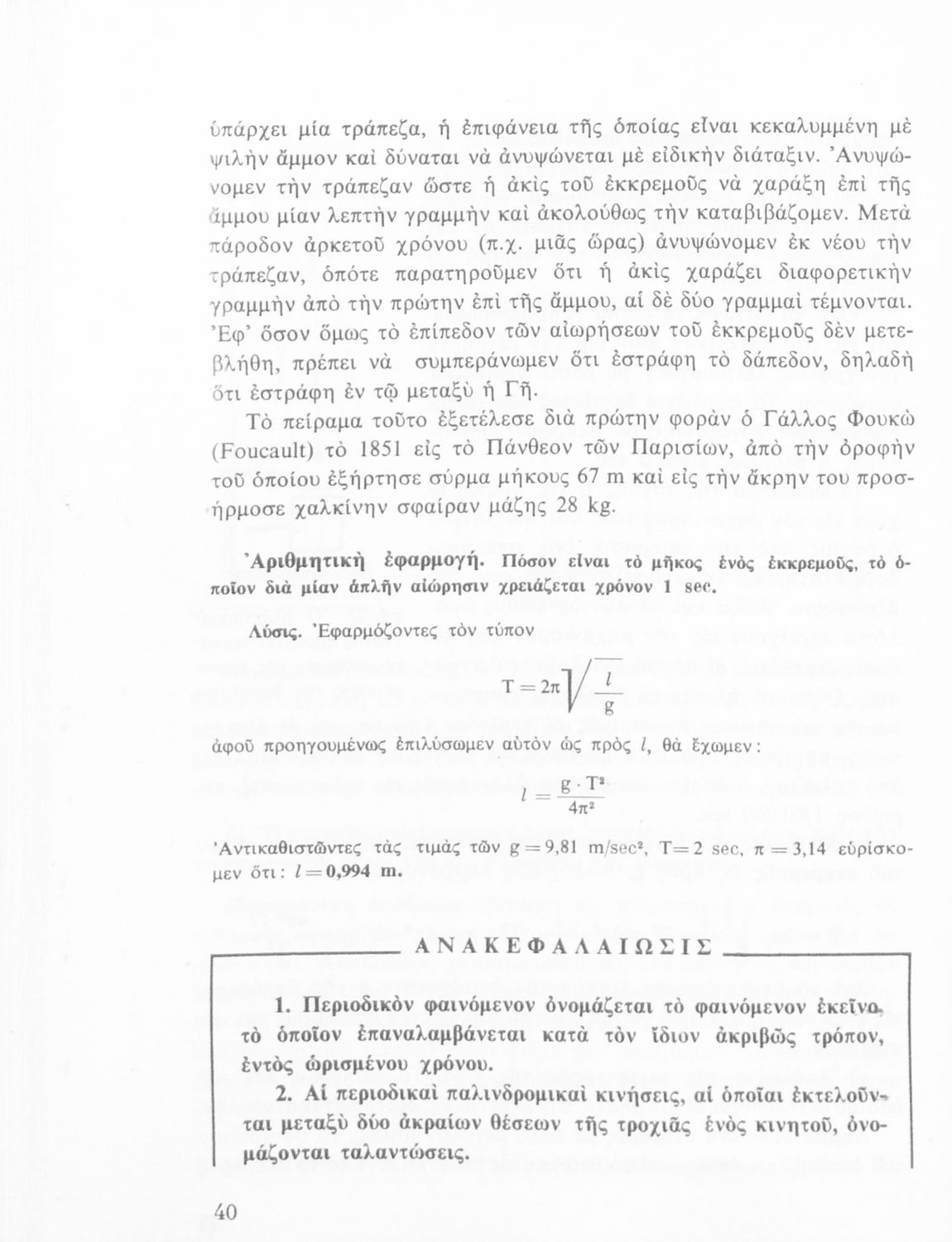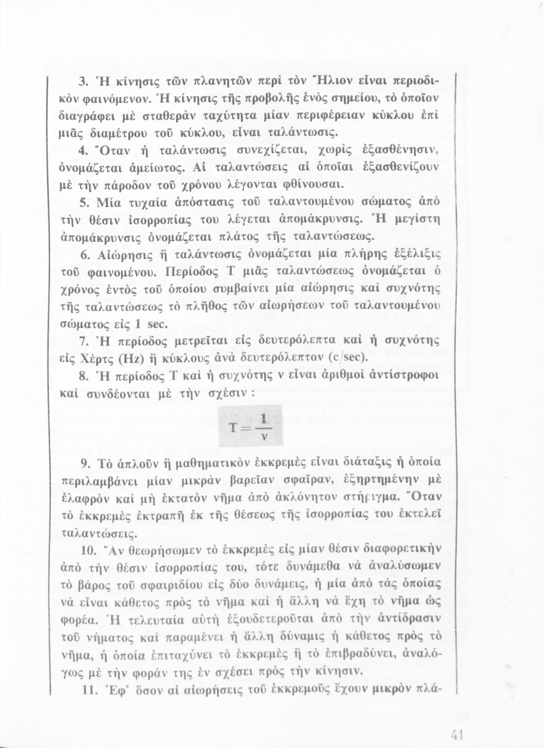 Βαθμίδα εκπαίδευσης: Δευτεροβάθμια Τάξη: Γ' Γυμνασίου Μάθημα: Φυσική Γλώσσα: Απλή καθαρεύουσα Παρουσίαση περιεχομένου: Σχολικό εγχειρίδιο Φυσικής της Γ' Γυμνασίου. Το βιβλίο προσφέρει μια γενική εικόνα των διαφόρων πεδίων της επιστήμης της Φυσικής. Αρχίζοντας με ζητήματα της μηχανικής, τα πρώτα τέσσερα κεφάλαια ασχολούνται με θέματα κίνησης των σωμάτων, το ρόλο της ενέργειας και των δυνάμεων οι οποίες αναπτύσσονται κατά τη διάρκεια της κίνησης και κρούσης των αντικειμένων. Στη συνέχεια περνάει στη θεματική του ηλεκτρισμού, των κυκλωμάτων, του εναλλασσόμενου ρεύματος και της ηλεκτρομαγνητικής θεωρίας. Στην τρίτη ενότητα, το βιβλίο ασχολείται με το ρόλο της θερμότητας και τις μεταβολές που επιφέρει στις ιδιότητες των αερίων. Στην τέταρτη ενότητα το βιβλίο παρουσιάζει ζητήματα ταλαντώσεων και μετάδοσης κυμάτων. Το βιβλίο τελειώνει παρουσιάζοντας την ειδική θεωρία της Σχετικότητας και τον μικρόκοσμο της Κβαντικής Φυσικής |