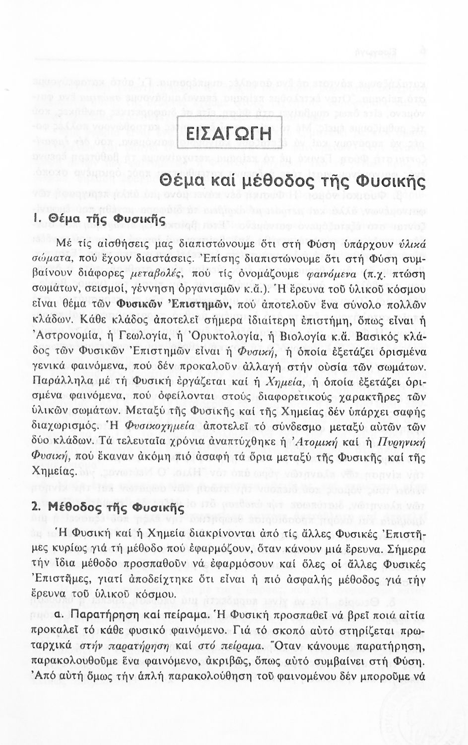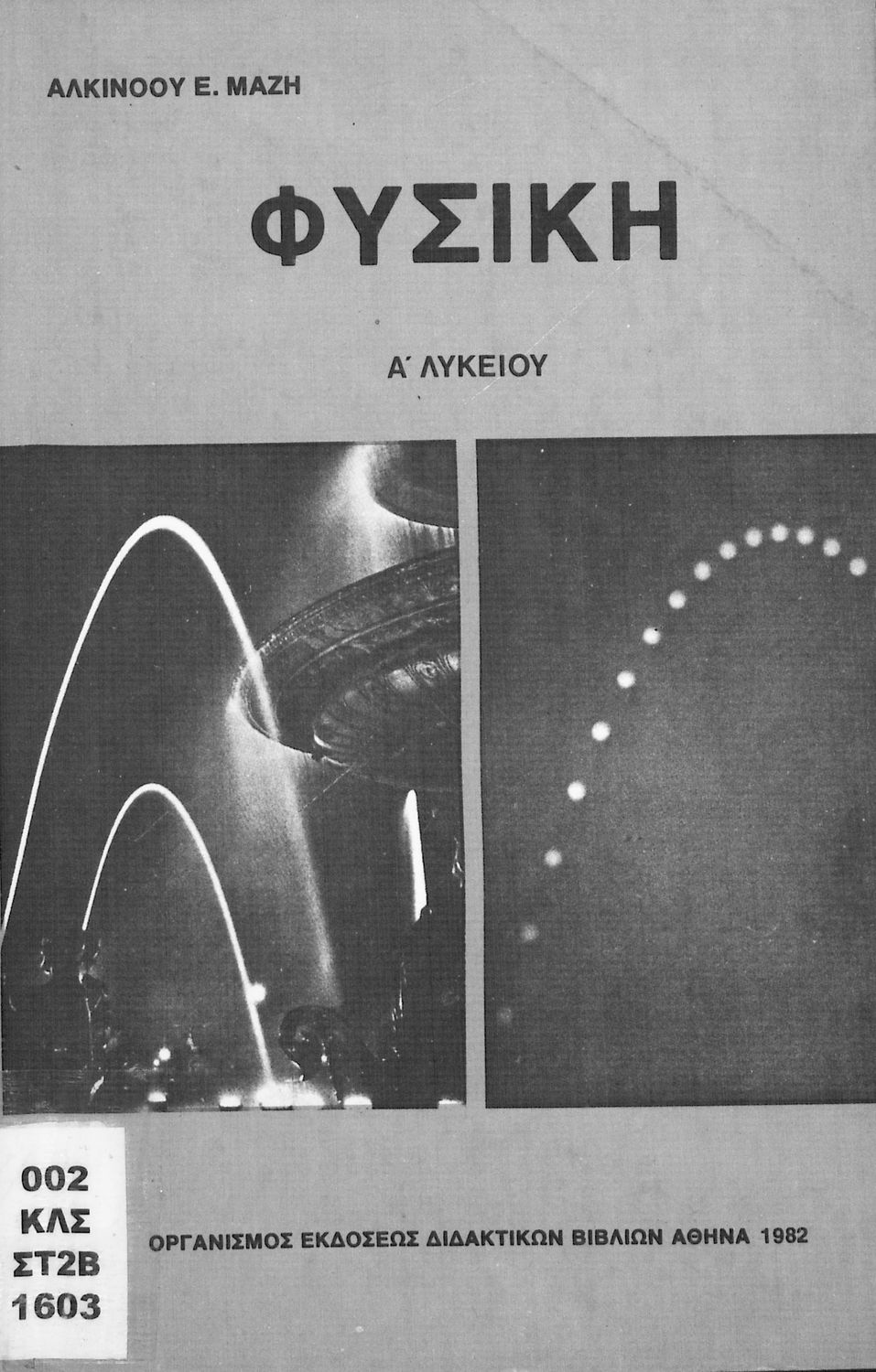 Σχολικό Εγχειρίδιο Φυσικής της Α' Λυκείου. Το βιβλίο προσφέρει μια γενική εικόνα των διαφόρων πεδίων της Φυσικής. Ξεκινώντας με ζητήματα μηχανικής, τα πρώτα τέσσερα κεφάλαια ασχολούνται με θέματα κίνησης των σωμάτων, το ρόλο της ενέργειας και των δυνάμεων οι οποίες αναπτύσσονται κατά τη διάρκεια κίνησης και κρούσης αντικειμένων. Στη συνέχεια εξετάζεται το φαινόμενο του ηλεκτρισμού, των κυκλωμάτων, του εναλλασσόμενου ρεύματος και της ηλεκτρομαγνητικής θεωρίας. Στο τρίτο μέρος, το βιβλίο ασχολείται με το ρόλο της θερμότητας και τις μεταβολές που έχει στις ιδιότητες των αερίων. Στο τέταρτο μέρος παρουσιάζονται ζητήματα ταλαντώσεων και μετάδοσης κυμάτων. Το βιβλίο τελειώνει με την ειδική θεωρία της Σχετικότητας και τον μικρόκοσμο της Κβαντικής Φυσικής