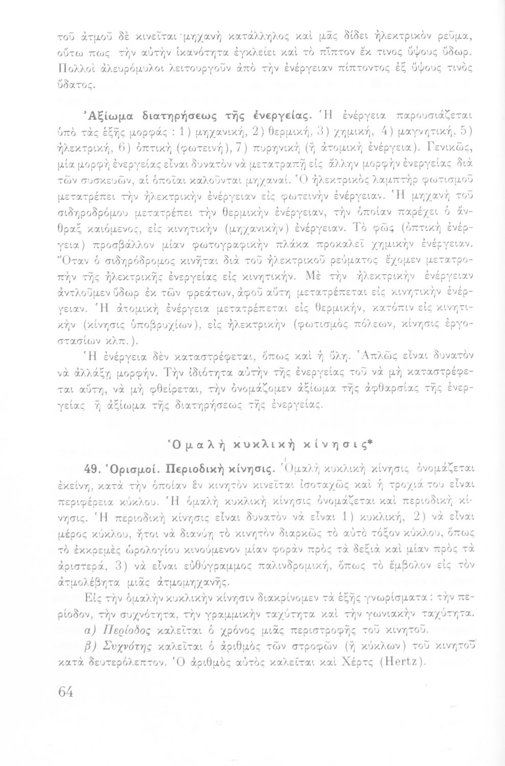 Βαθμίδα εκπαίδευσης: Δευτεροβάθμια Τάξη: Β' Γυμνασίου Μάθημα: Φυσική Γλώσσα: Απλή καθαρεύουσα Παρουσίαση περιεχομένου: Σχολικό εγχειρίδιο Φυσικής για τους μαθητές της Β΄ Γυμνασίου. Αρχίζοντας με θέματα μηχανικής, τα πρώτα τέσσερα κεφάλαια ασχολούνται με την κίνηση και την ενέργεια των σωμάτων. Στη συνέχεια ασχολείται με τον ηλεκτρισμό, τα κυκλώματα, την ηλεκτρομαγνητική θεωρία. Στο τρίτο μέρος ασχολείται με τη θερμότητα και στο τέταρτο με τις ταλαντώσεις των σωμάτων. Το βιβλίο κλείνει παρουσιάζοντας τη θεωρία της Σχετικότητας και το μικρόκοσμο της Κβαντικής Φυσικής. |