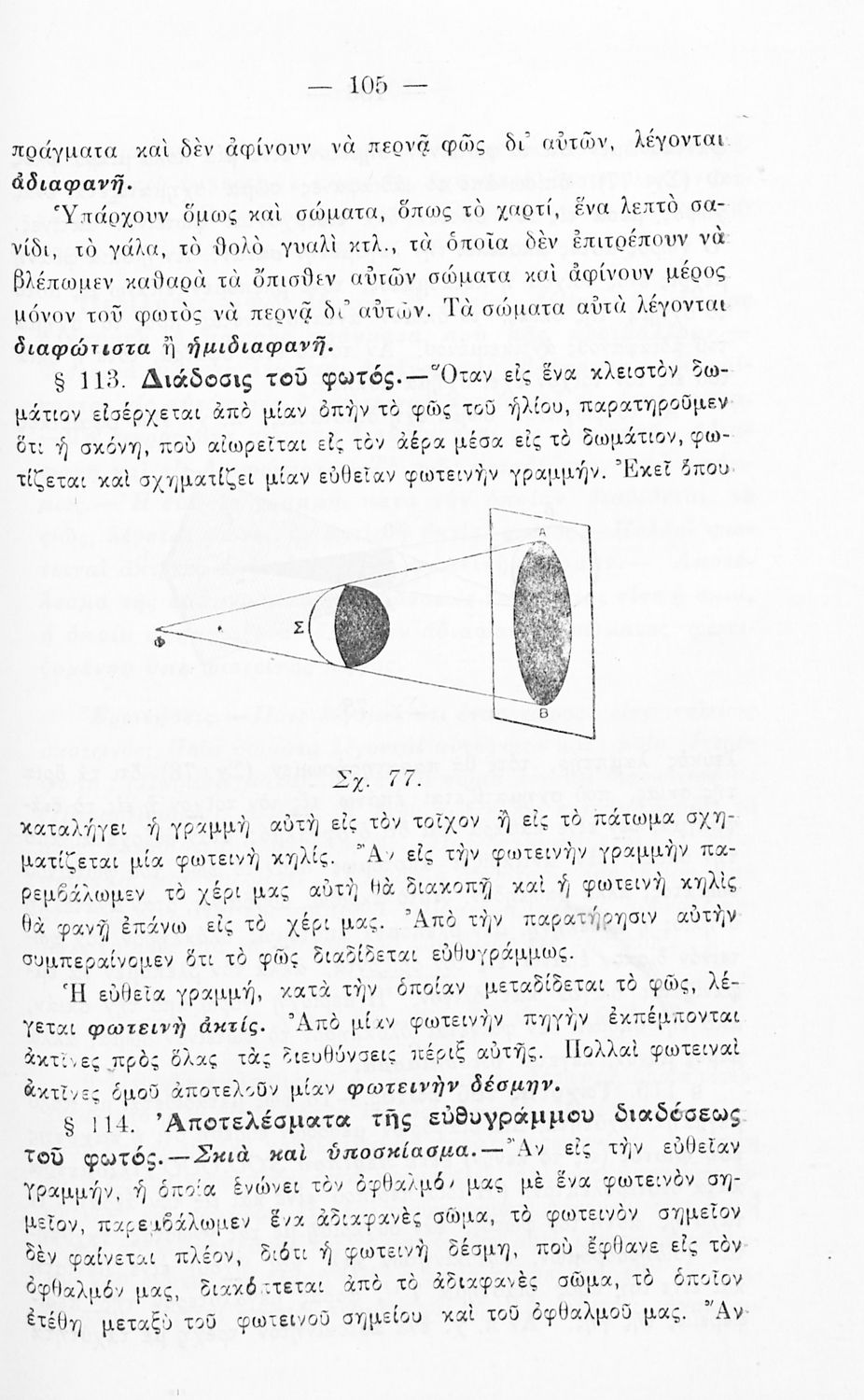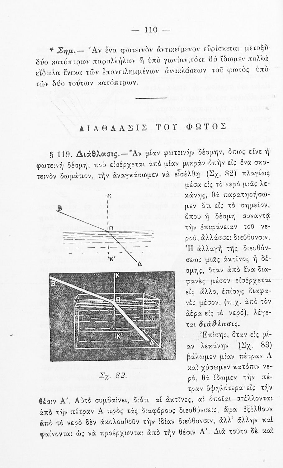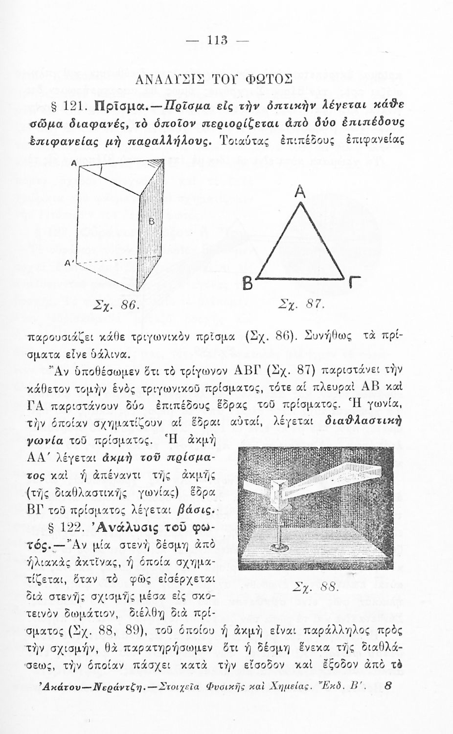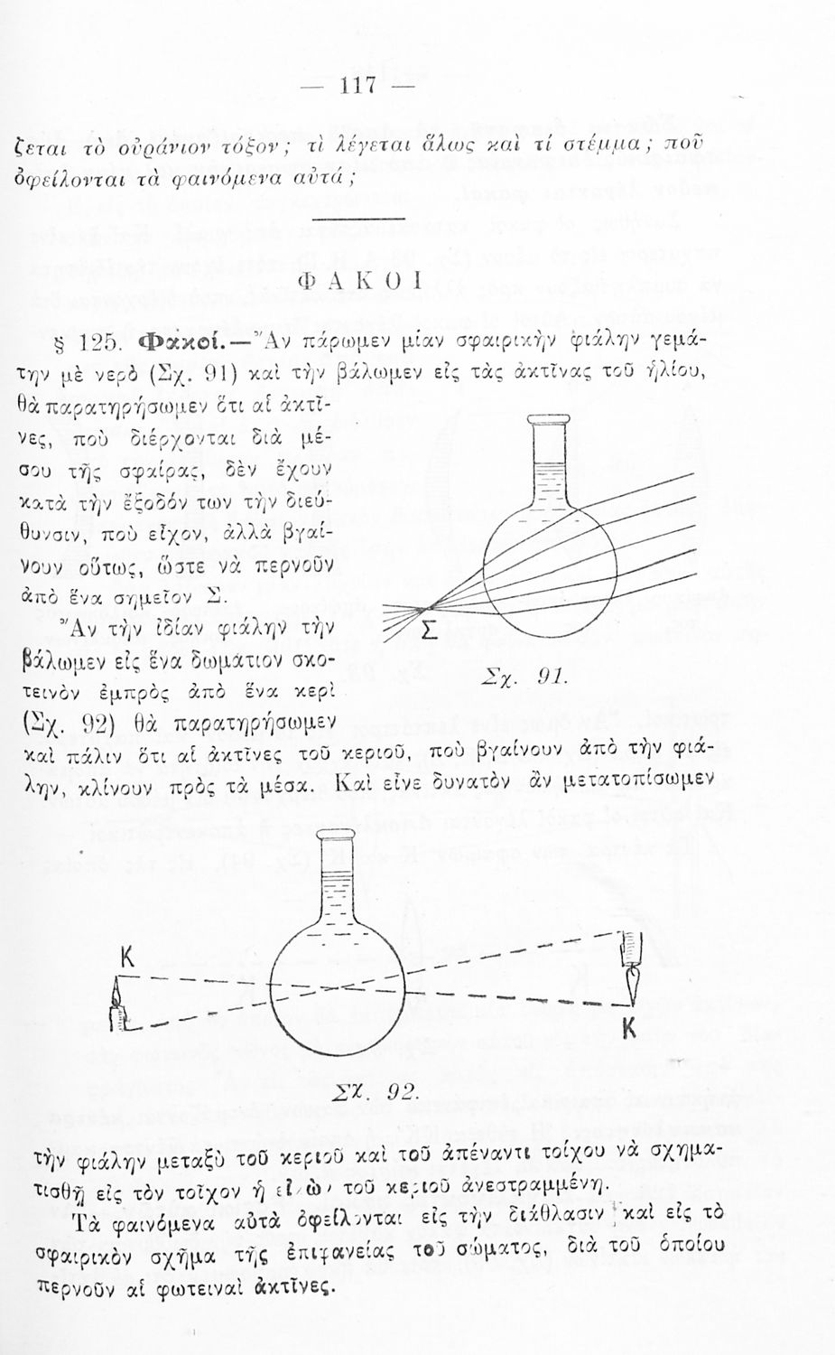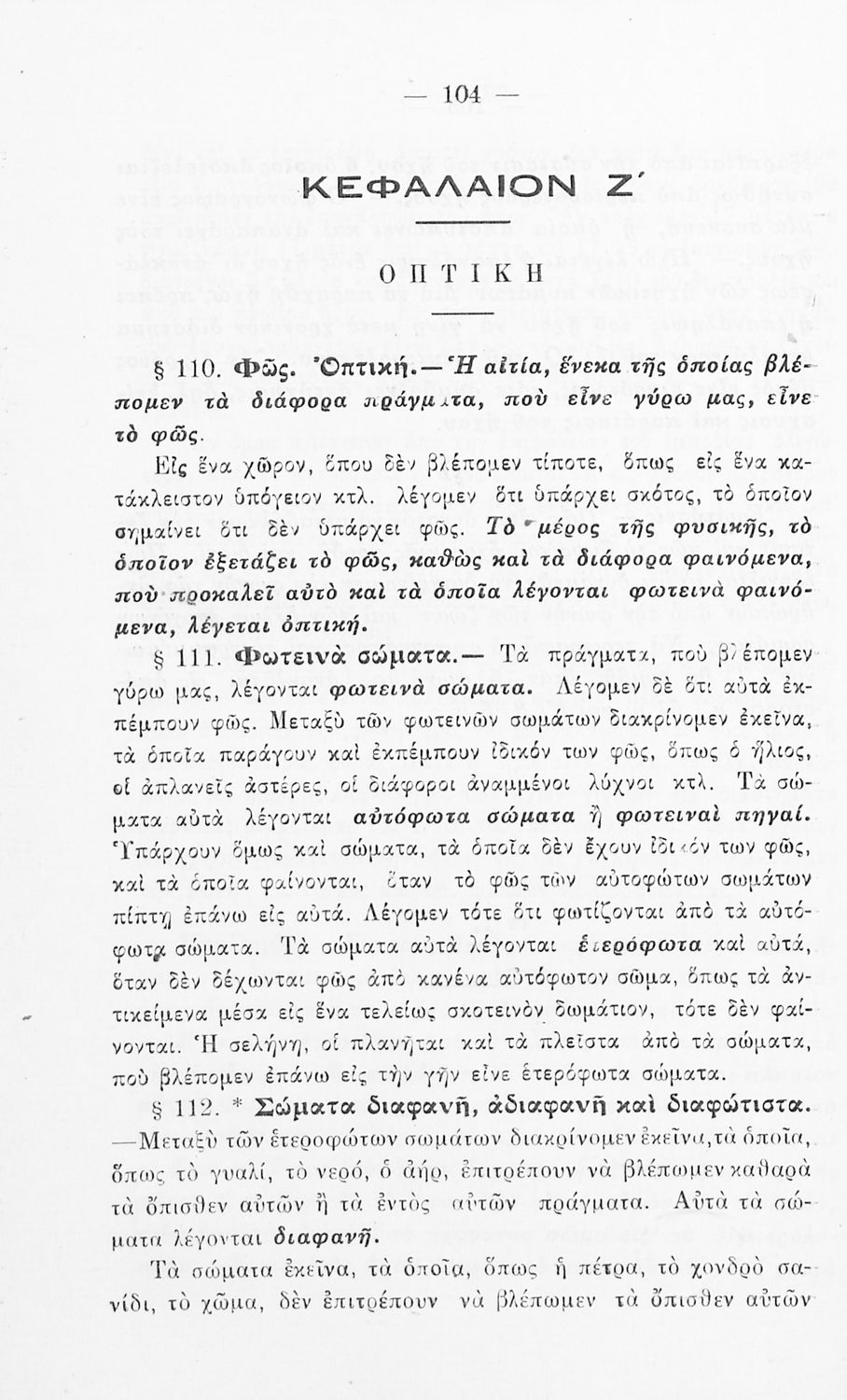 Παρουσίαση περιεχομένου: Το σύγγραμμα ήταν σχολικό εγχειρίδιο για το μάθημα της Φυσικής και της Χημείας στο Γυμνάσιο. Περιέχει βασικές γνώσεις για την φυσική επιστήμη, αναλύοντας φυσικά φαινόμενα, τις κινήσεις, τις δυνάμεις, την υδροστατική, τη θερμότητα, την ακουστική, τα φαινόμενα του μαγνητισμού και του ηλεκτρισμού. Όσον αφορά τη χημεία αναφέρεται στα μέταλλα και τα αμέταλλα, τα άλατα, τους υδρογονάνθρακες, τα σάκχαρα. Περιγράφονται οι ιδιότητές τους και οι χρήσεις τους.