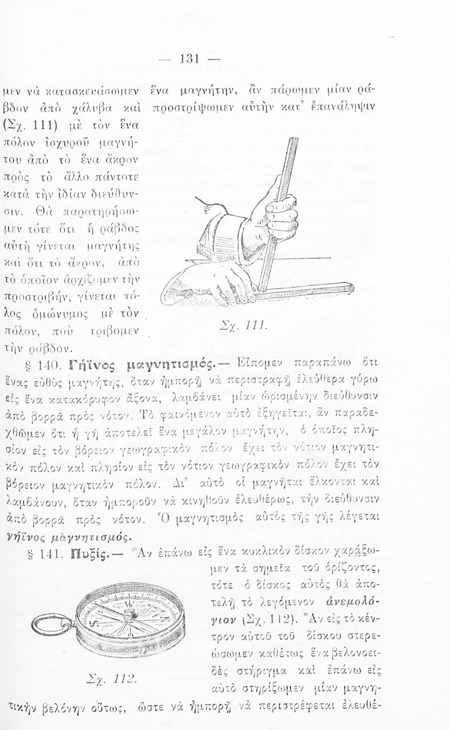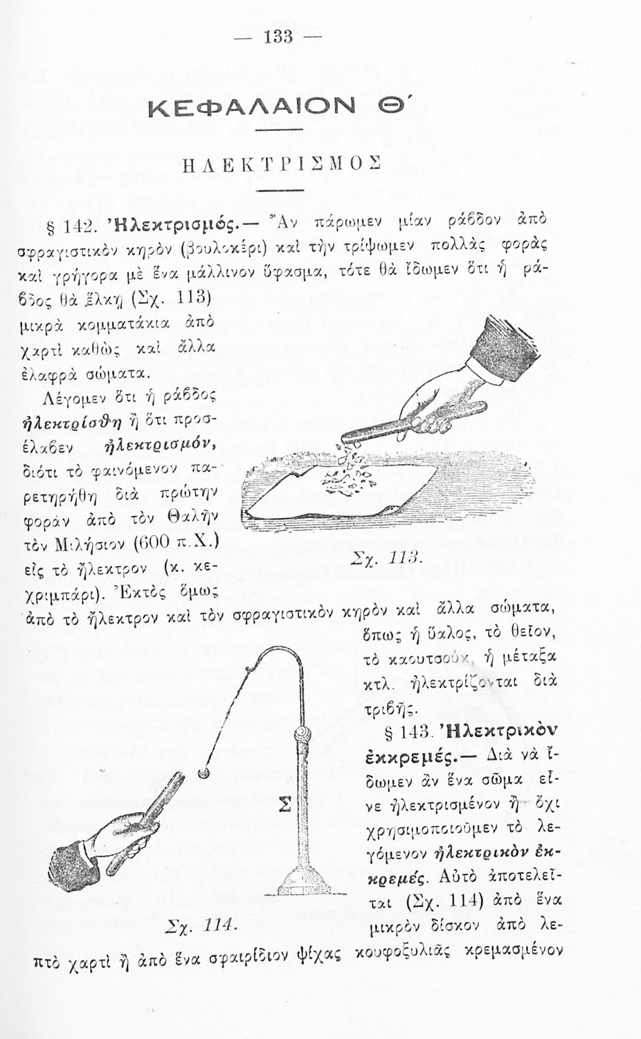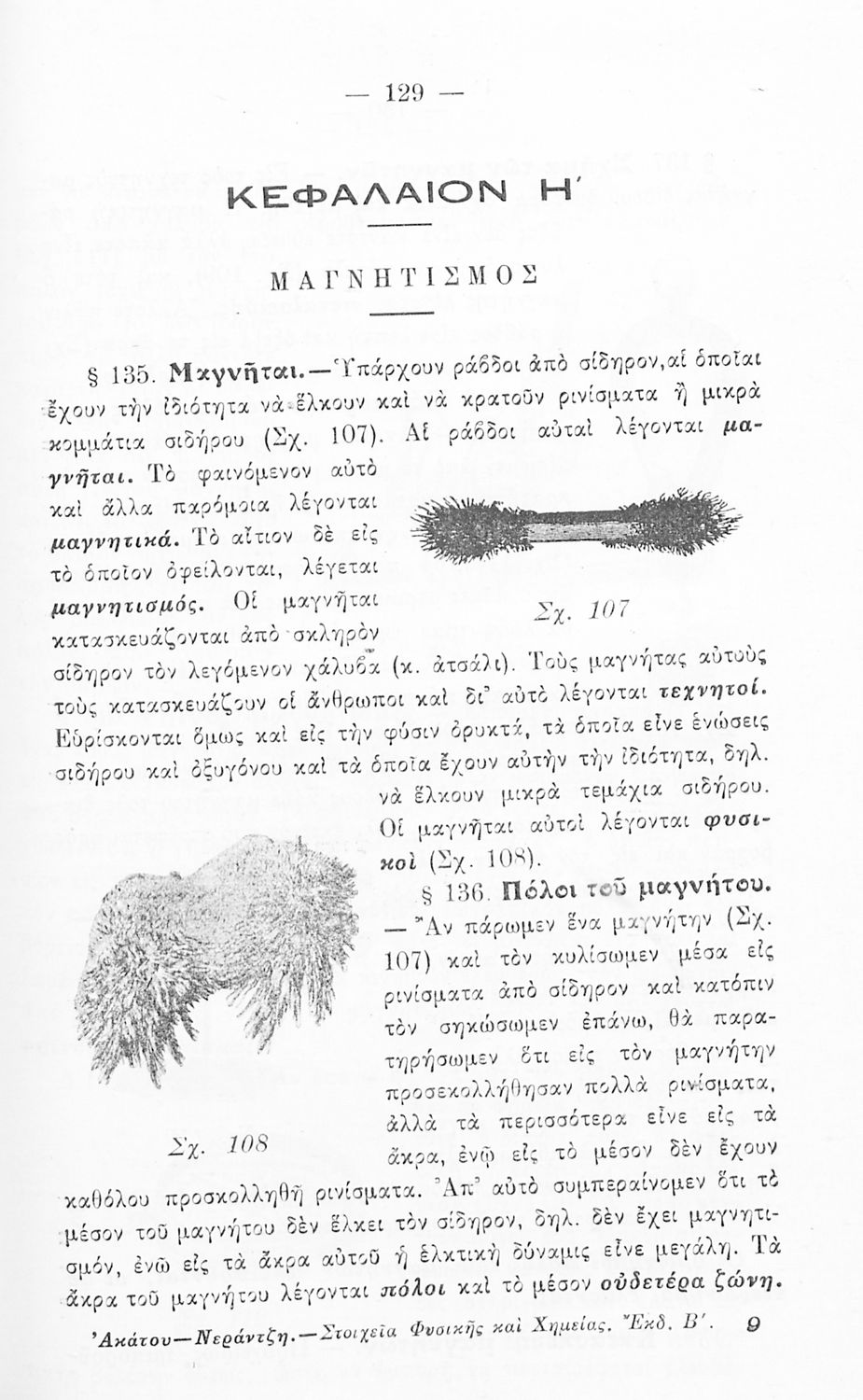 Παρουσίαση περιεχομένου: Το σύγγραμμα ήταν σχολικό εγχειρίδιο για το μάθημα της Φυσικής και της Χημείας στο Γυμνάσιο. Περιέχει βασικές γνώσεις για την φυσική επιστήμη, αναλύοντας φυσικά φαινόμενα, τις κινήσεις, τις δυνάμεις, την υδροστατική, τη θερμότητα, την ακουστική, τα φαινόμενα του μαγνητισμού και του ηλεκτρισμού. Όσον αφορά τη χημεία αναφέρεται στα μέταλλα και τα αμέταλλα, τα άλατα, τους υδρογονάνθρακες, τα σάκχαρα. Περιγράφονται οι ιδιότητές τους και οι χρήσεις τους.