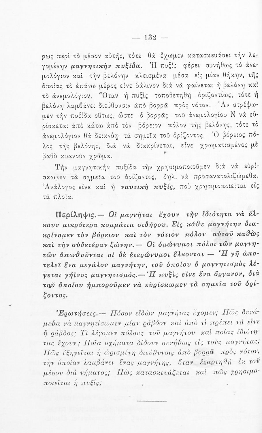 Το σύγγραμμα ήταν σχολικό εγχειρίδιο για το μάθημα της Φυσικής και της Χημείας στο Γυμνάσιο. Περιέχει βασικές γνώσεις για την φυσική επιστήμη, αναλύοντας φυσικά φαινόμενα, τις κινήσεις, τις δυνάμεις, την υδροστατική, τη θερμότητα, την ακουστική, τα φαινόμενα του μαγνητισμού και του ηλεκτρισμού. Όσον αφορά τη χημεία αναφέρεται στα μέταλλα και τα αμέταλλα, τα άλατα, τους υδρογονάνθρακες, τα σάκχαρα. Περιγράφονται οι ιδιότητές τους και οι χρήσεις τους.