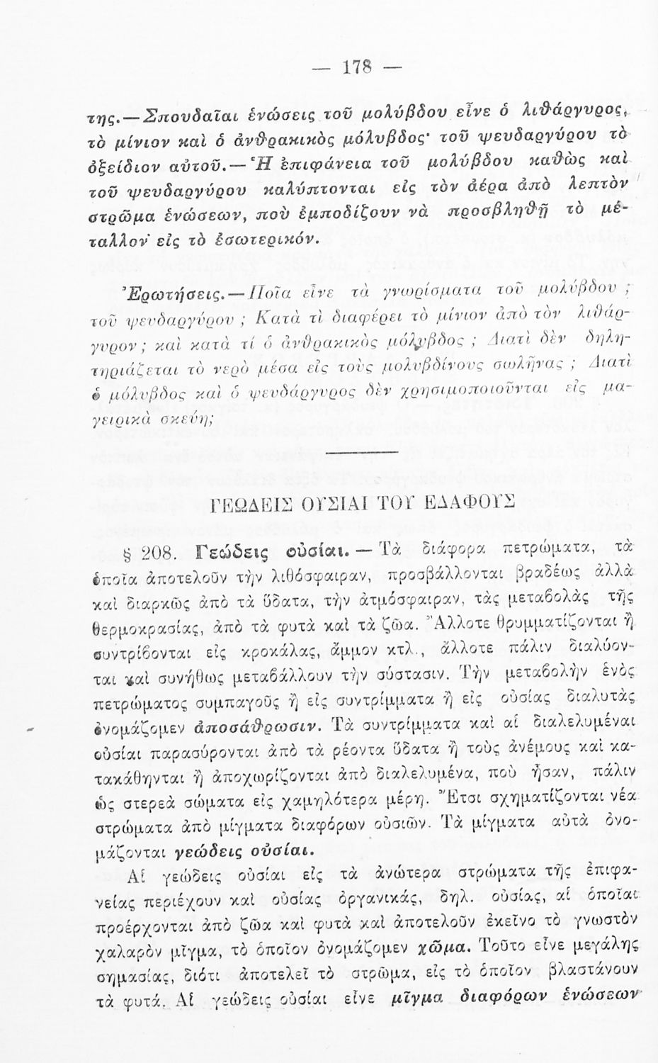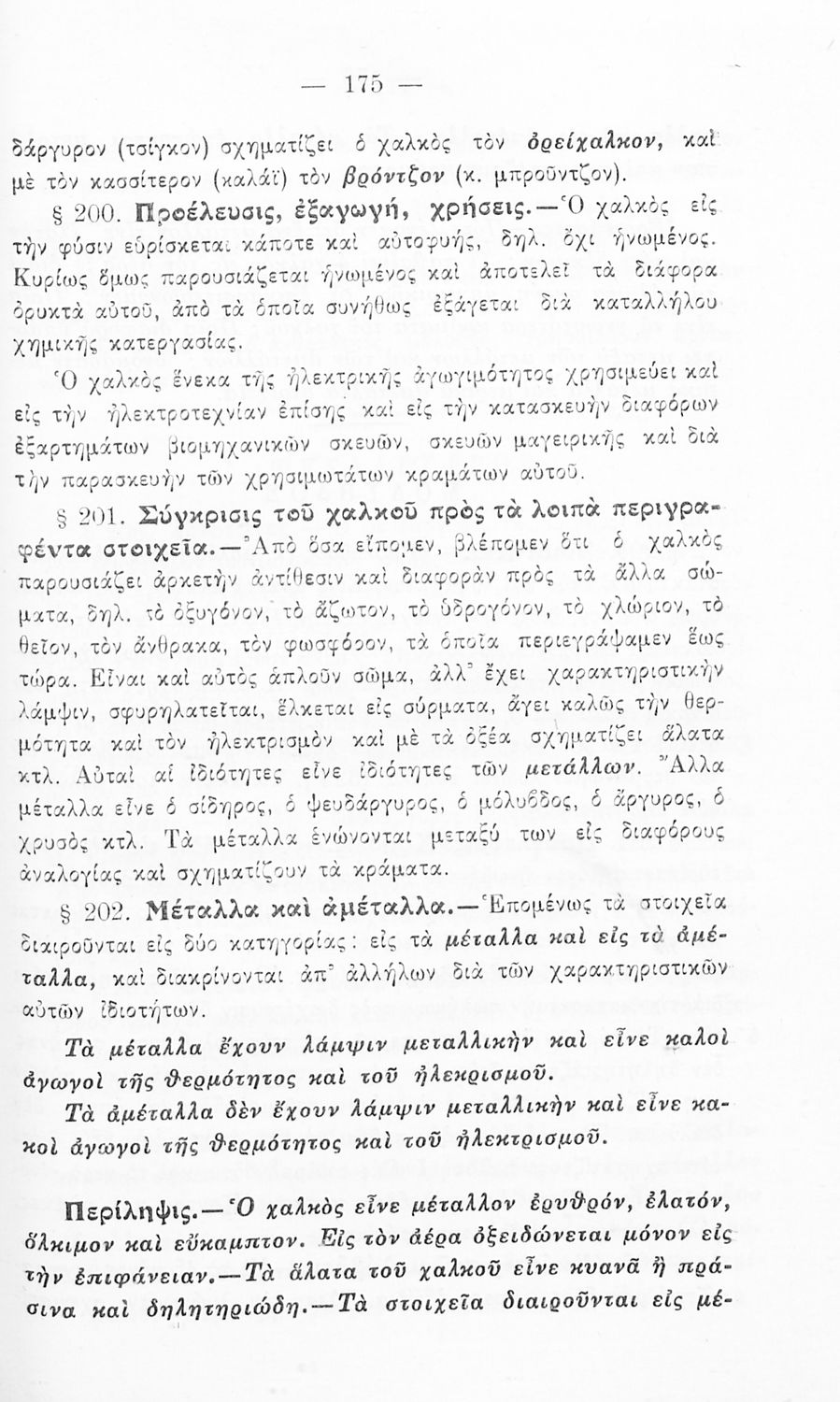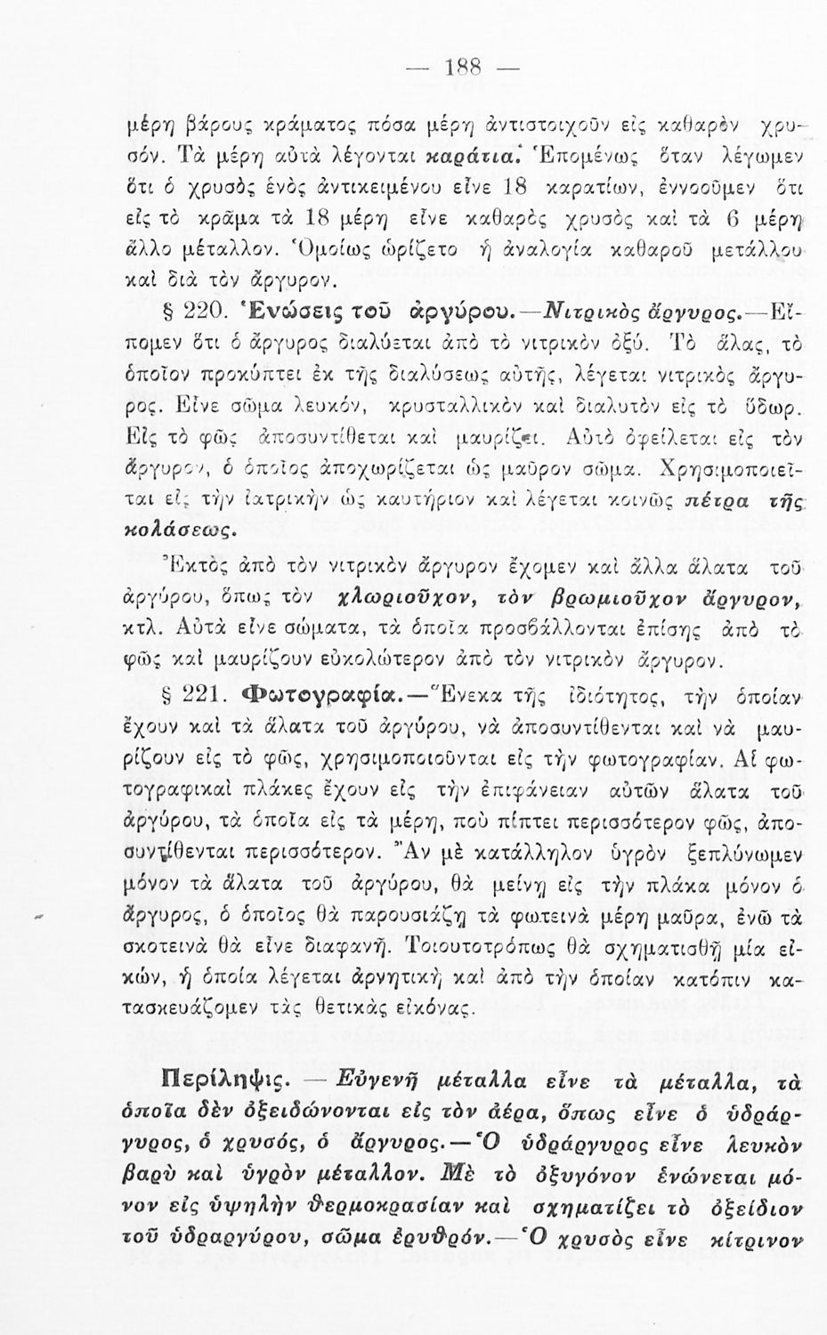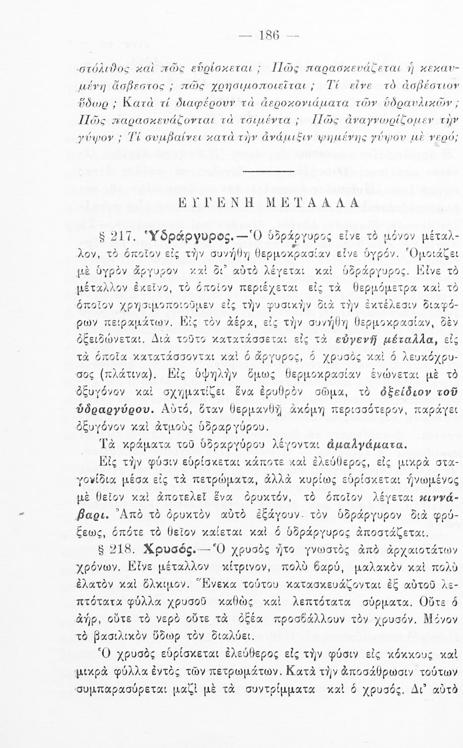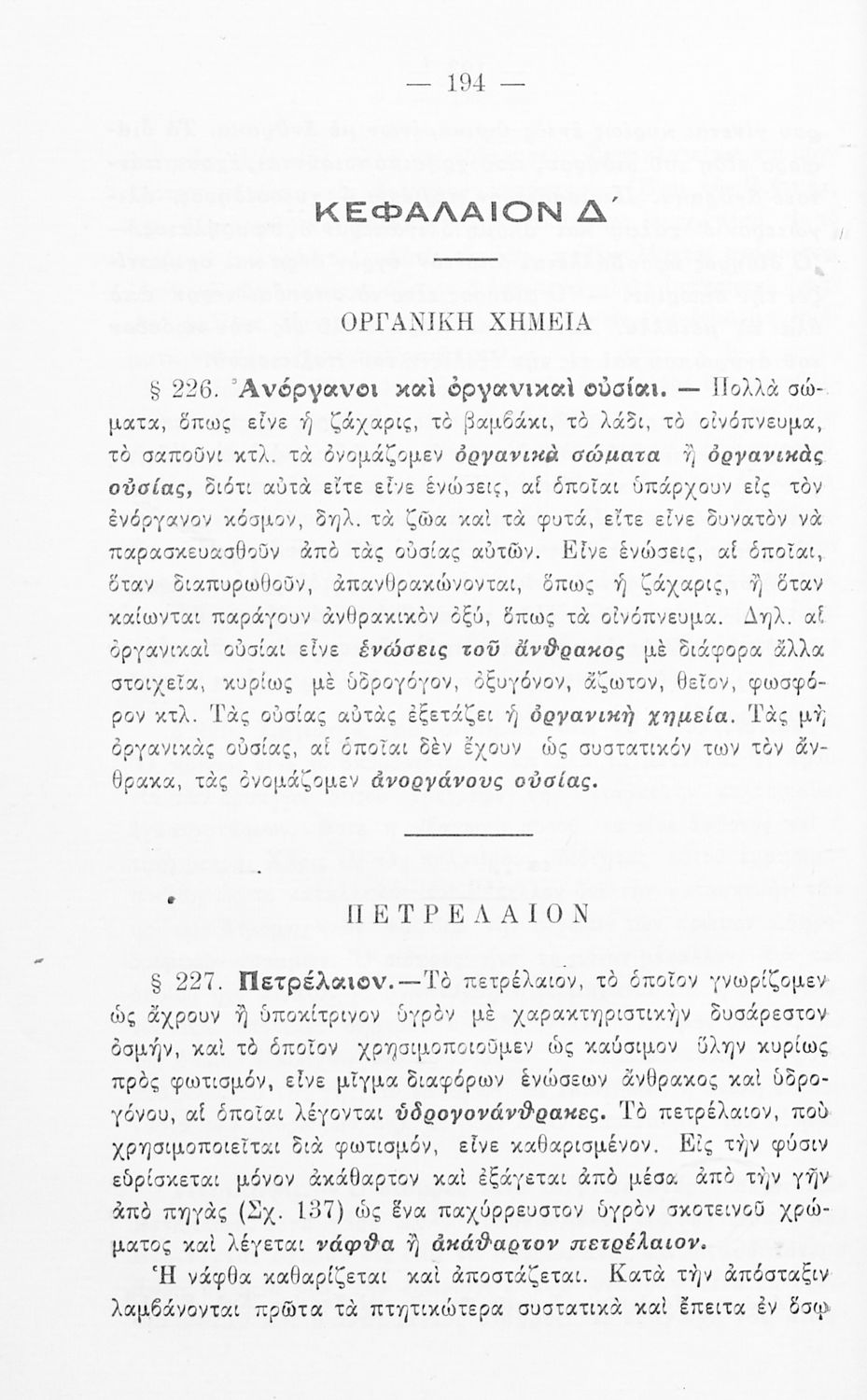 Παρουσίαση περιεχομένου: Το σύγγραμμα ήταν σχολικό εγχειρίδιο για το μάθημα της Φυσικής και της Χημείας στο Γυμνάσιο. Περιέχει βασικές γνώσεις για την φυσική επιστήμη, αναλύοντας φυσικά φαινόμενα, τις κινήσεις, τις δυνάμεις, την υδροστατική, τη θερμότητα, την ακουστική, τα φαινόμενα του μαγνητισμού και του ηλεκτρισμού. Όσον αφορά τη χημεία αναφέρεται στα μέταλλα και τα αμέταλλα, τα άλατα, τους υδρογονάνθρακες, τα σάκχαρα. Περιγράφονται οι ιδιότητές τους και οι χρήσεις τους.