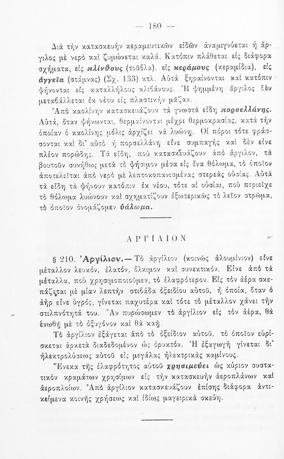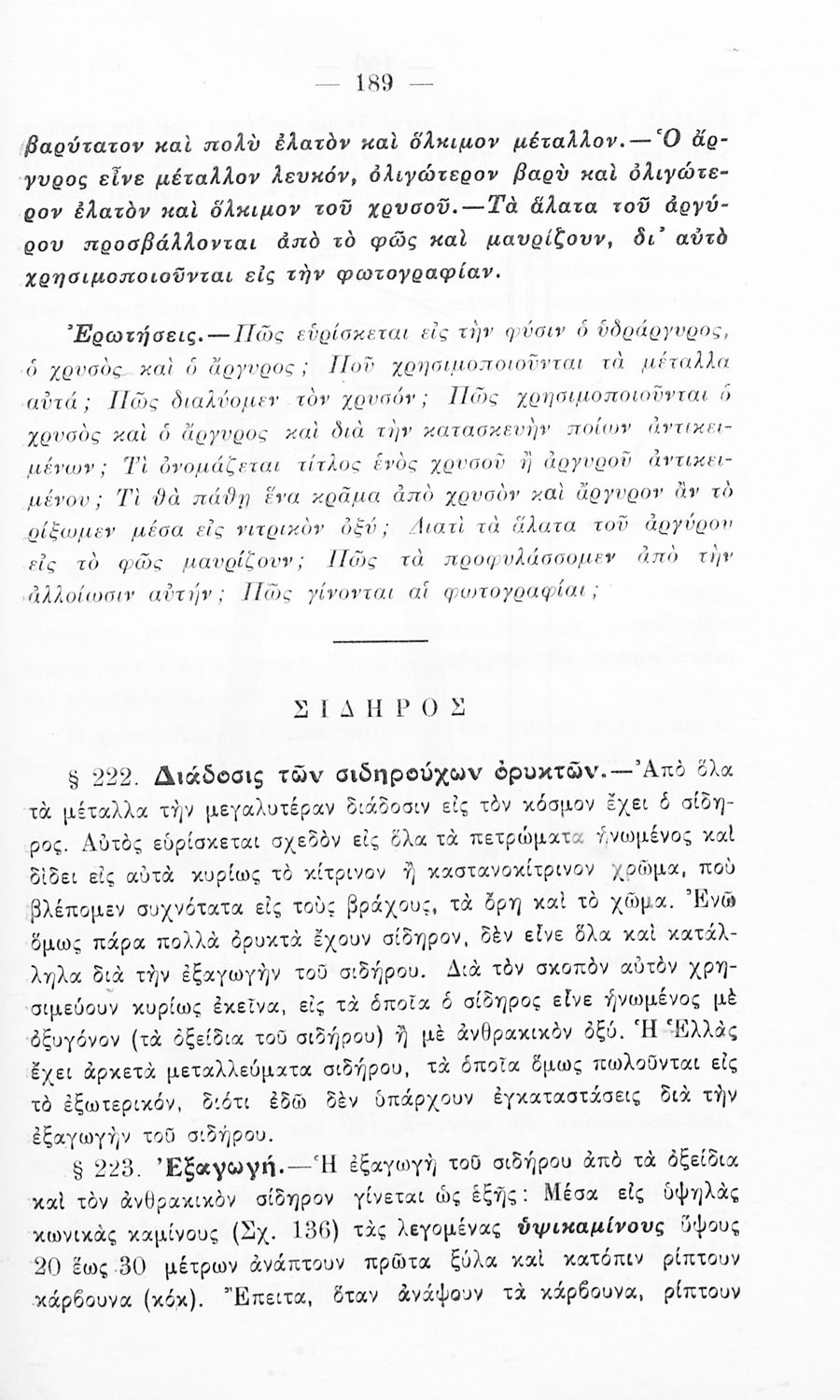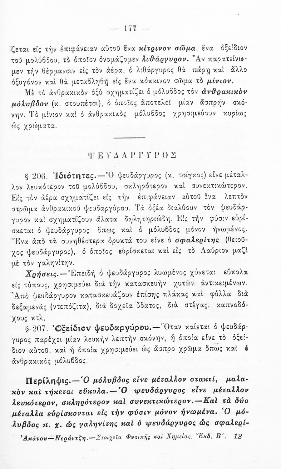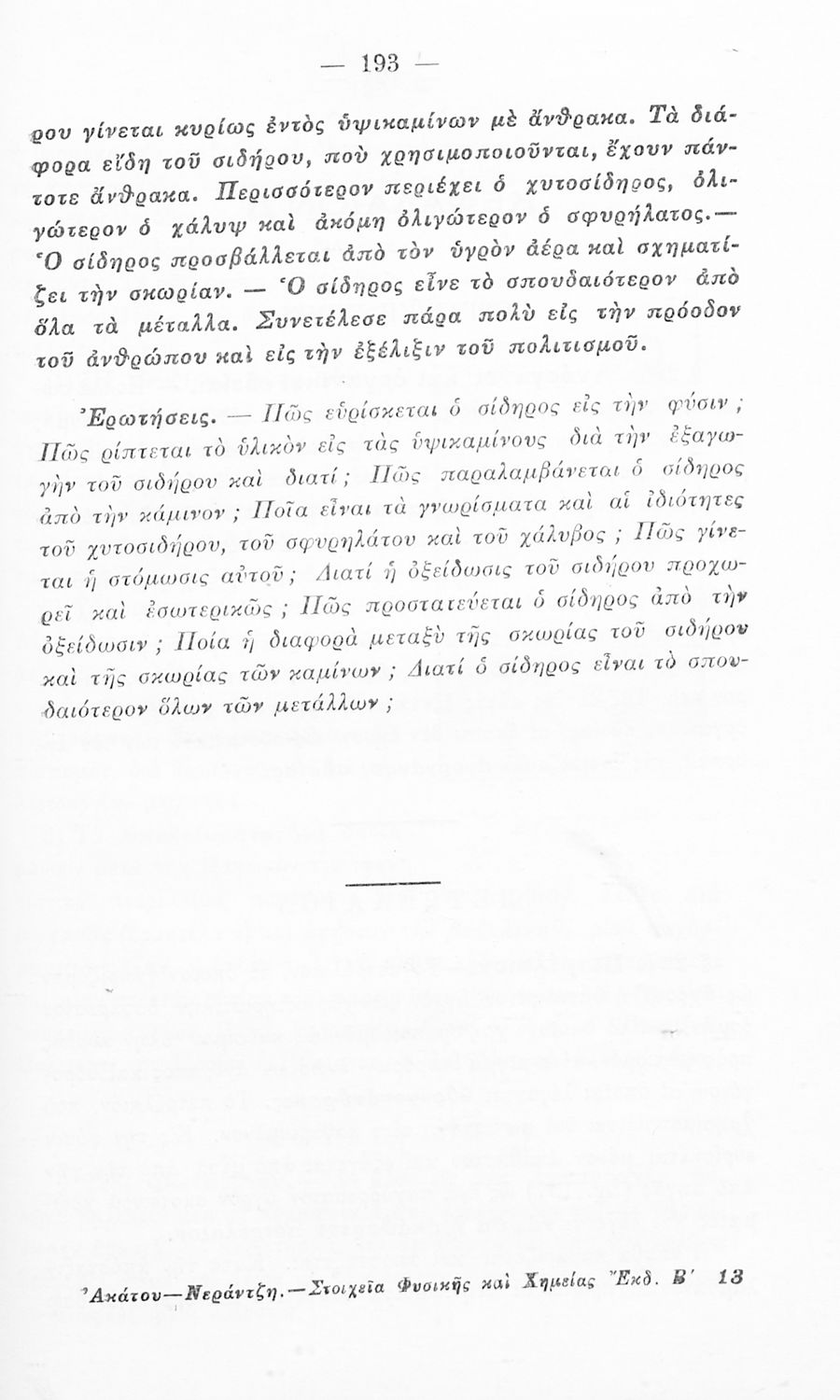 Παρουσίαση περιεχομένου: Το σύγγραμμα ήταν σχολικό εγχειρίδιο για το μάθημα της Φυσικής και της Χημείας στο Γυμνάσιο. Περιέχει βασικές γνώσεις για την φυσική επιστήμη, αναλύοντας φυσικά φαινόμενα, τις κινήσεις, τις δυνάμεις, την υδροστατική, τη θερμότητα, την ακουστική, τα φαινόμενα του μαγνητισμού και του ηλεκτρισμού. Όσον αφορά τη χημεία αναφέρεται στα μέταλλα και τα αμέταλλα, τα άλατα, τους υδρογονάνθρακες, τα σάκχαρα. Περιγράφονται οι ιδιότητές τους και οι χρήσεις τους.