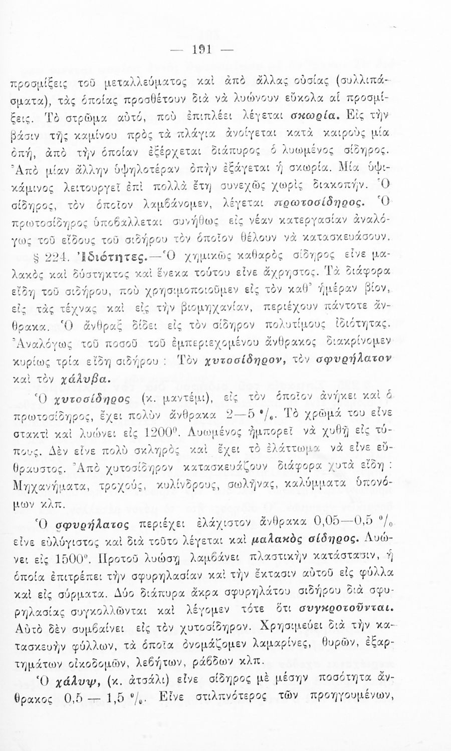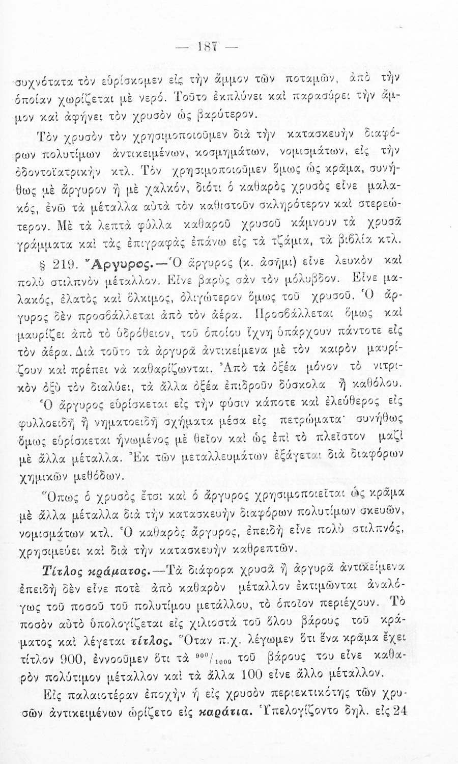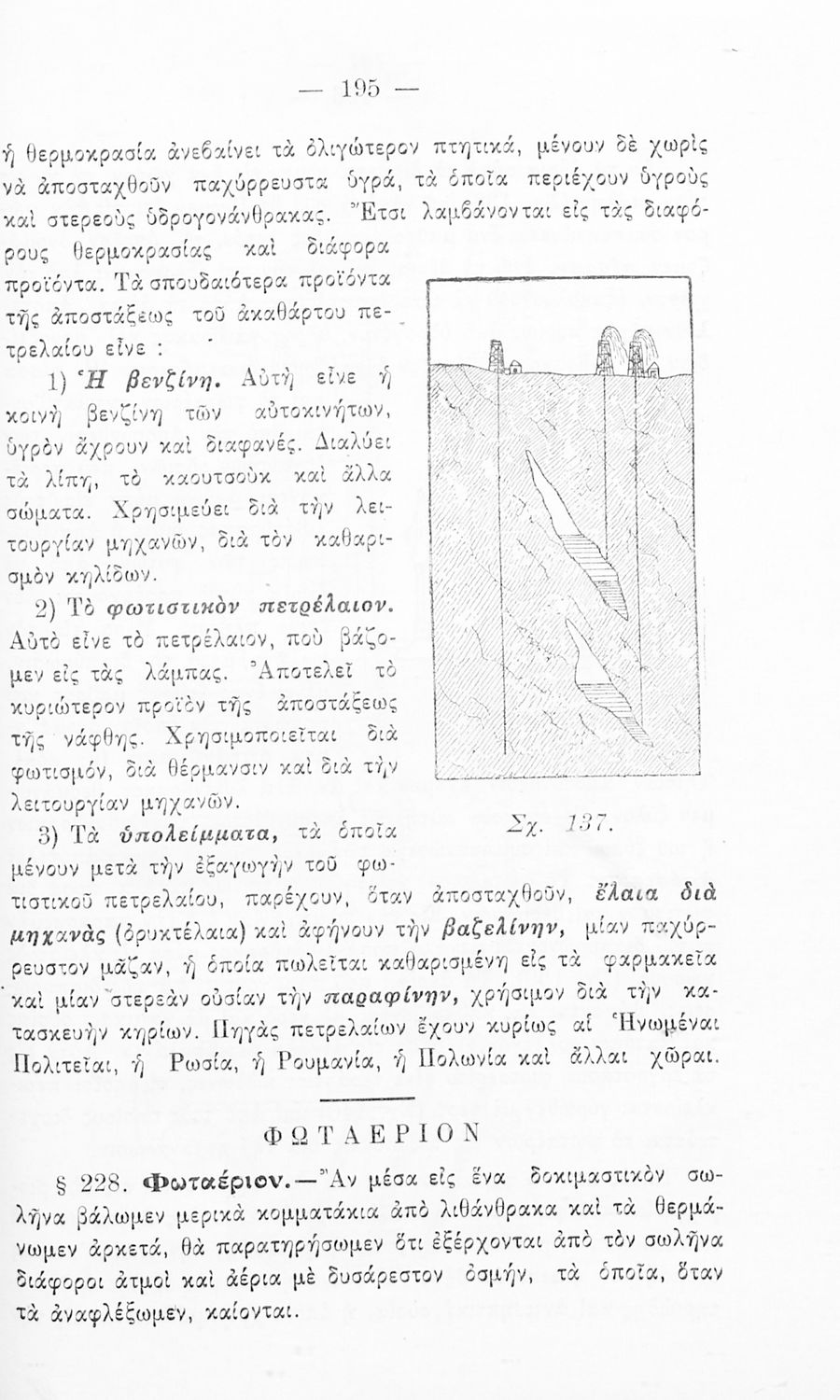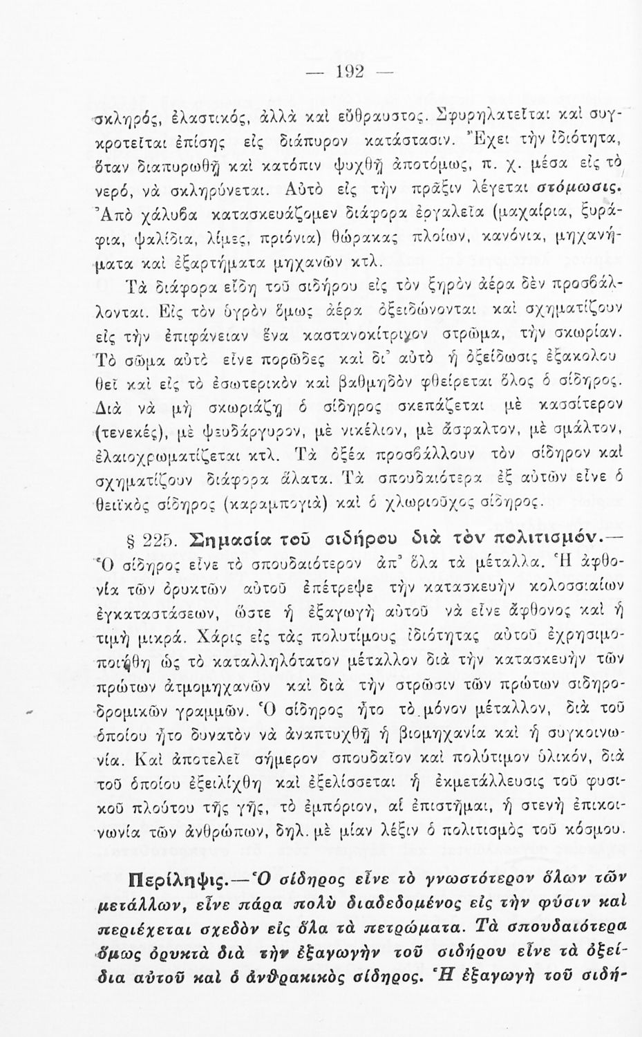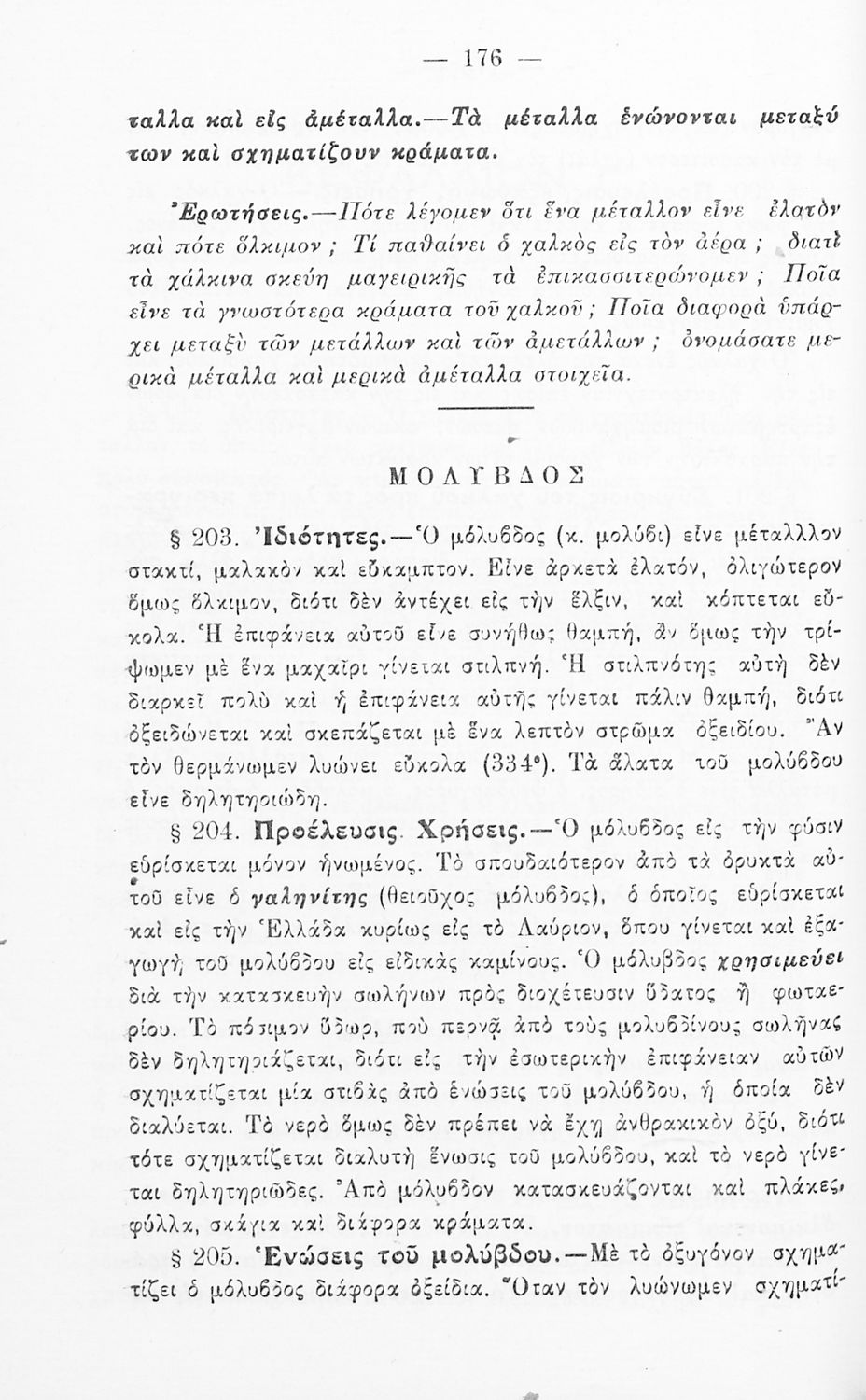 Παρουσίαση περιεχομένου: Το σύγγραμμα ήταν σχολικό εγχειρίδιο για το μάθημα της Φυσικής και της Χημείας στο Γυμνάσιο. Περιέχει βασικές γνώσεις για την φυσική επιστήμη, αναλύοντας φυσικά φαινόμενα, τις κινήσεις, τις δυνάμεις, την υδροστατική, τη θερμότητα, την ακουστική, τα φαινόμενα του μαγνητισμού και του ηλεκτρισμού. Όσον αφορά τη χημεία αναφέρεται στα μέταλλα και τα αμέταλλα, τα άλατα, τους υδρογονάνθρακες, τα σάκχαρα. Περιγράφονται οι ιδιότητές τους και οι χρήσεις τους.