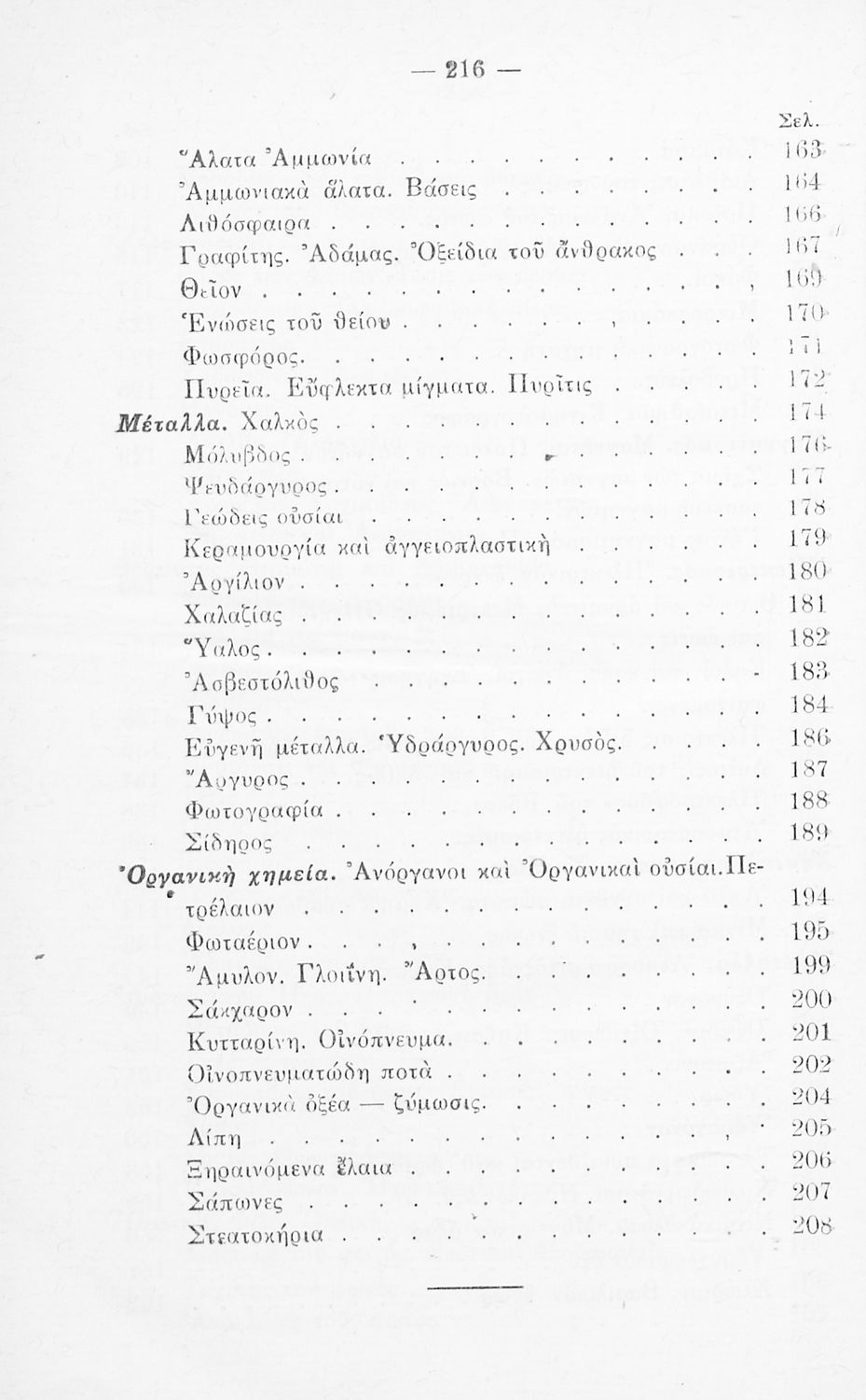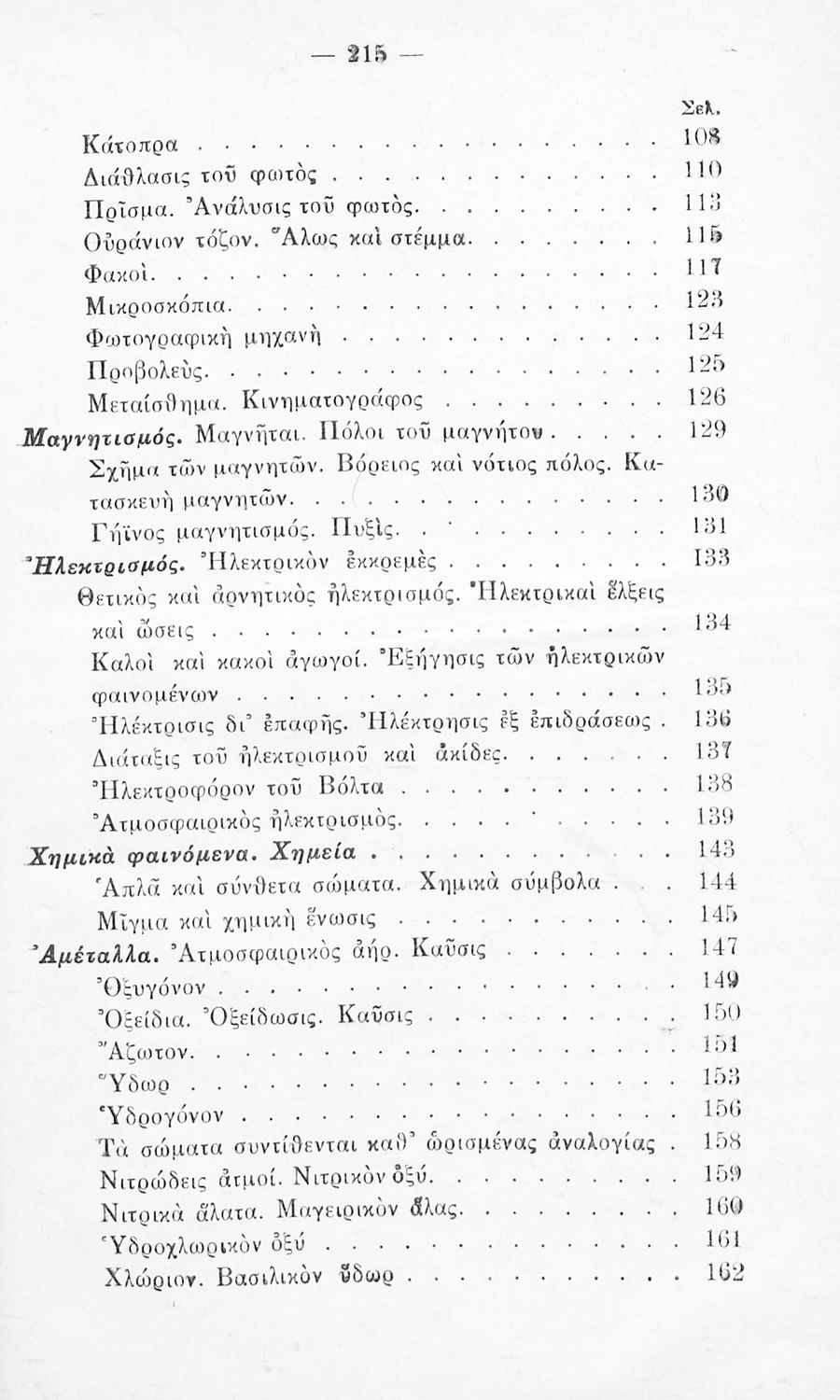 Παρουσίαση περιεχομένου: Το σύγγραμμα ήταν σχολικό εγχειρίδιο για το μάθημα της Φυσικής και της Χημείας στο Γυμνάσιο. Περιέχει βασικές γνώσεις για την φυσική επιστήμη, αναλύοντας φυσικά φαινόμενα, τις κινήσεις, τις δυνάμεις, την υδροστατική, τη θερμότητα, την ακουστική, τα φαινόμενα του μαγνητισμού και του ηλεκτρισμού. Όσον αφορά τη χημεία αναφέρεται στα μέταλλα και τα αμέταλλα, τα άλατα, τους υδρογονάνθρακες, τα σάκχαρα. Περιγράφονται οι ιδιότητές τους και οι χρήσεις τους.