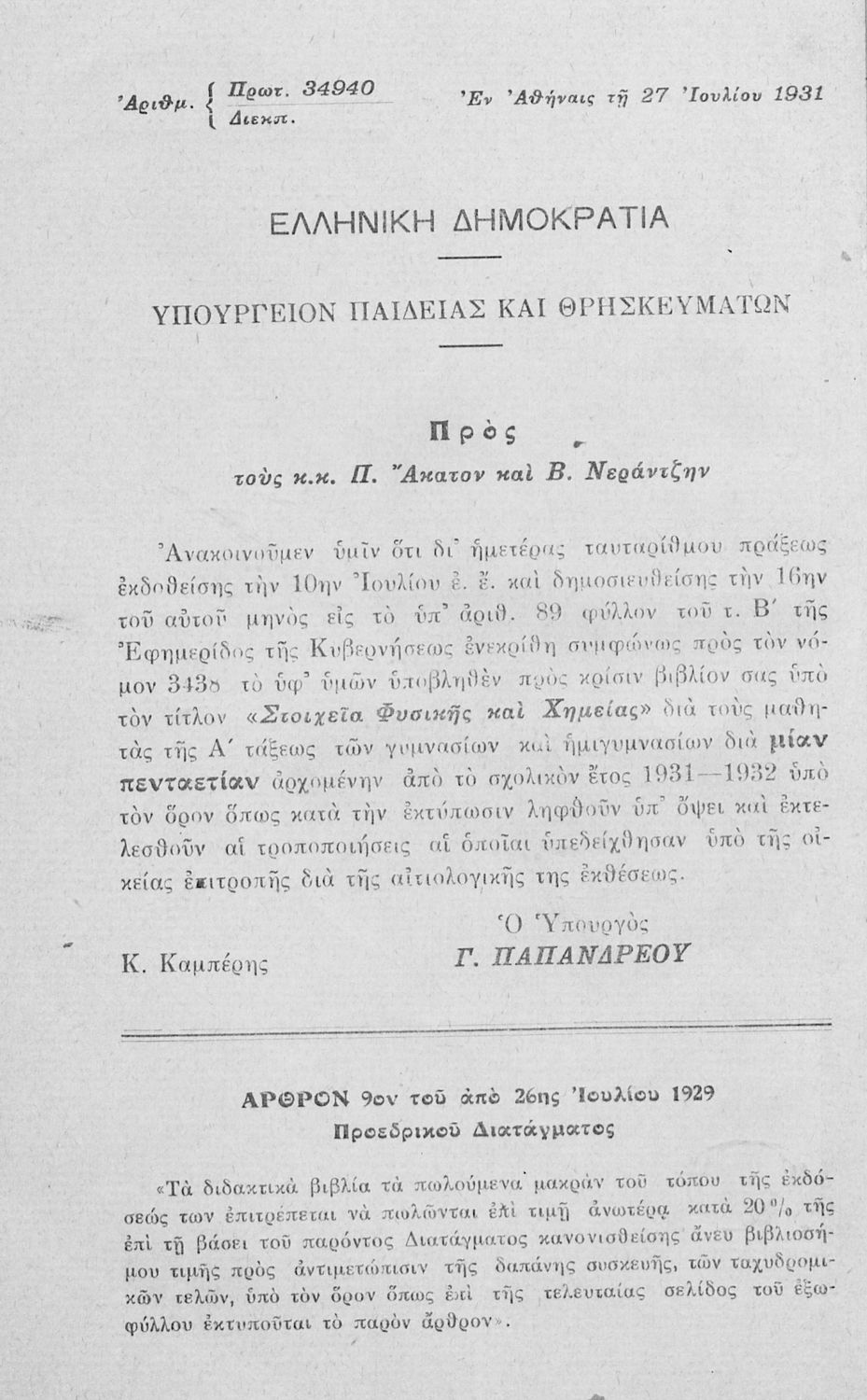 Υπουργική απόφαση / Σύμβαση: 34940/27-7-1931