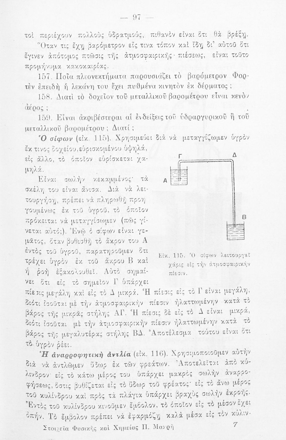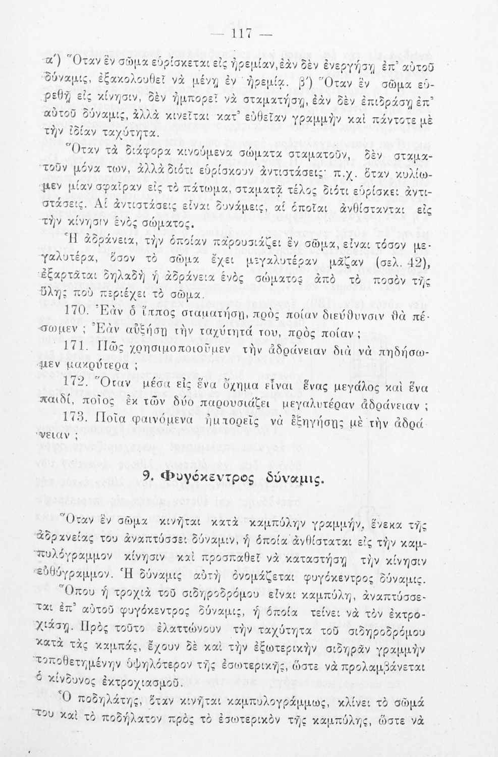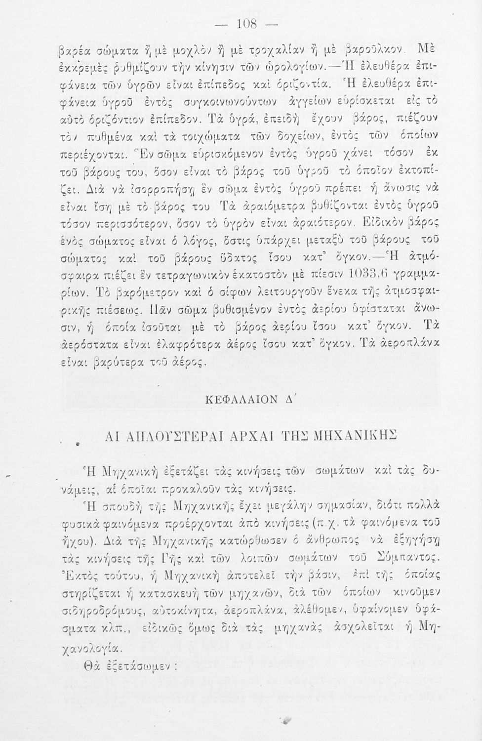 Βαθμίδα εκπαίδευσης: Δευτεροβάθμια Τάξη: Α' Γυμνασίου Γλώσσα: Καθαρεύουσα Παρουσίαση περιεχομένου: Σχολικό εγχειρίδιο Φυσικής και Χημείας της Α' τάξης Γυμνασίων και Ημιγυμνασίων. Το βιβλίο αρχικά ασχολείται με τα φαινόμενα της μηχανικής, του ήχου, των μαγνητών, του ηλεκτρισμού και του ηλεκτρομαγνητισμού. Στο δεύτερο μέρος, το βιβλίο παρουσιάζει τα σπουδαιότερα μέταλλα, αμέταλλα, τα άλατα και τις ιδιότητες τους. |