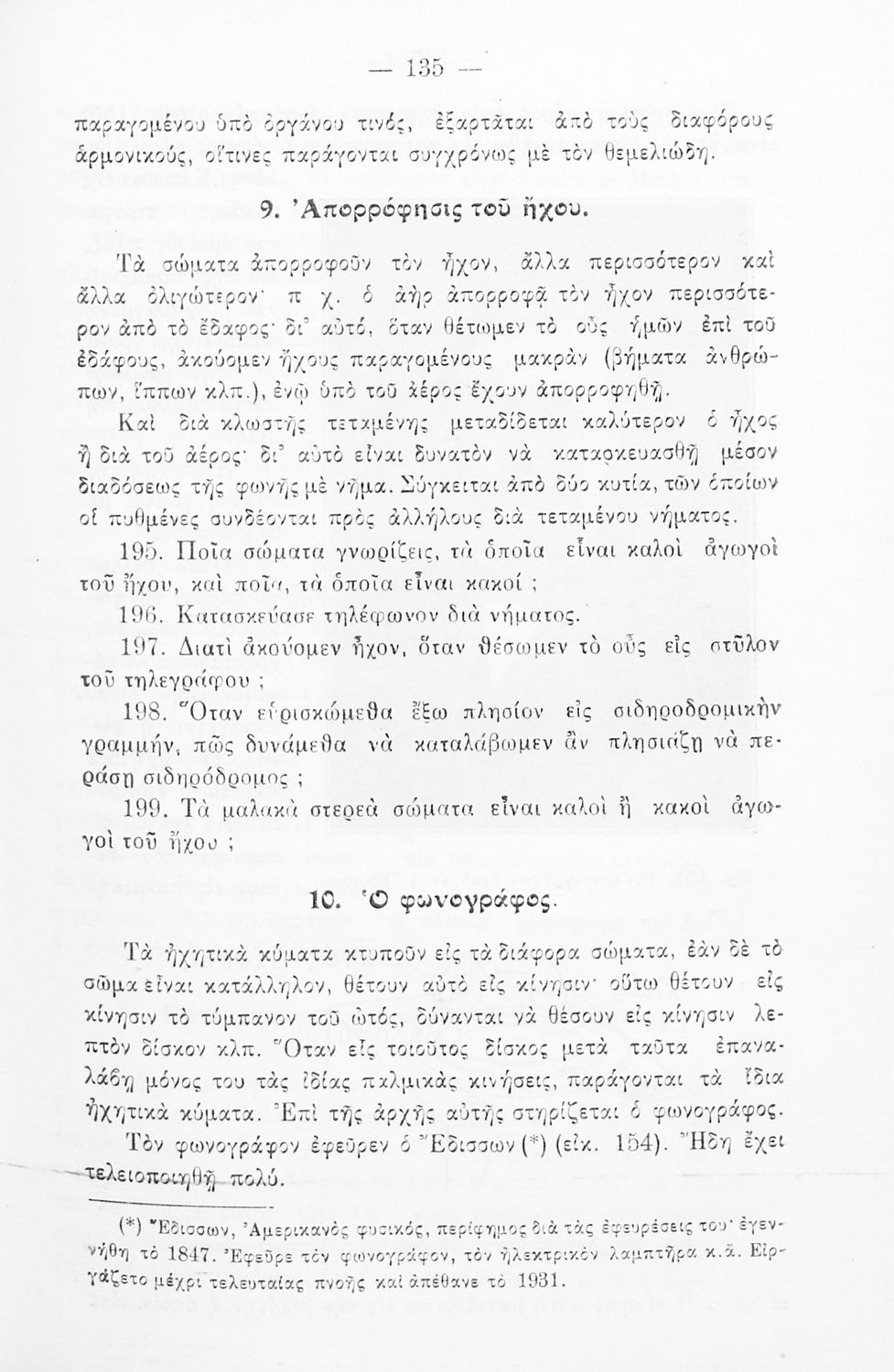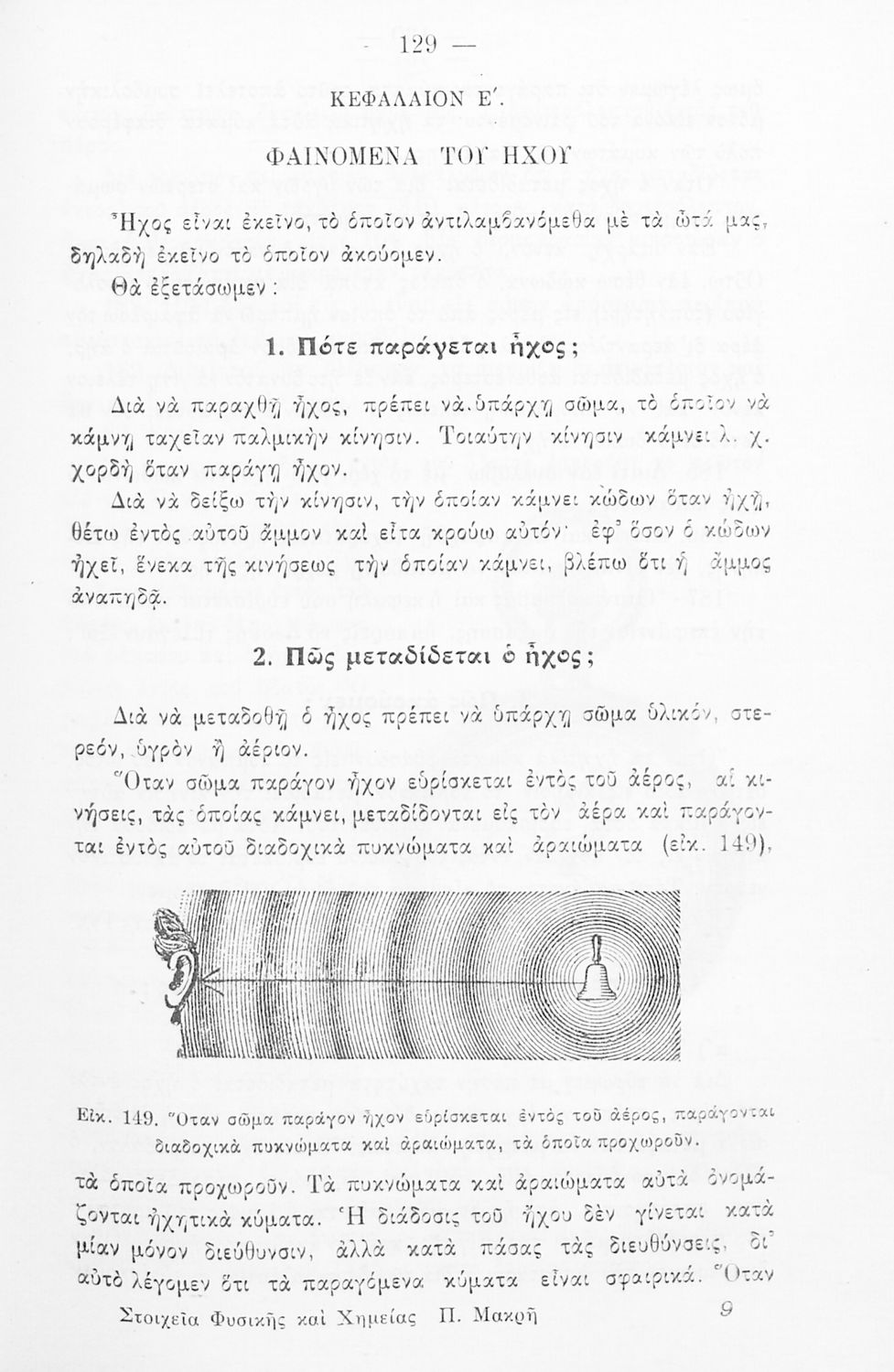 Σχολικό εγχειρίδιο Φυσικής και Χημείας της Α' τάξης Γυμνασίων και Ημιγυμνασίων. Το βιβλίο αρχικά ασχολείται με τα φαινόμενα της μηχανικής, του ήχου, των μαγνητών, του ηλεκτρισμού και του ηλεκτρομαγνητισμού. Στο δεύτερο μέρος, το βιβλίο παρουσιάζει τα σπουδαιότερα μέταλλα, αμέταλλα, τα άλατα και τις ιδιότητες τους.
