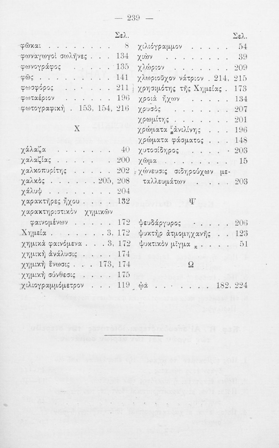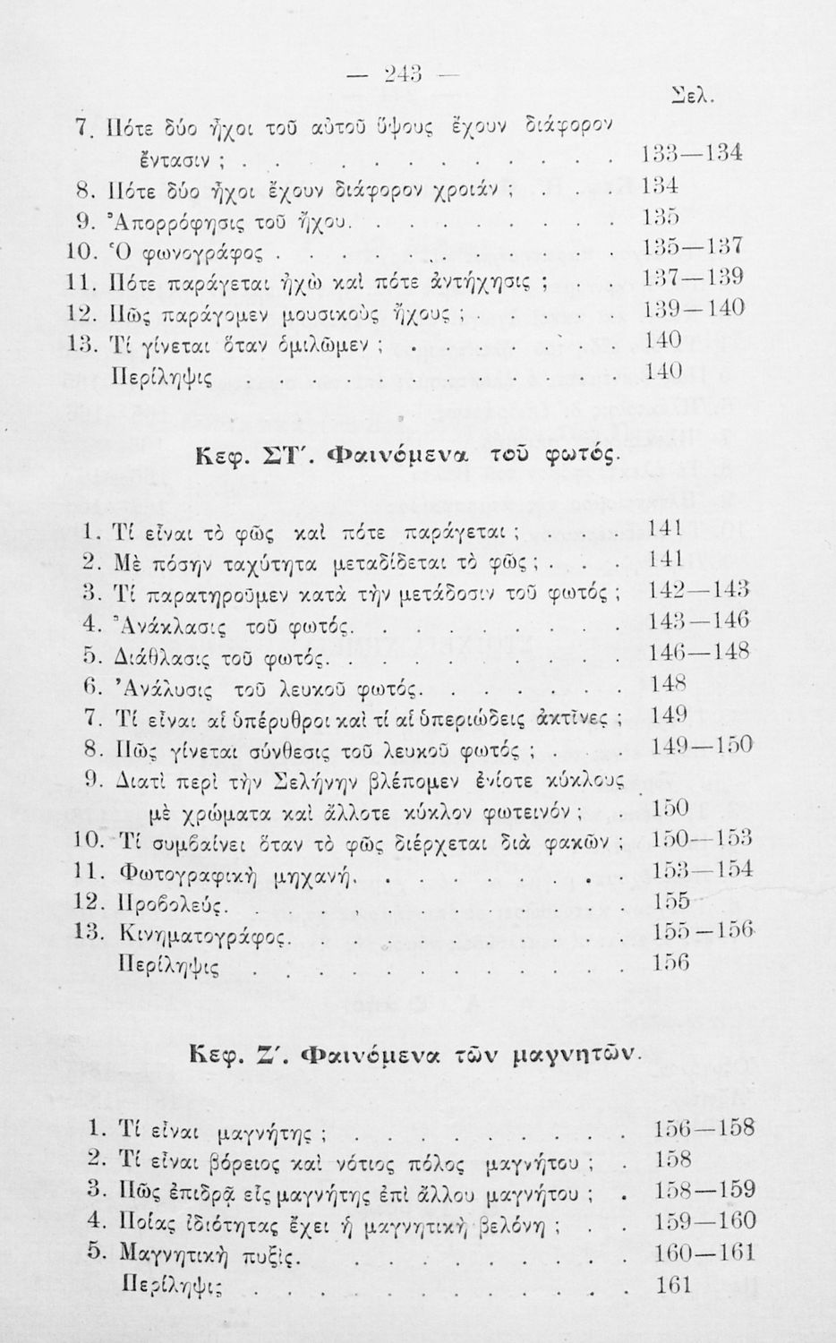 Σχολικό εγχειρίδιο Φυσικής και Χημείας της Α' τάξης Γυμνασίων και Ημιγυμνασίων. Το βιβλίο αρχικά ασχολείται με τα φαινόμενα της μηχανικής, του ήχου, των μαγνητών, του ηλεκτρισμού και του ηλεκτρομαγνητισμού. Στο δεύτερο μέρος, το βιβλίο παρουσιάζει τα σπουδαιότερα μέταλλα, αμέταλλα, τα άλατα και τις ιδιότητες τους.