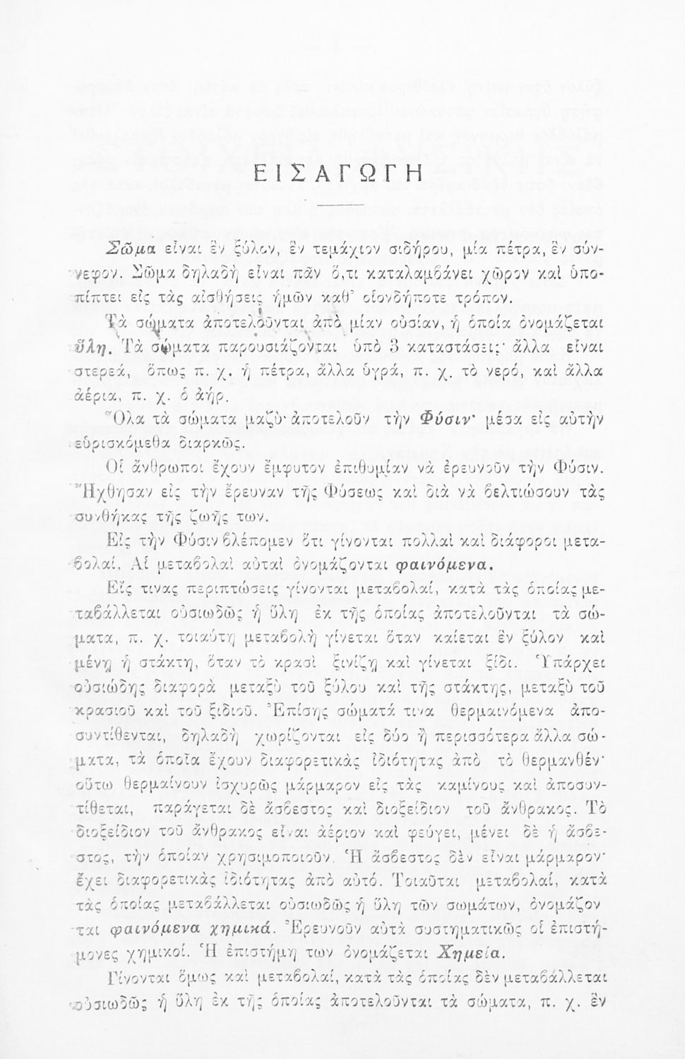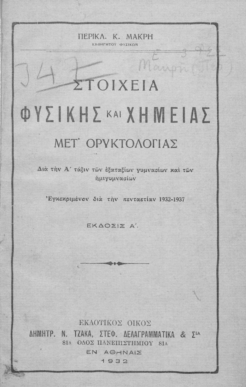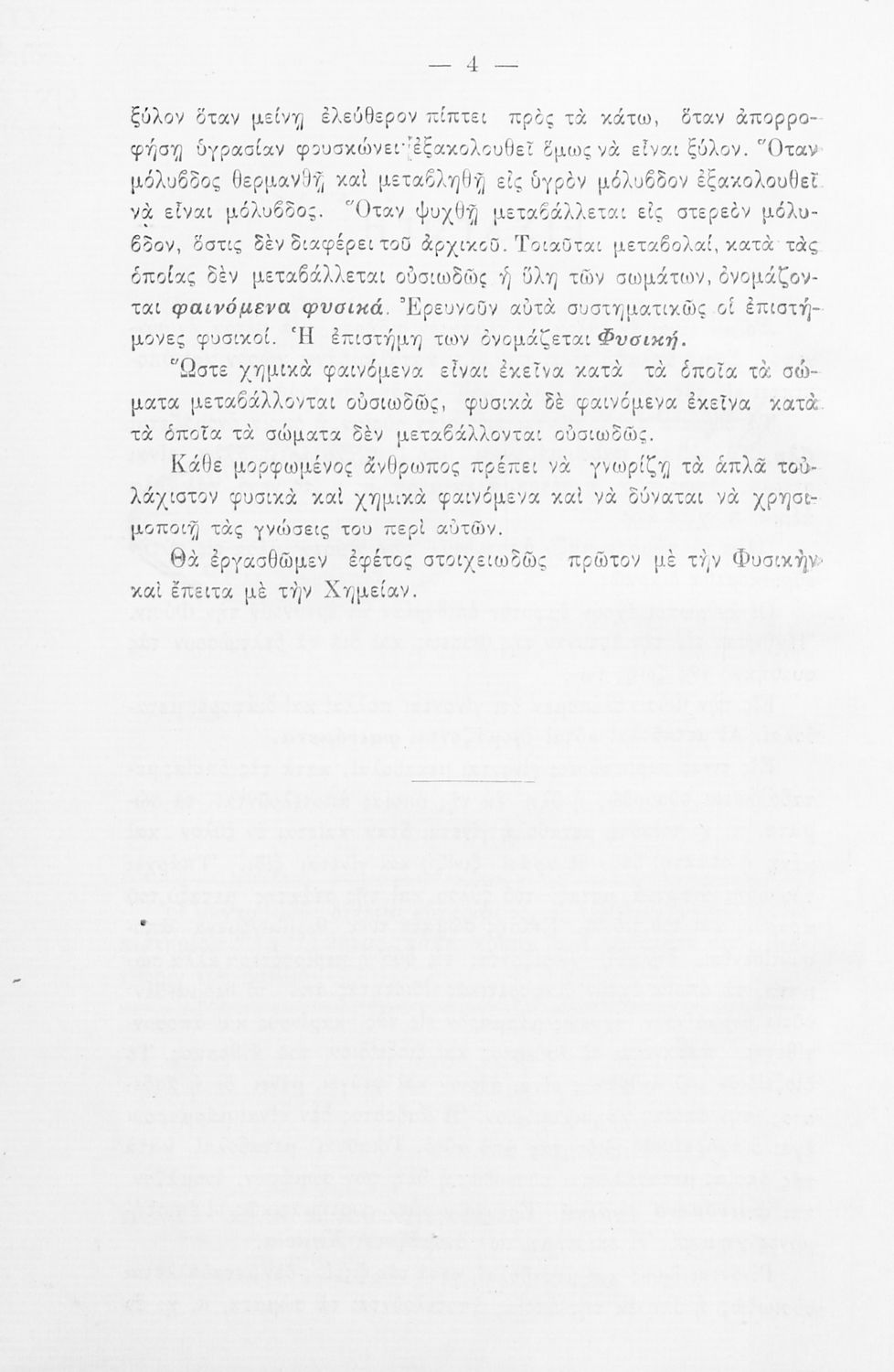 Σχολικό εγχειρίδιο Φυσικής και Χημείας της Α' τάξης Γυμνασίων και Ημιγυμνασίων. Το βιβλίο αρχικά ασχολείται με τα φαινόμενα της μηχανικής, του ήχου, των μαγνητών, του ηλεκτρισμού και του ηλεκτρομαγνητισμού. Στο δεύτερο μέρος, το βιβλίο παρουσιάζει τα σπουδαιότερα μέταλλα, αμέταλλα, τα άλατα και τις ιδιότητες τους.