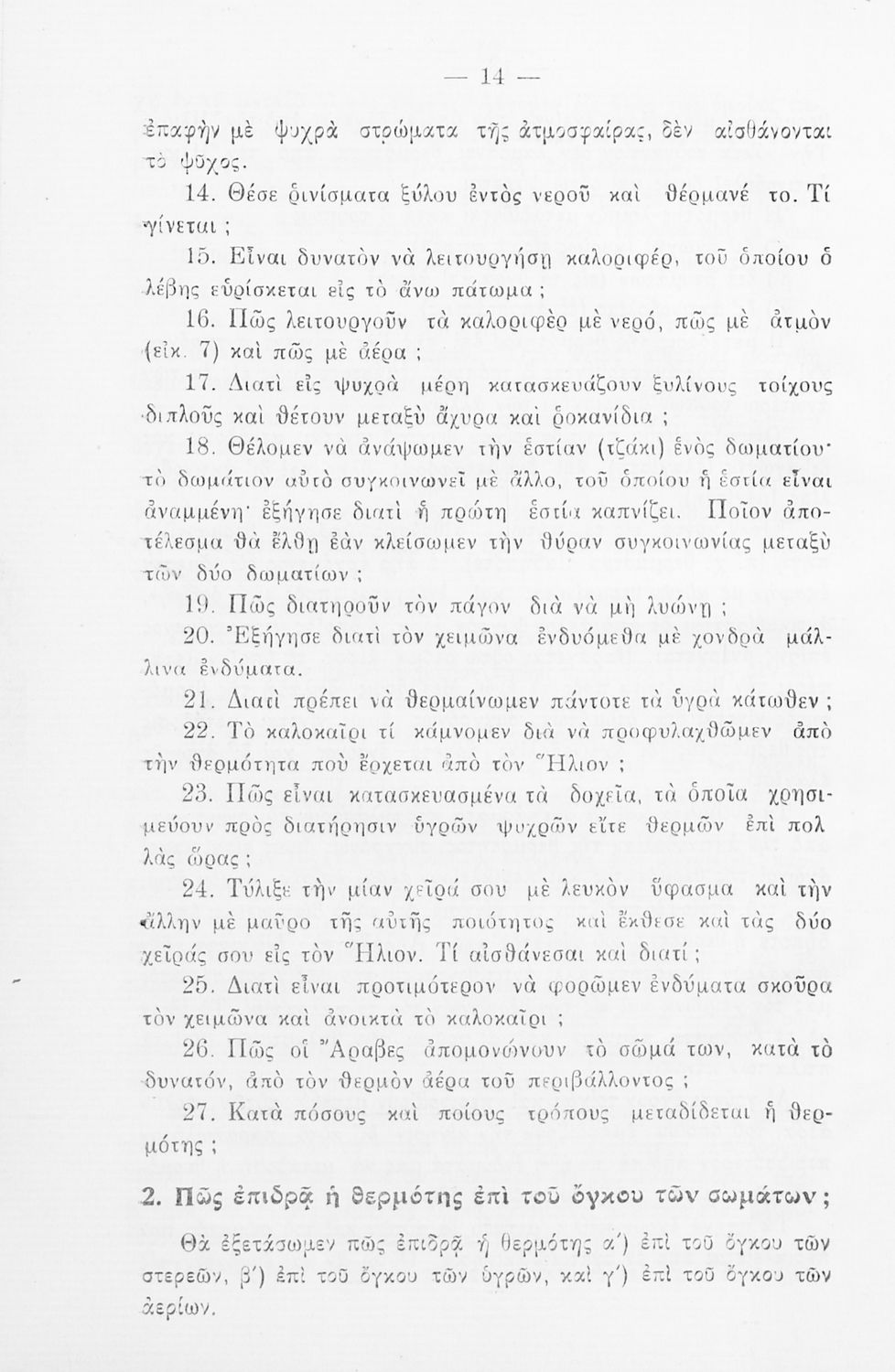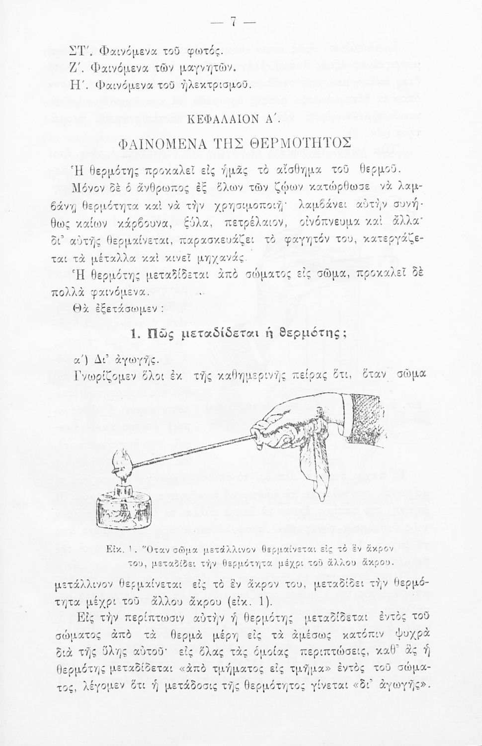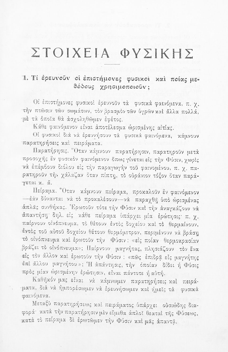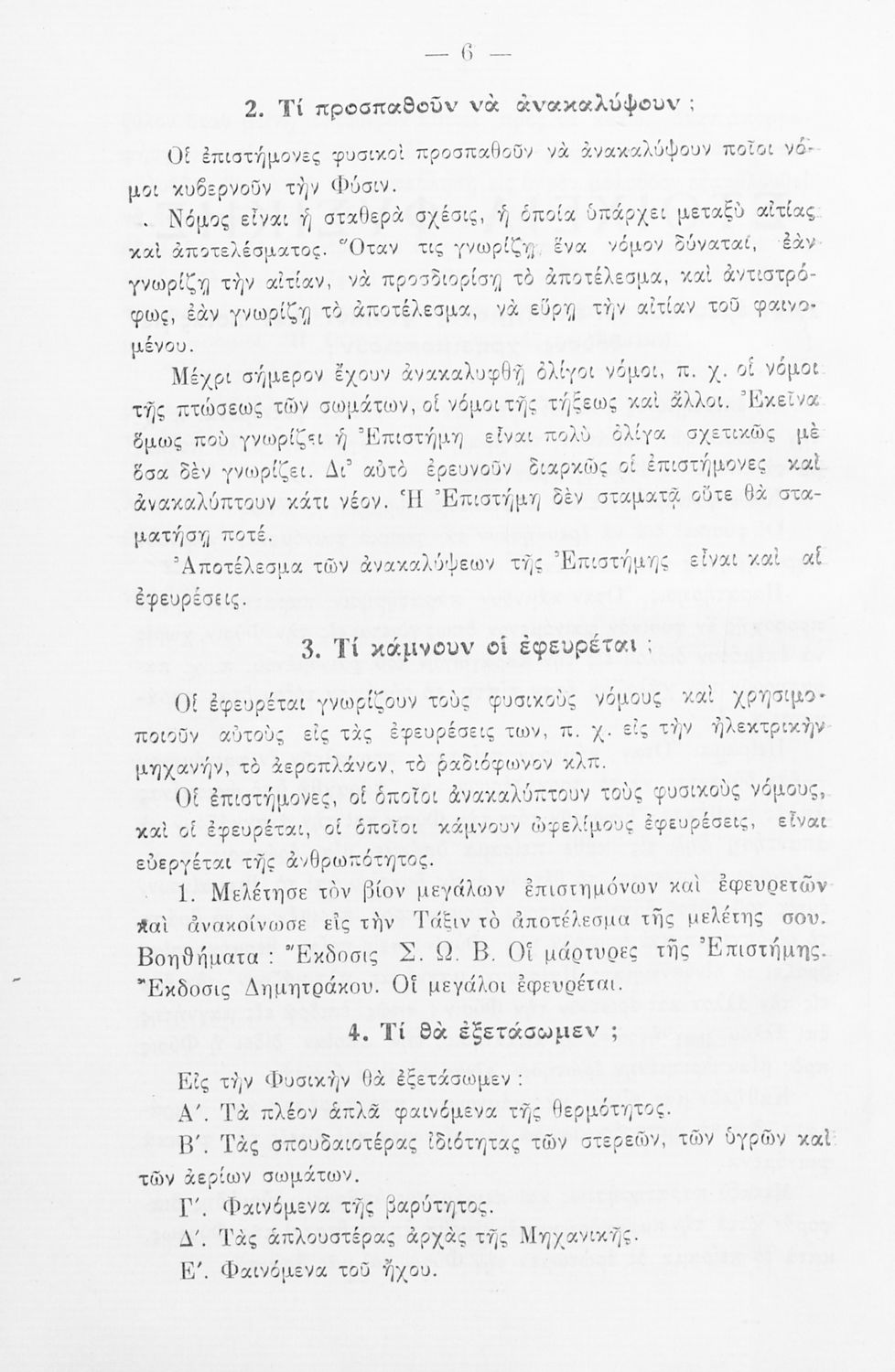 Σχολικό εγχειρίδιο Φυσικής και Χημείας της Α' τάξης Γυμνασίων και Ημιγυμνασίων. Το βιβλίο αρχικά ασχολείται με τα φαινόμενα της μηχανικής, του ήχου, των μαγνητών, του ηλεκτρισμού και του ηλεκτρομαγνητισμού. Στο δεύτερο μέρος, το βιβλίο παρουσιάζει τα σπουδαιότερα μέταλλα, αμέταλλα, τα άλατα και τις ιδιότητες τους.