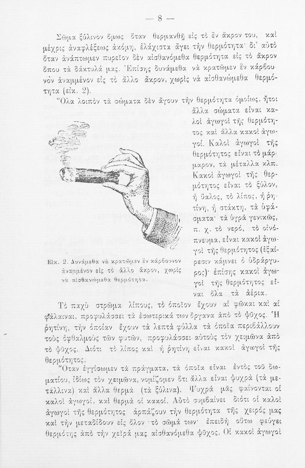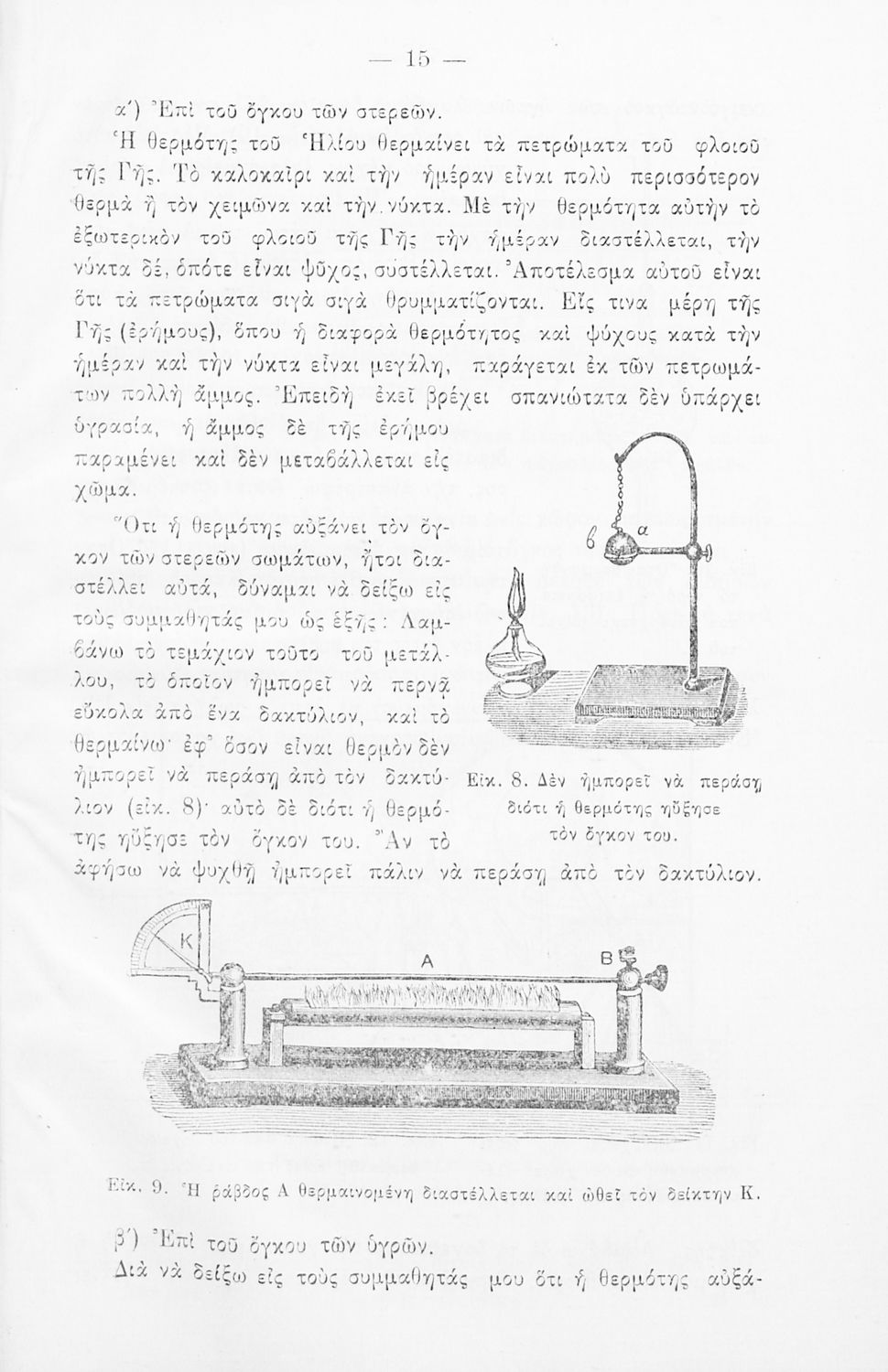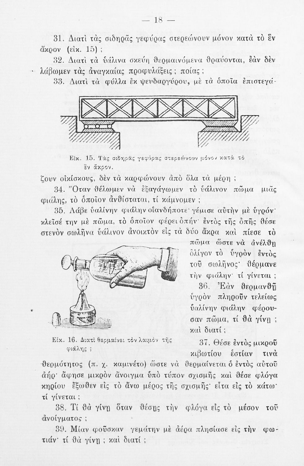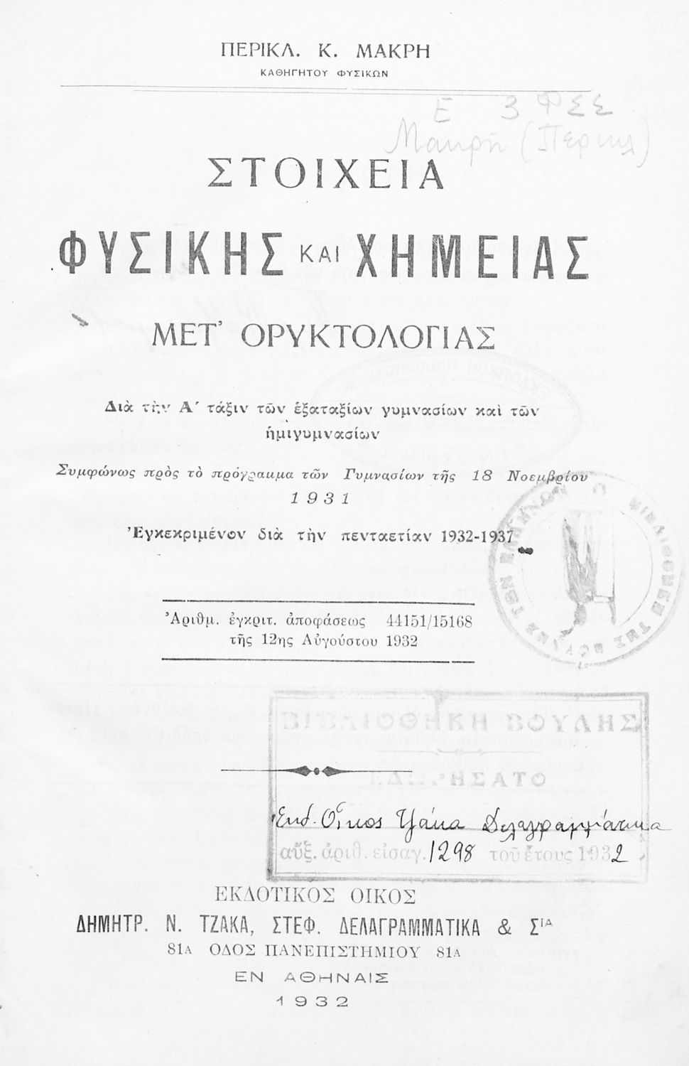 Βαθμίδα εκπαίδευσης: Δευτεροβάθμια Τάξη: Α' Γυμνασίου Γλώσσα: Καθαρεύουσα Παρουσίαση περιεχομένου: Σχολικό εγχειρίδιο Φυσικής και Χημείας της Α' τάξης Γυμνασίων και Ημιγυμνασίων. Το βιβλίο αρχικά ασχολείται με τα φαινόμενα της μηχανικής, του ήχου, των μαγνητών, του ηλεκτρισμού και του ηλεκτρομαγνητισμού. Στο δεύτερο μέρος, το βιβλίο παρουσιάζει τα σπουδαιότερα μέταλλα, αμέταλλα, τα άλατα και τις ιδιότητες τους. |