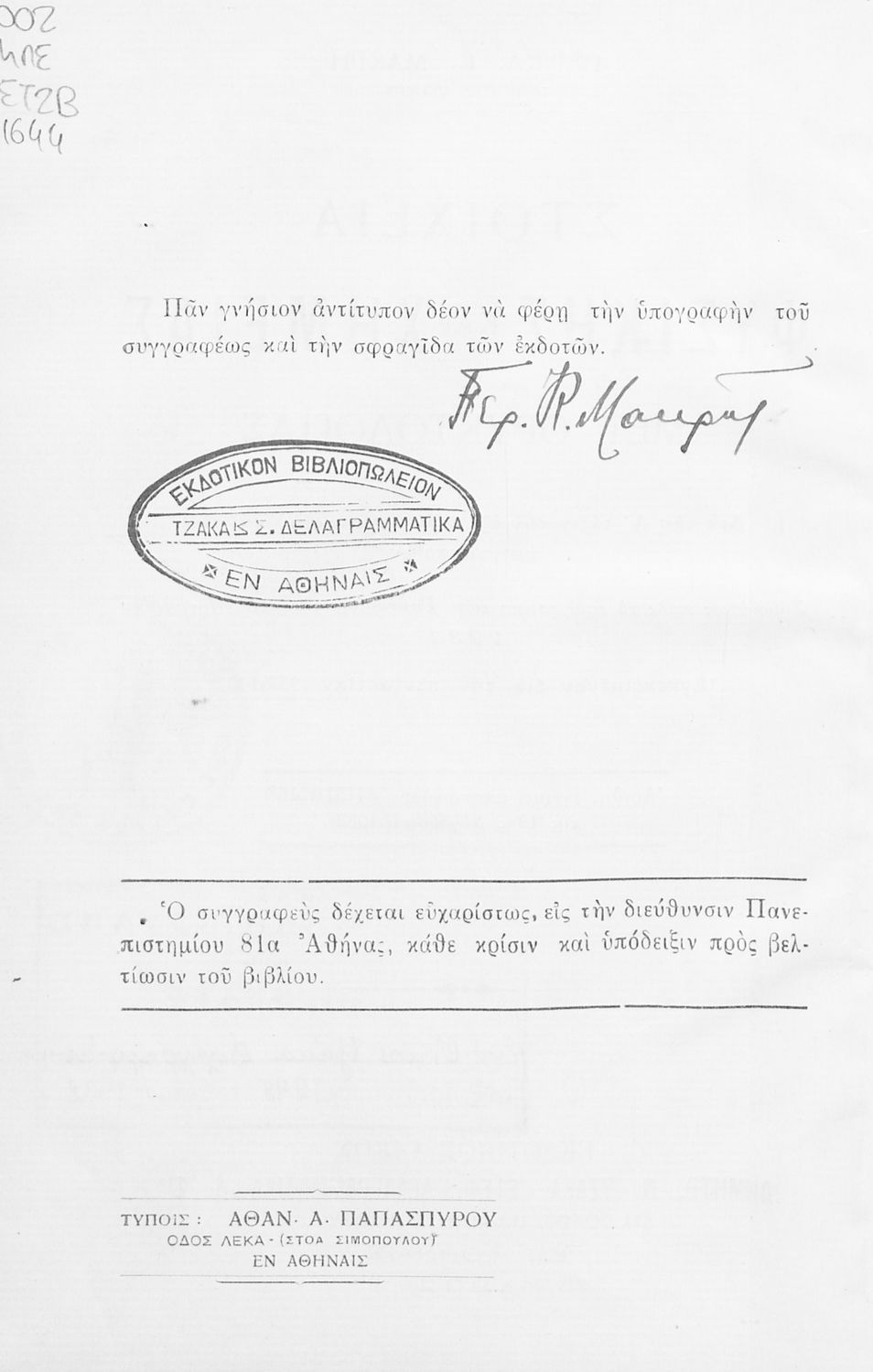 Εκδότης: Δημ. Ν. Τζάκας, Στεφ. Δελαγραμμάτικας και ΣΙΑ Έτος έκδοσης: 1932 Τόπος έκδοσης: Αθήνα Έτος έγκρισης: 1932 |