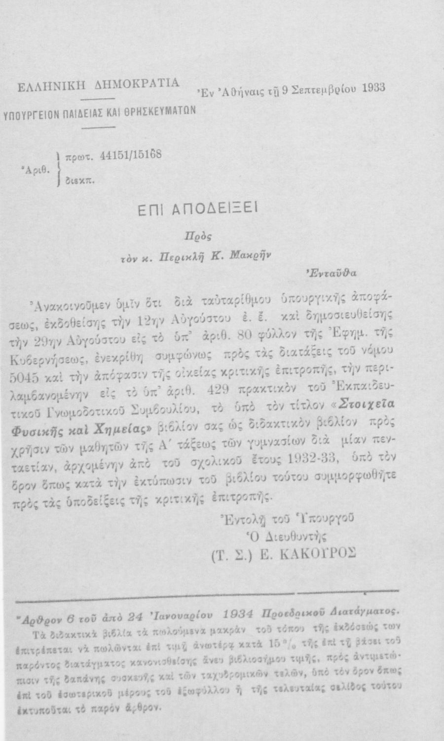 Τίτλος: Στοιχεία φυσικής και χημείας μετ' ορυκτολογίας δια την Α΄ τάξιν των Γυμνασίων και τας αντιστοίχους τάξεις των λοιπών σχολείων