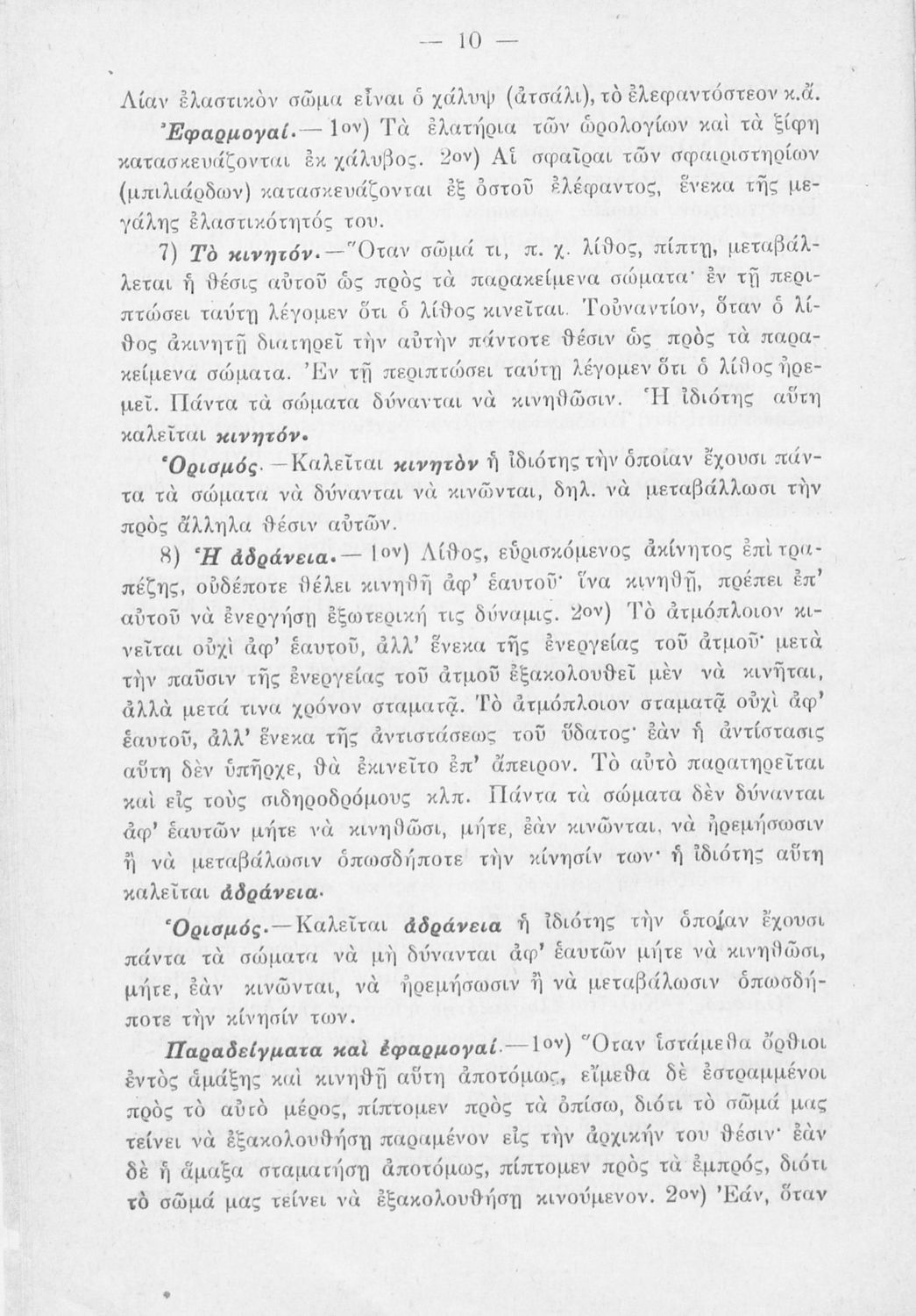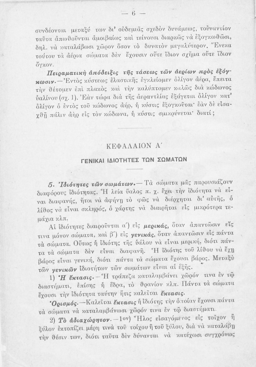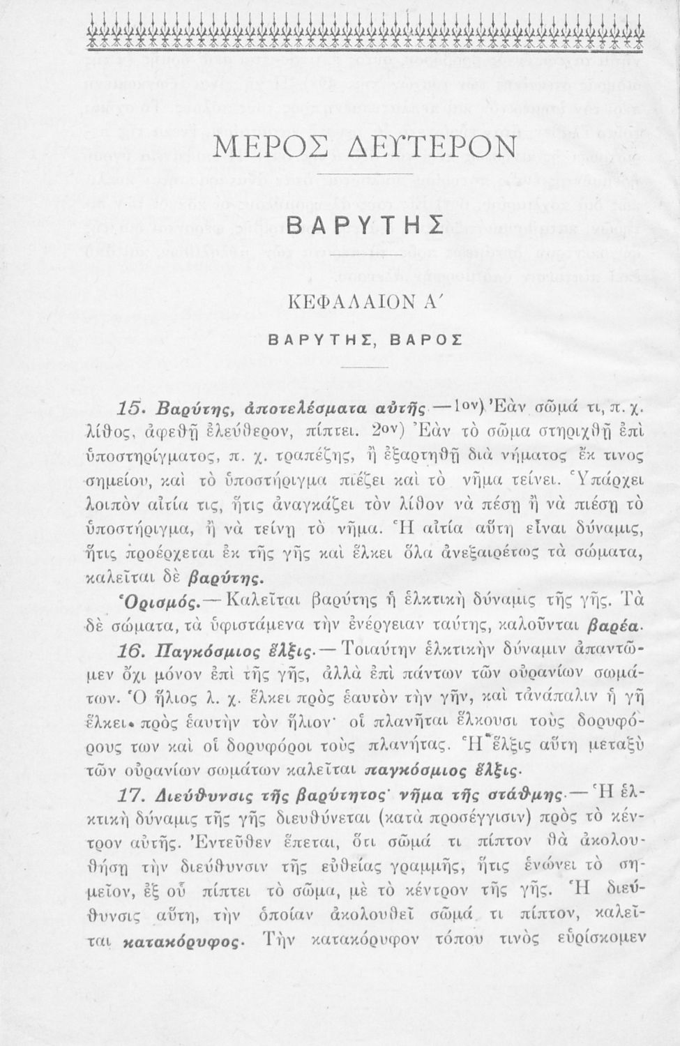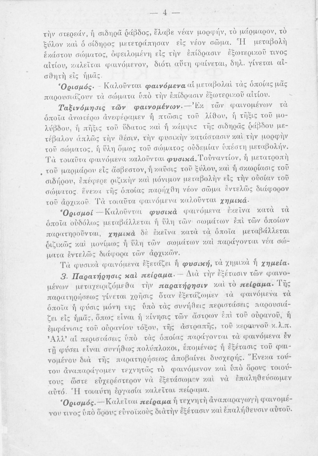 Βαθμίδα εκπαίδευσης: Δευτεροβάθμια Τάξη: Γ' Ελληνικού Σχολείου Γλώσσα: Απλή καθαρεύουσα Παρουσίαση περιεχομένου: Σχολικό εγχειρίδιο της Γ΄ Τάξης του Ελληνικού Σχολείου για το μάθημα της Φυσικής και της Χημείας. Αναφέρεται στις φυσικές ιδιότητες των σωμάτων. Συνεχίζει με την ανάλυση της βαρύτητας, της υδροστατικής, αεροστατικής, θερμότητας, μαγνητισμού, ακουστικής, οπτική και του ηλεκτρισμού. Στη Χημεία αναλύονται οι ιδιότητες των μετάλλων, αμέταλλων και των ενώσεων του άνθρακα. |