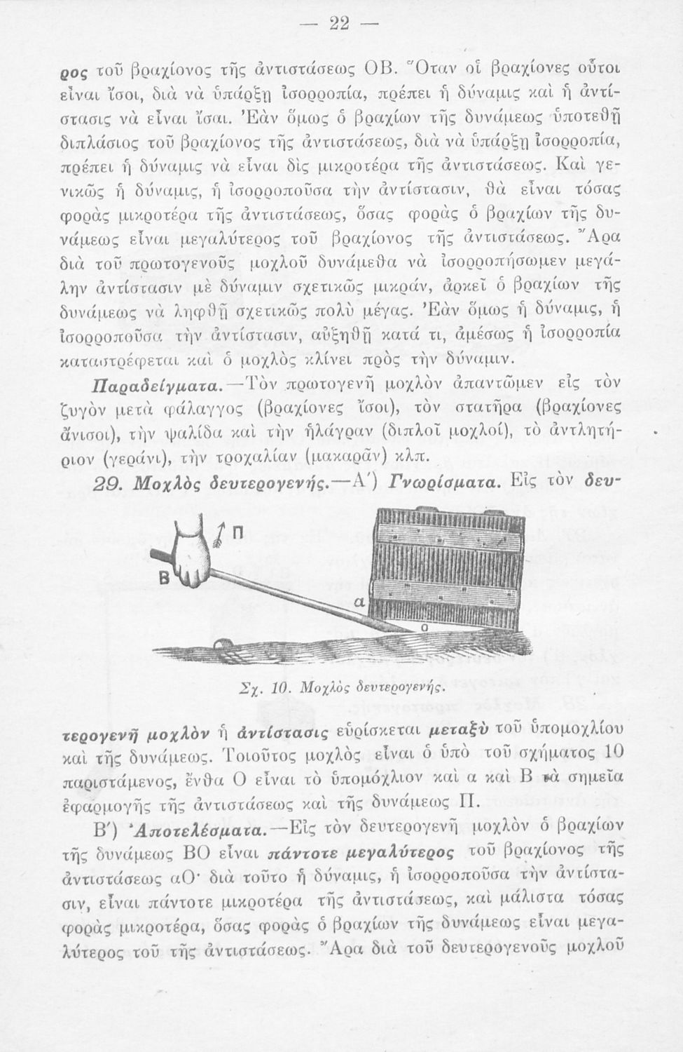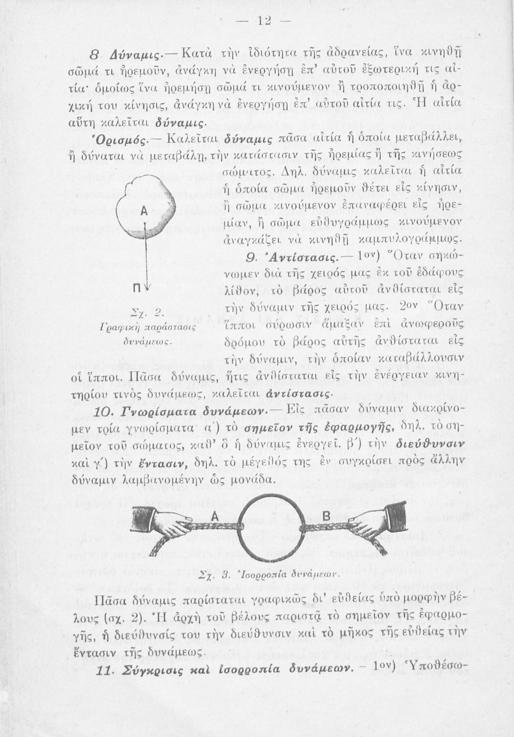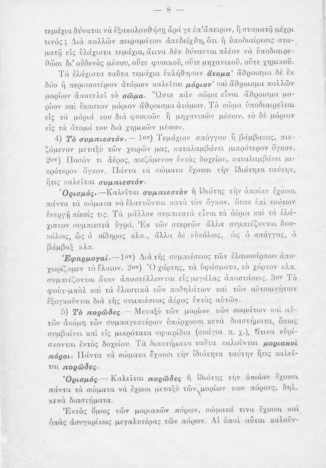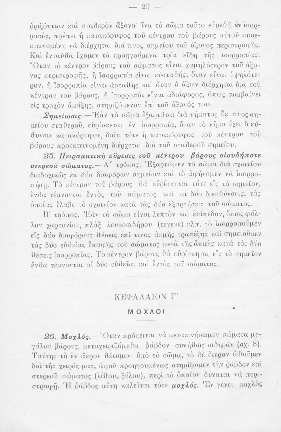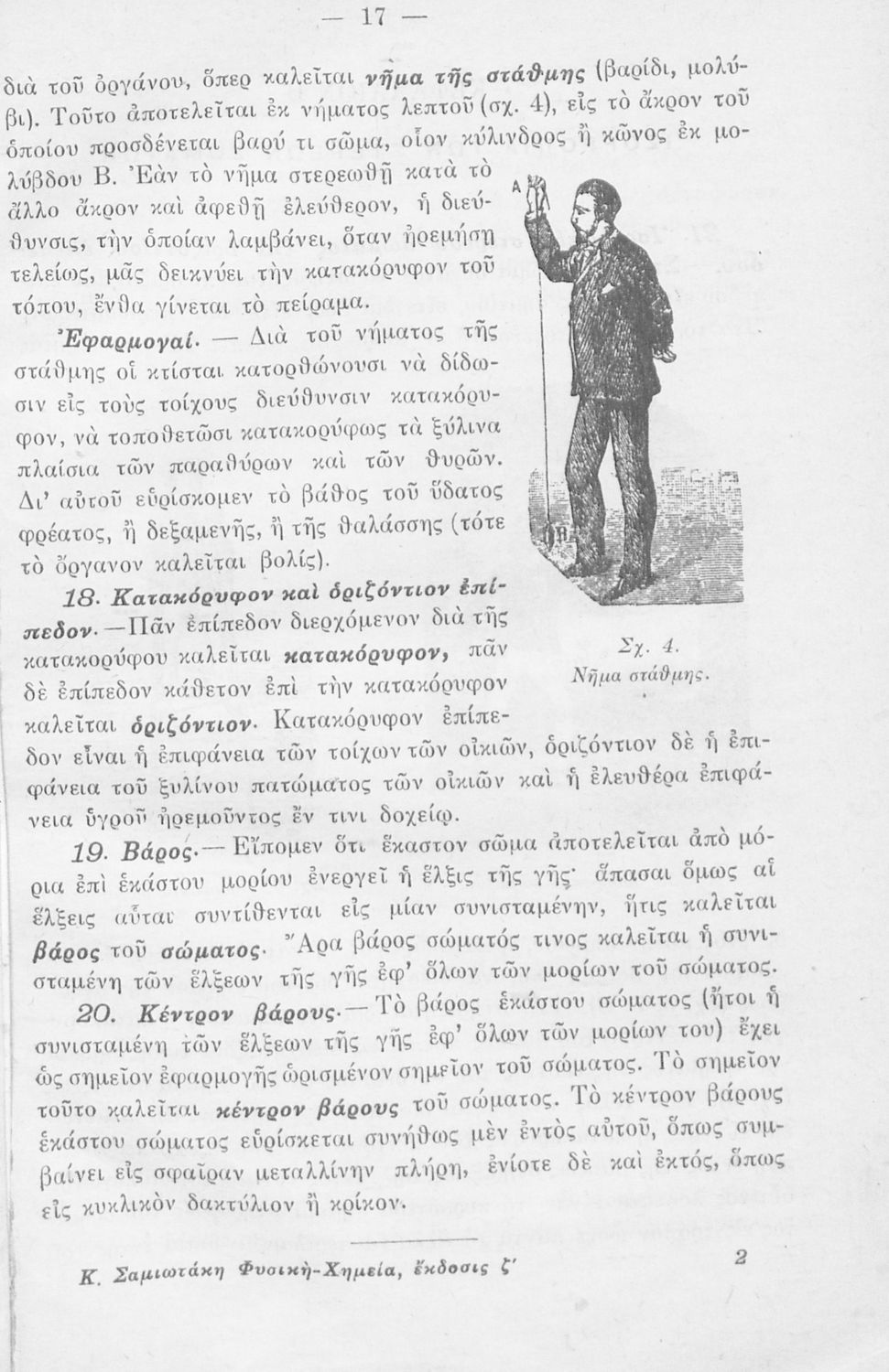 Βαθμίδα εκπαίδευσης: Δευτεροβάθμια Τάξη: Γ' Ελληνικού Σχολείου Γλώσσα: Απλή καθαρεύουσα Παρουσίαση περιεχομένου: Σχολικό εγχειρίδιο της Γ΄ Τάξης του Ελληνικού Σχολείου για το μάθημα της Φυσικής και της Χημείας. Αναφέρεται στις φυσικές ιδιότητες των σωμάτων. Συνεχίζει με την ανάλυση της βαρύτητας, της υδροστατικής, αεροστατικής, θερμότητας, μαγνητισμού, ακουστικής, οπτική και του ηλεκτρισμού. Στη Χημεία αναλύονται οι ιδιότητες των μετάλλων, αμέταλλων και των ενώσεων του άνθρακα. |