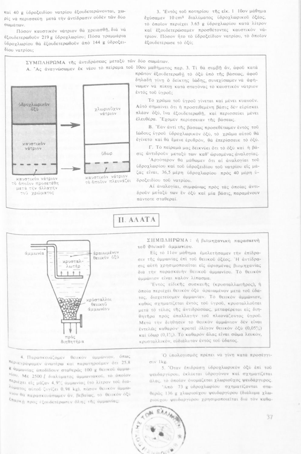 Σχολικό εγχειρίδιο Χημείας Β' Γυμνασίου που αναλύει τα χαρακτηριστικά και τις ιδιότητες των οξέων, βάσεων, αλάτων και περιέχει χημικές εξισώσεις, ασκήσεις και θεωρία. Φέρει το σύμβολο της δικτατορίας.