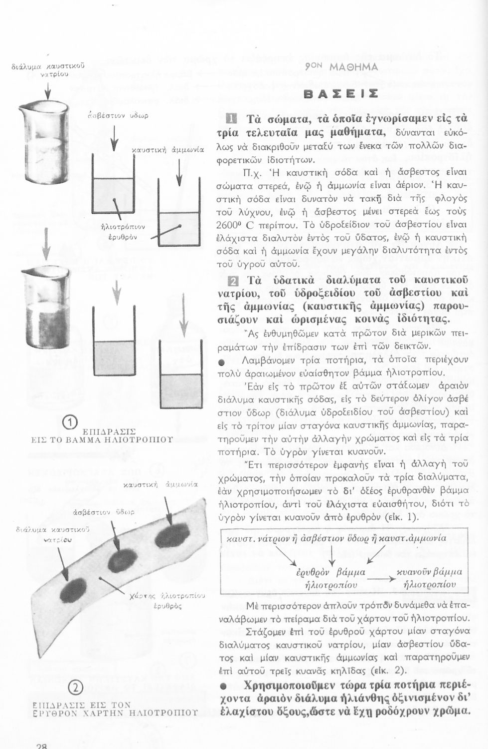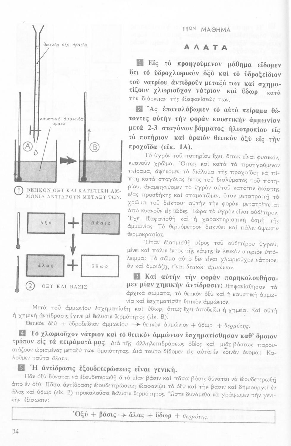 Σχολικό εγχειρίδιο Χημείας Β' Γυμνασίου που αναλύει τα χαρακτηριστικά και τις ιδιότητες των οξέων, βάσεων, αλάτων και περιέχει χημικές εξισώσεις, ασκήσεις και θεωρία.