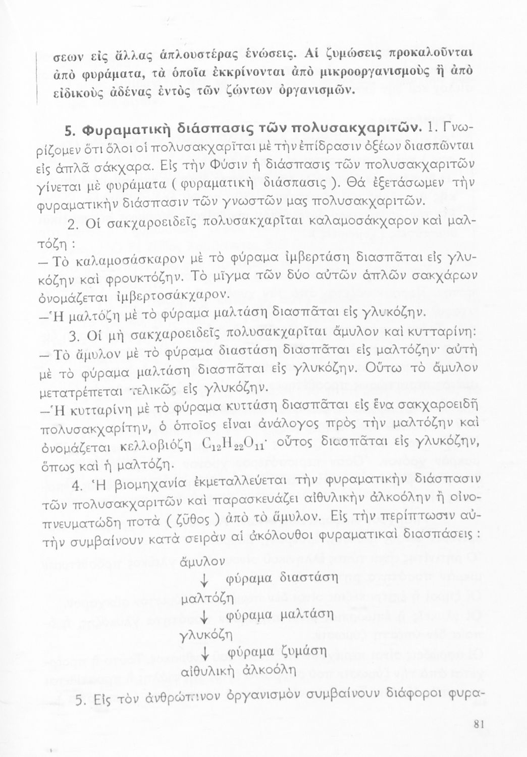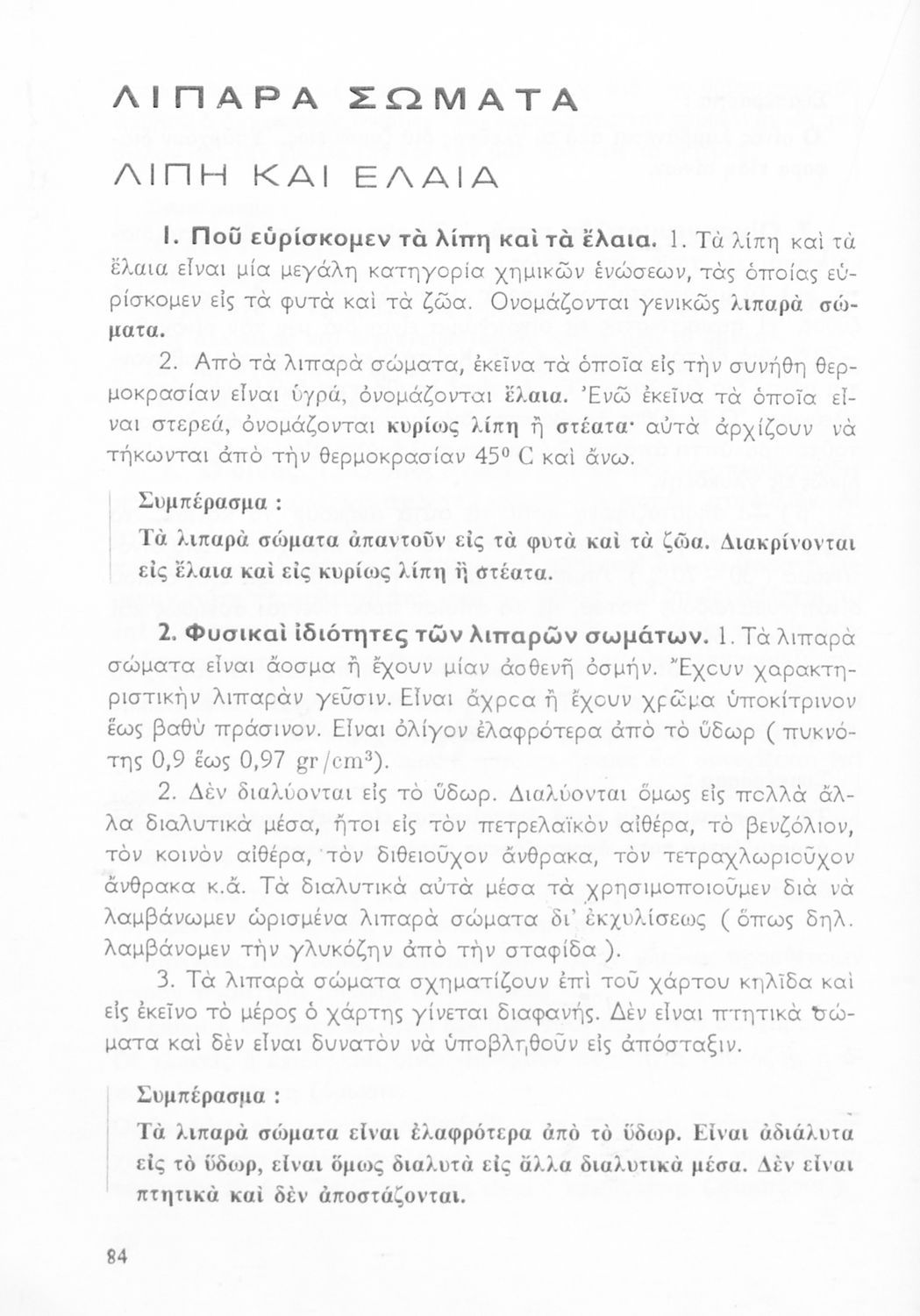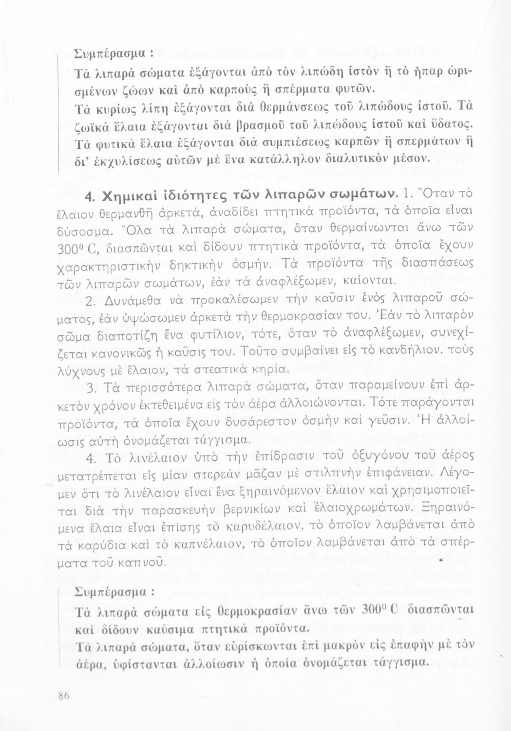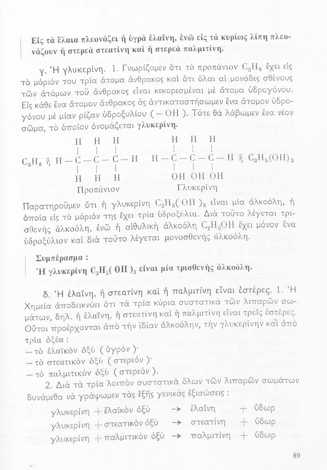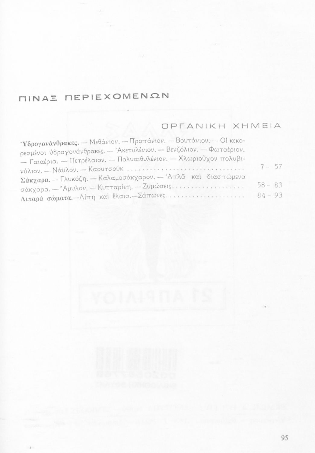 Σχολικό εγχειρίδιο Χημείας Γ΄ Γυμνασίου που περιέχει εισαγωγή στην οργανική χημεία και εστιάζει στους υδρογονάνθρακες, τα σάκχαρα και τα λιπαρά σώματα. Φέρει το σύμβολο της δικτατορίας.