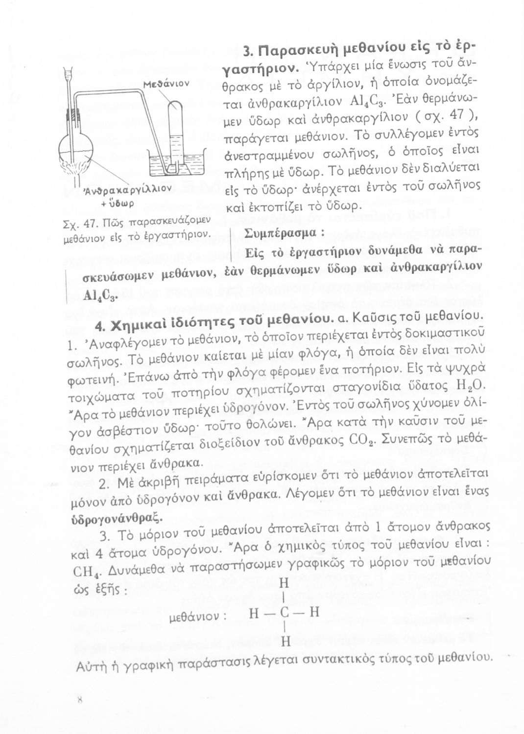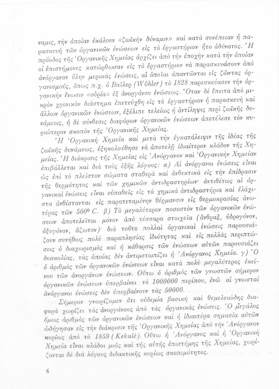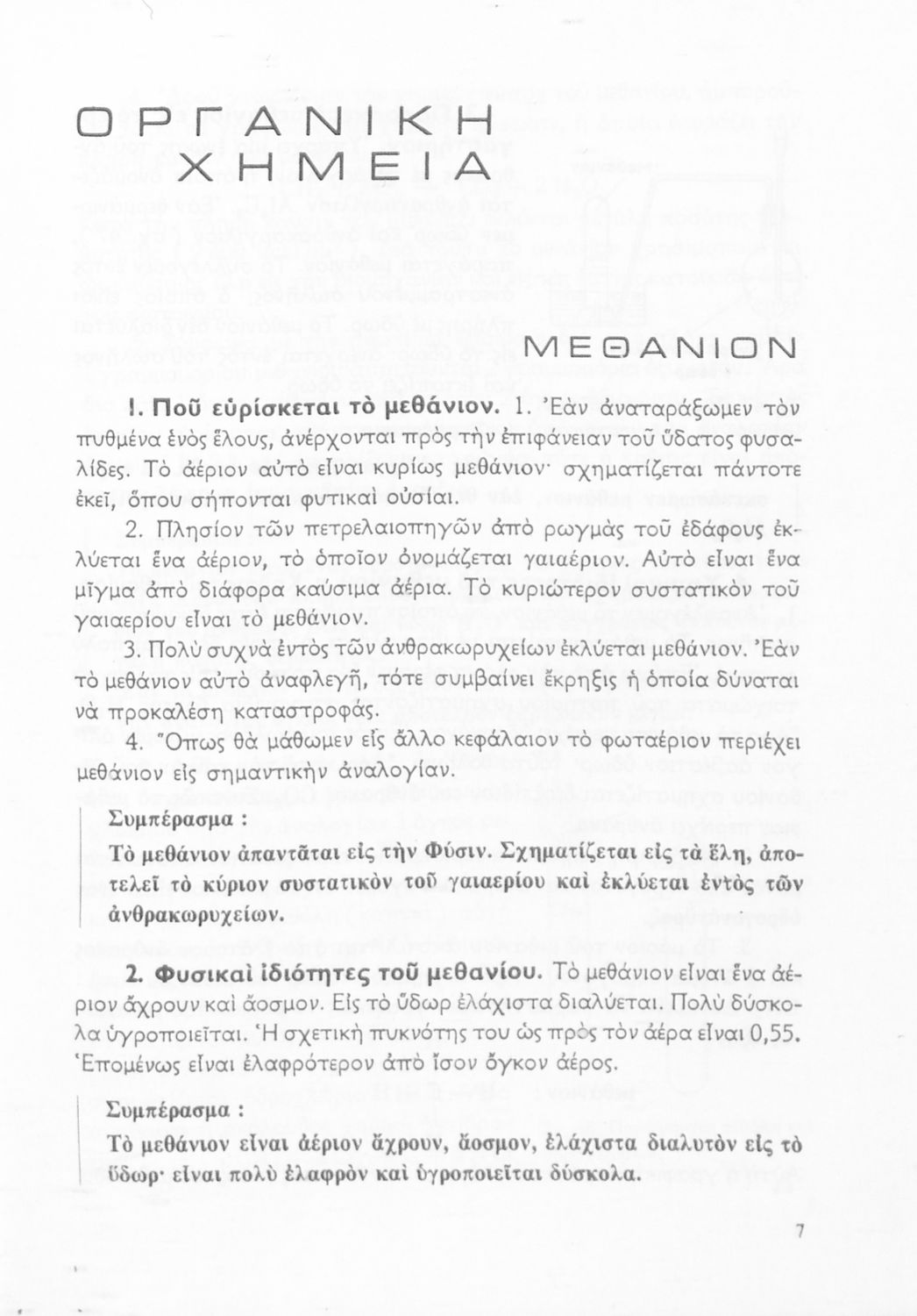 Σχολικό εγχειρίδιο Χημείας Γ΄ Γυμνασίου που περιέχει εισαγωγή στην οργανική χημεία και εστιάζει στους υδρογονάνθρακες, τα σάκχαρα και τα λιπαρά σώματα. Φέρει το σύμβολο της δικτατορίας.