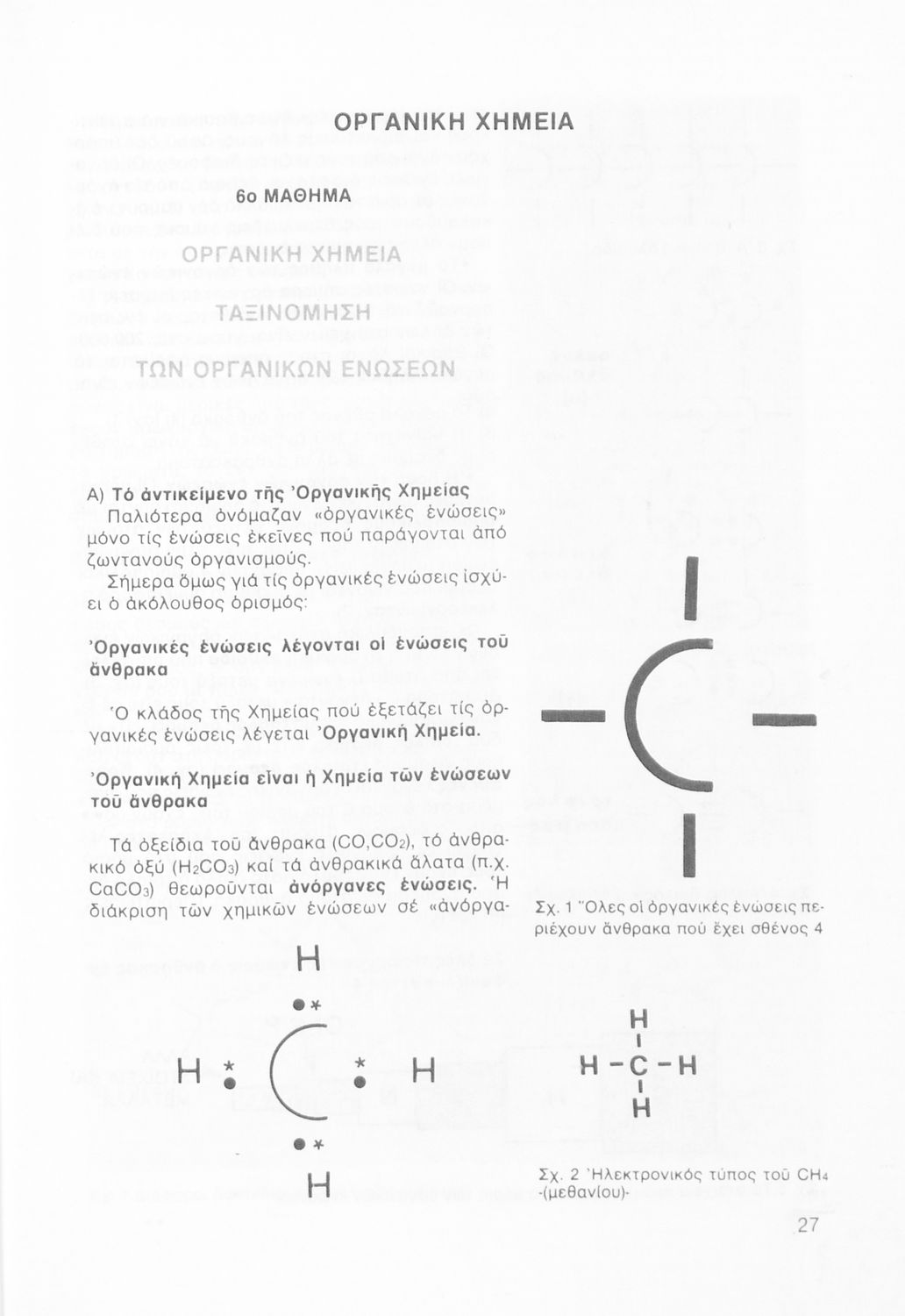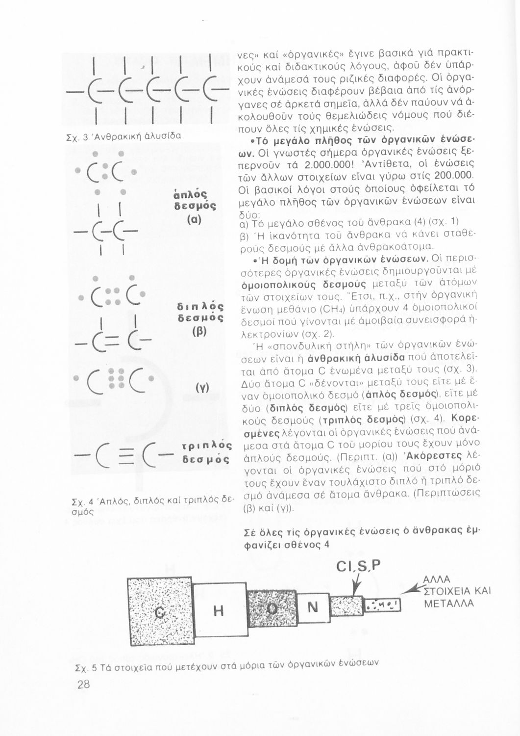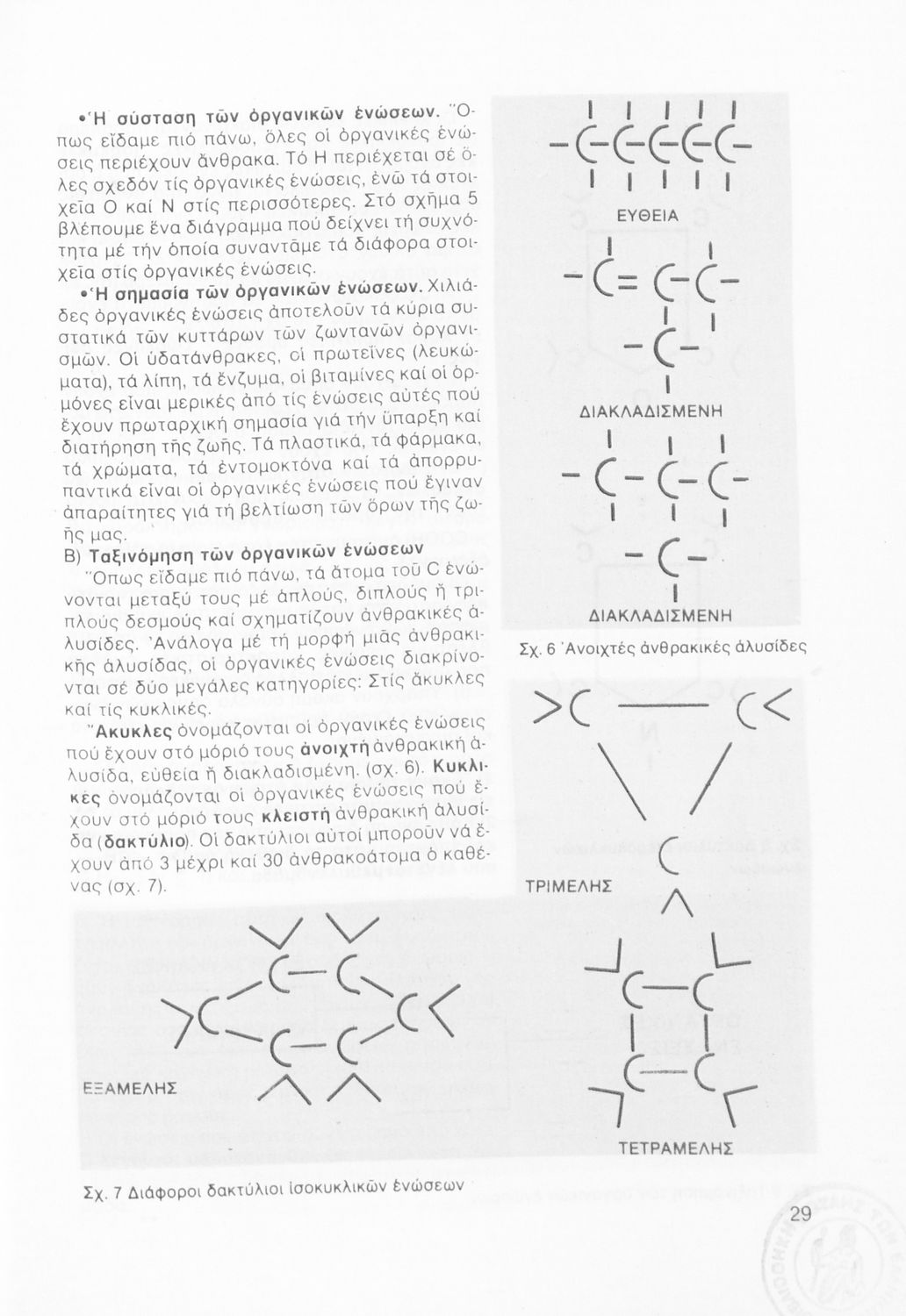 Σχολικό εγχειρίδιο Χημείας Γ΄ Γυμνασίου που περιέχει εισαγωγή στην οργανική χημεία και εστιάζει στους υδρογονάνθρακες, τα σάκχαρα και τα λιπαρά σώματα. Φέρει το σύμβολο της δικτατορίας.