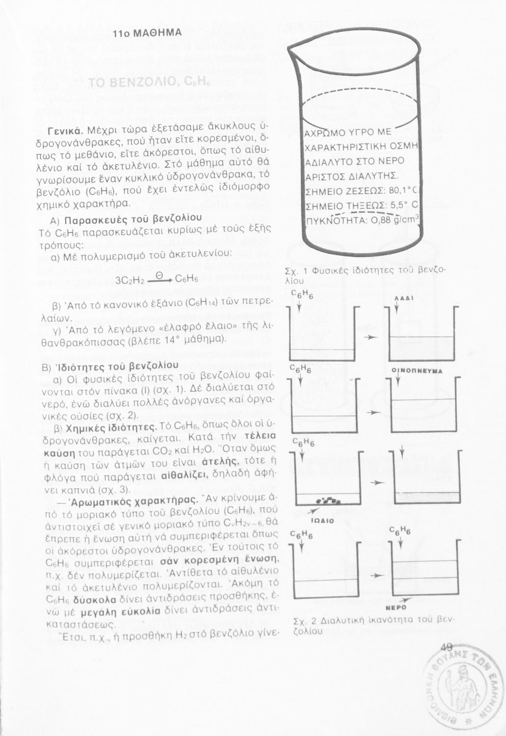 Σχολικό εγχειρίδιο Χημείας Γ΄ Γυμνασίου που περιέχει εισαγωγή στην οργανική χημεία και εστιάζει στους υδρογονάνθρακες, τα σάκχαρα και τα λιπαρά σώματα. Φέρει το σύμβολο της δικτατορίας.