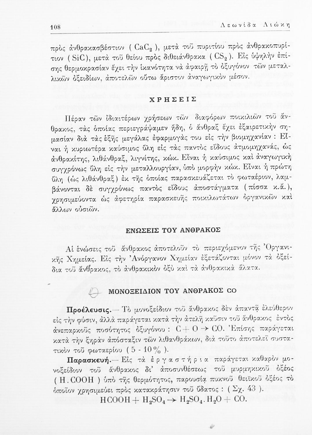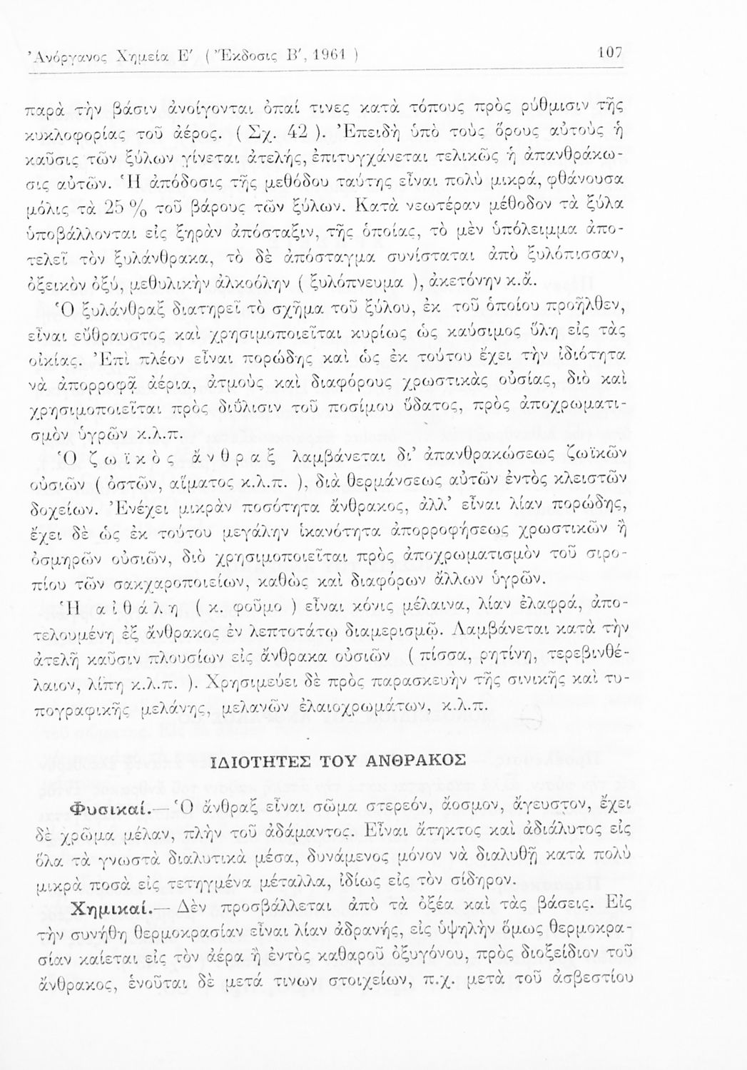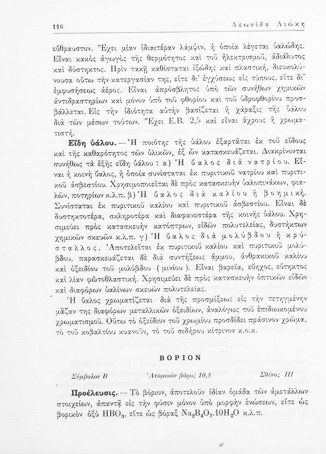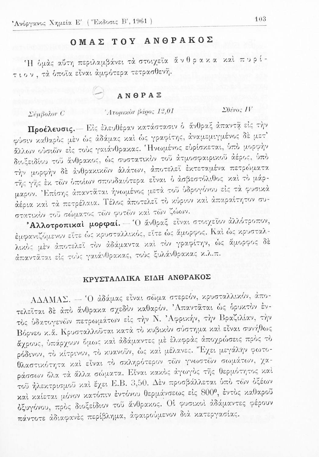 Σχολικό εγχειρίδιο Χημείας για τους μαθητές της Ε' Γυμνασίου. Χωρίζεται σε τρία μέρη. Στο πρώτο μέρος είναι μια γενική εισαγωγή στους θεμελιώδεις νόμους της Χημείας, τις χημικές αντιδράσεις, τα χημικά σύμβολα. Στο δεύτερο και το τρίτο μέρος υπάρχει η παρουσίαση των αμέταλλων στοιχείων όπως το οξυγόνο, το άζωτο και ο άνθρακας, τα παράγωγά και τις ιδιότητες τους. Στο τρίτο παρουσιάζονται τα μέταλλα και τα παράγωγά τους όπως ο χρυσός, ο αργύλιος, ο χαλκός. Τέλος, το βιβλίο ολοκληρώνει με μια σύντομη εισαγωγή στη ραδιενέργεια.