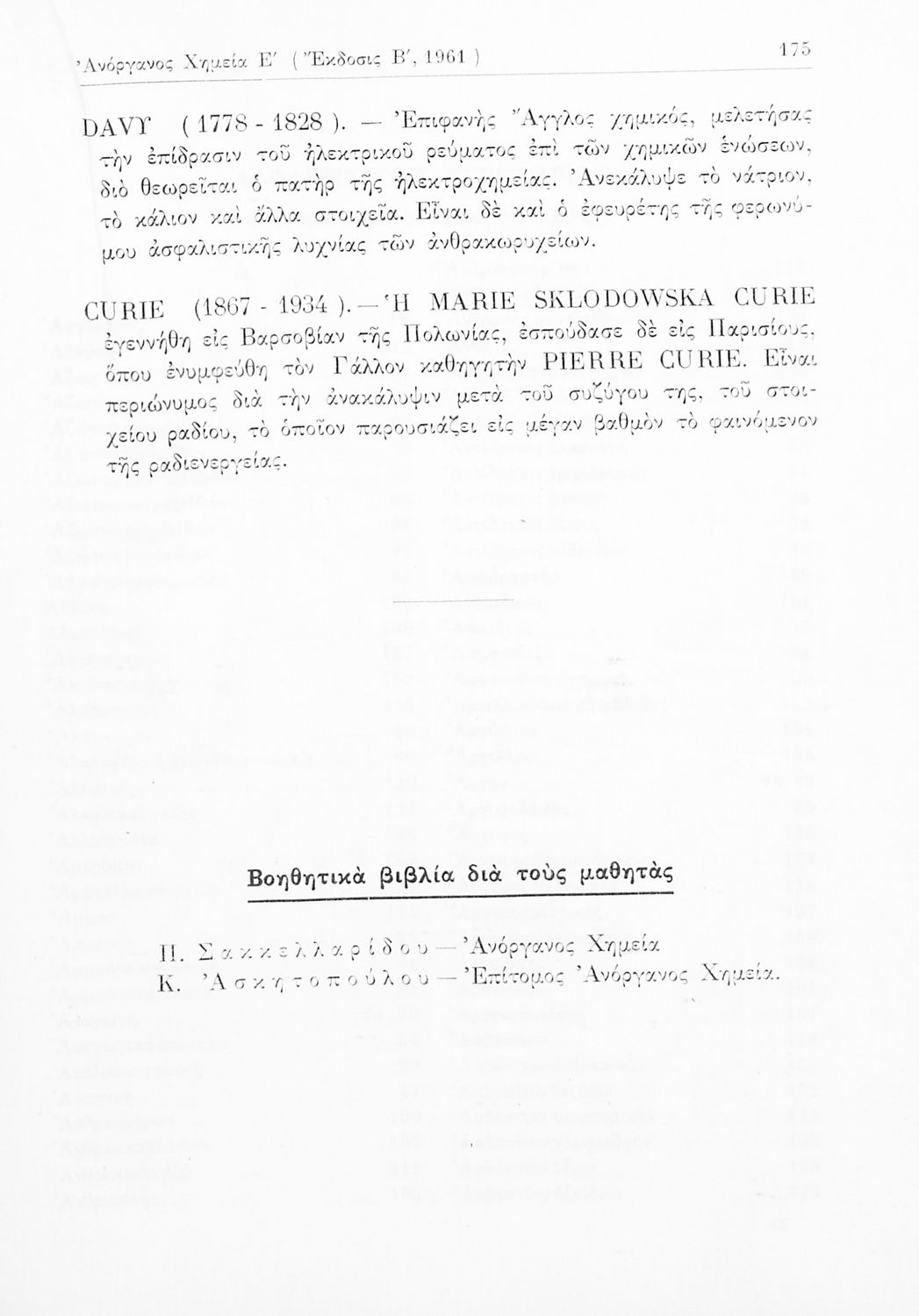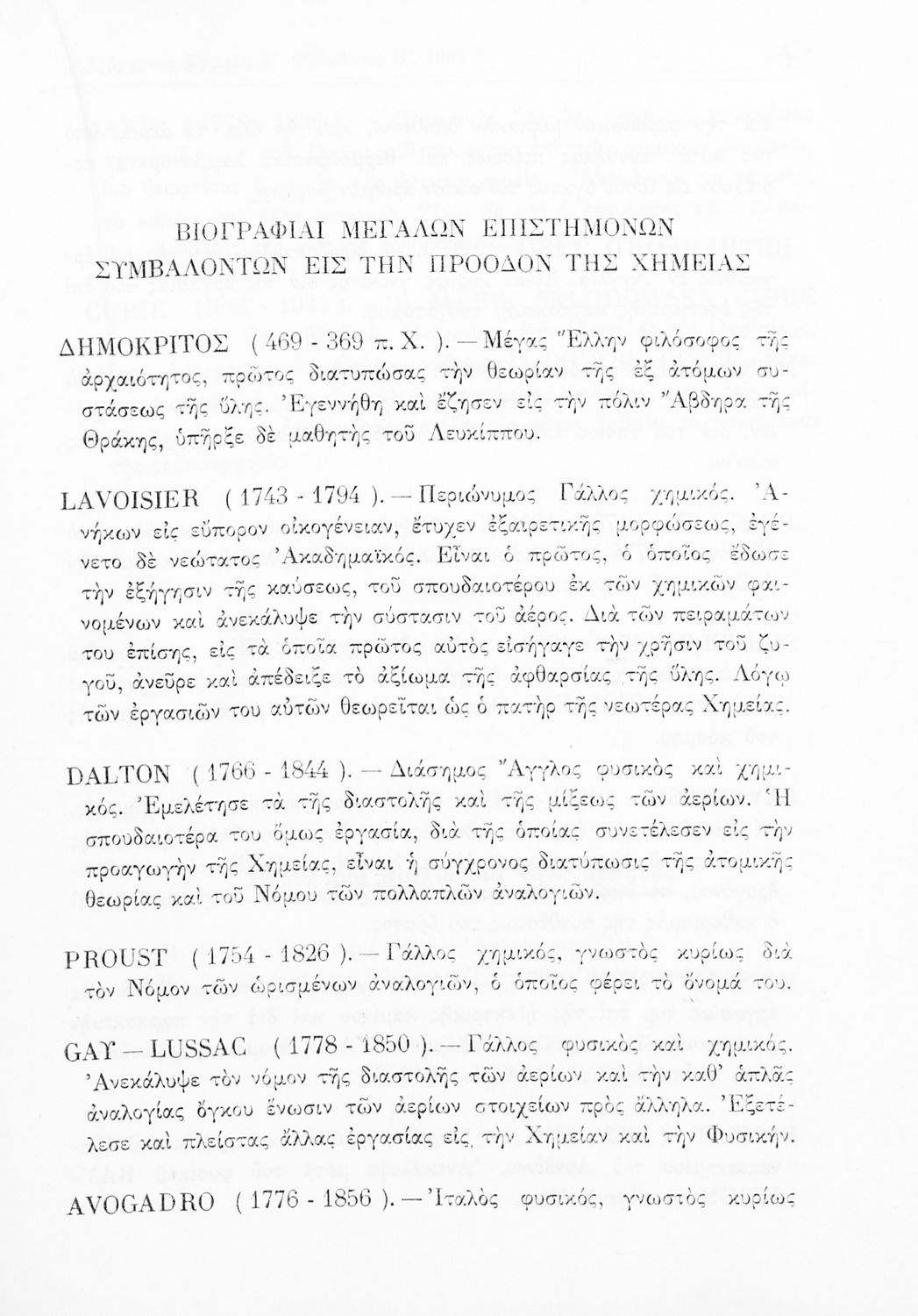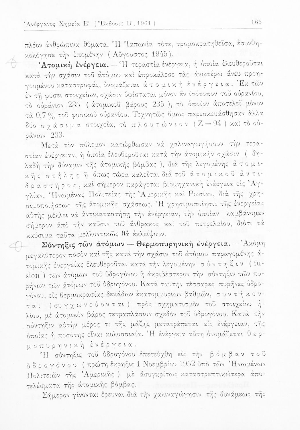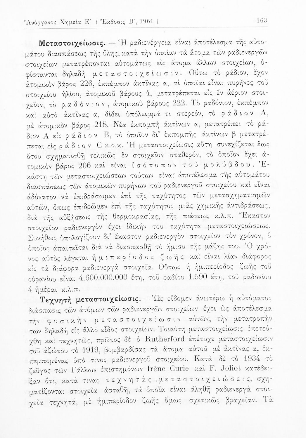 Σχολικό εγχειρίδιο Χημείας για τους μαθητές της Ε' Γυμνασίου. Χωρίζεται σε τρία μέρη. Στο πρώτο μέρος είναι μια γενική εισαγωγή στους θεμελιώδεις νόμους της Χημείας, τις χημικές αντιδράσεις, τα χημικά σύμβολα. Στο δεύτερο και το τρίτο μέρος υπάρχει η παρουσίαση των αμέταλλων στοιχείων όπως το οξυγόνο, το άζωτο και ο άνθρακας, τα παράγωγά και τις ιδιότητες τους. Στο τρίτο παρουσιάζονται τα μέταλλα και τα παράγωγά τους όπως ο χρυσός, ο αργύλιος, ο χαλκός. Τέλος, το βιβλίο ολοκληρώνει με μια σύντομη εισαγωγή στη ραδιενέργεια.