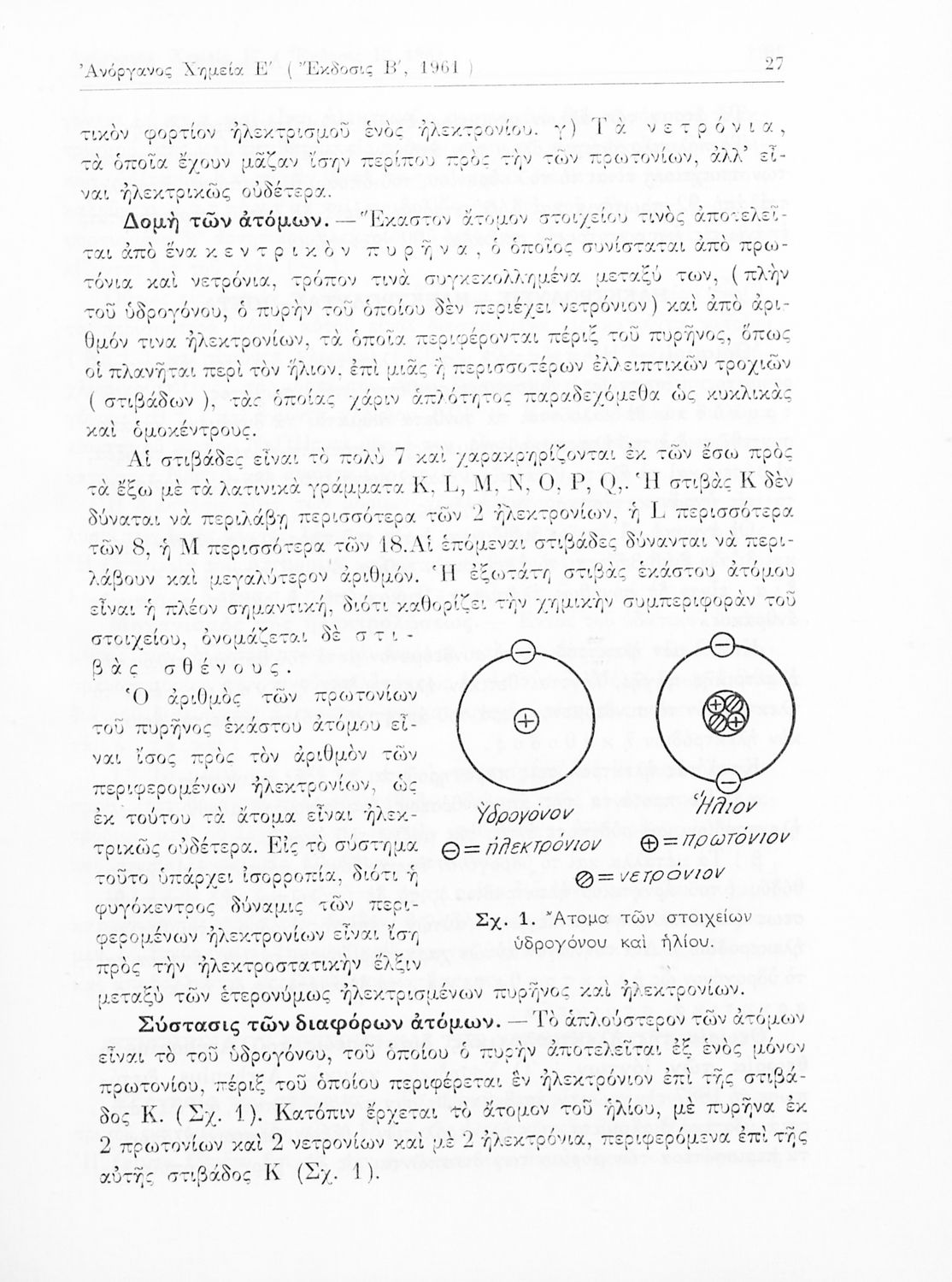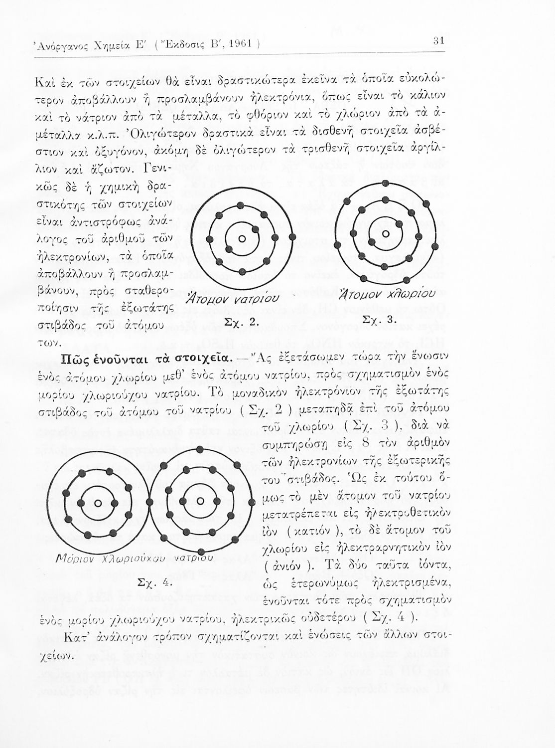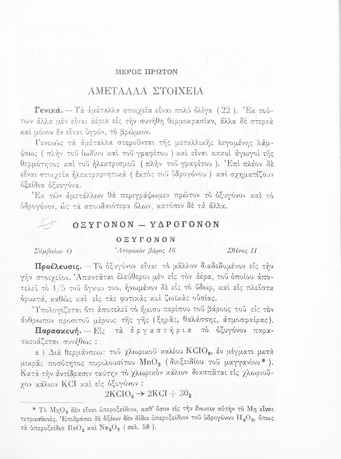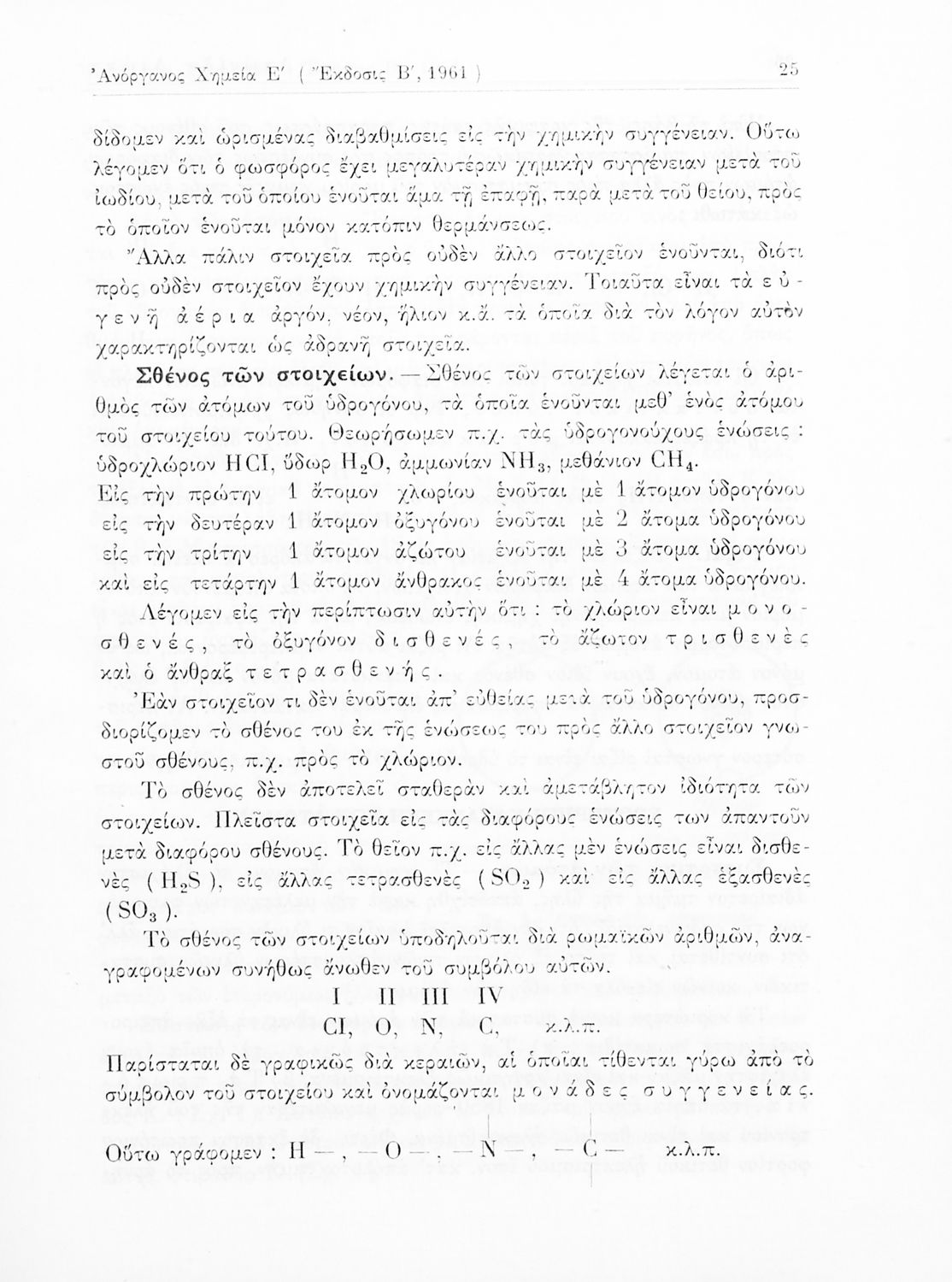Σχολικό εγχειρίδιο Χημείας για τους μαθητές της Ε' Γυμνασίου. Χωρίζεται σε τρία μέρη. Στο πρώτο μέρος είναι μια γενική εισαγωγή στους θεμελιώδεις νόμους της Χημείας, τις χημικές αντιδράσεις, τα χημικά σύμβολα. Στο δεύτερο και το τρίτο μέρος υπάρχει η παρουσίαση των αμέταλλων στοιχείων όπως το οξυγόνο, το άζωτο και ο άνθρακας, τα παράγωγά και τις ιδιότητες τους. Στο τρίτο παρουσιάζονται τα μέταλλα και τα παράγωγά τους όπως ο χρυσός, ο αργύλιος, ο χαλκός. Τέλος, το βιβλίο ολοκληρώνει με μια σύντομη εισαγωγή στη ραδιενέργεια.