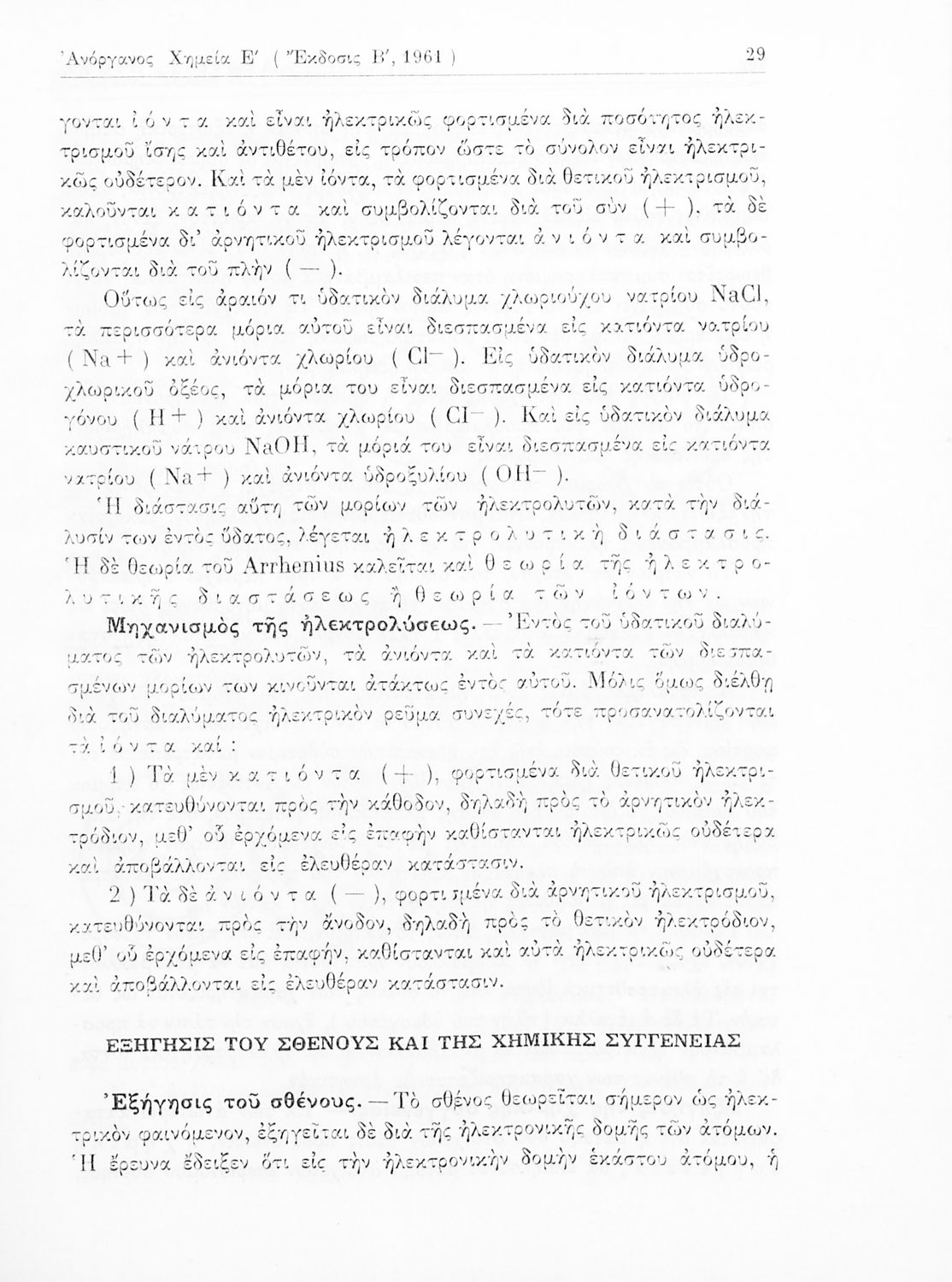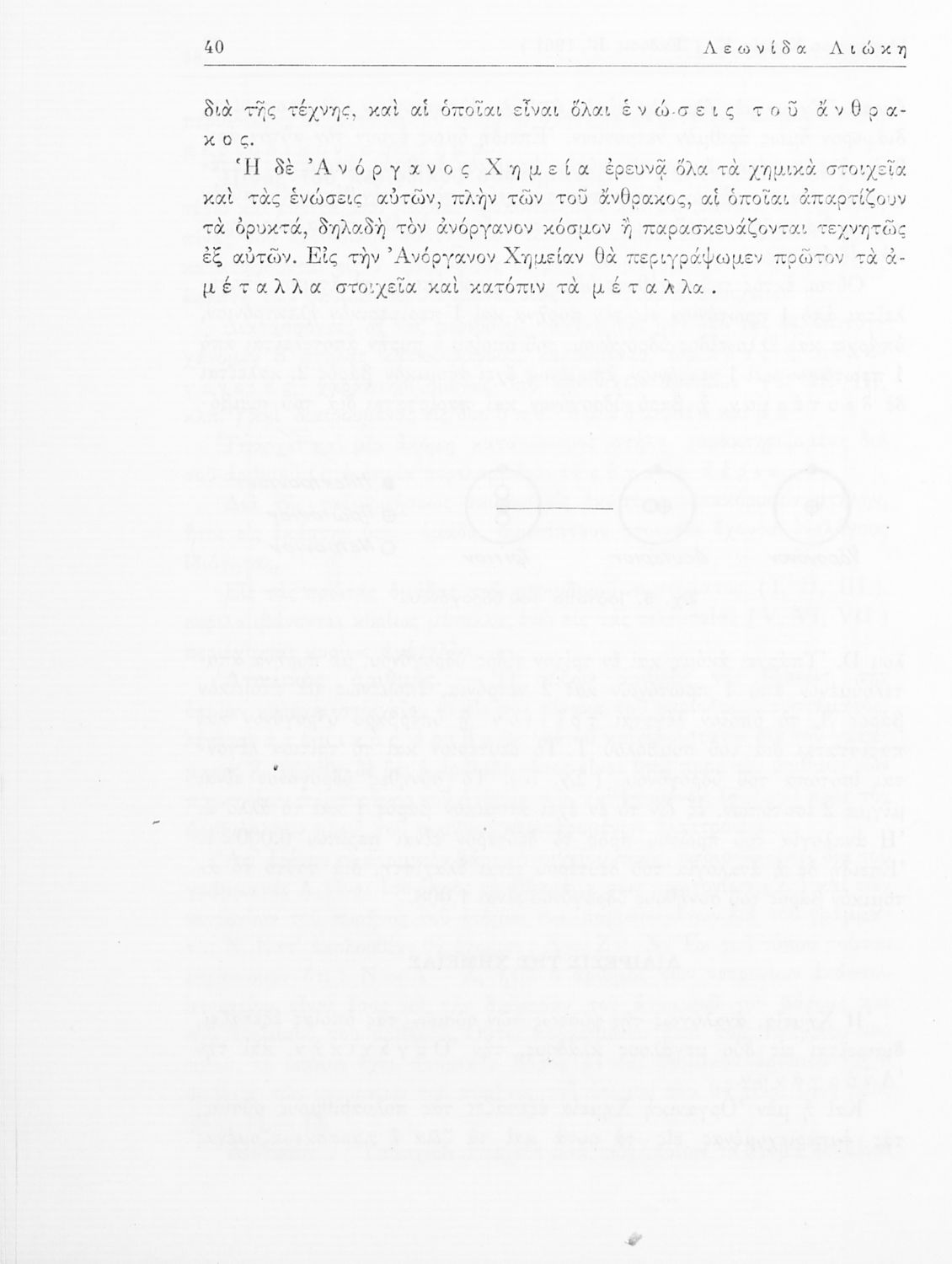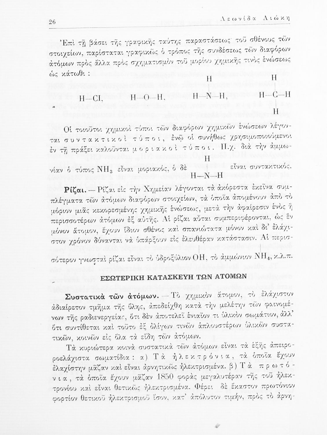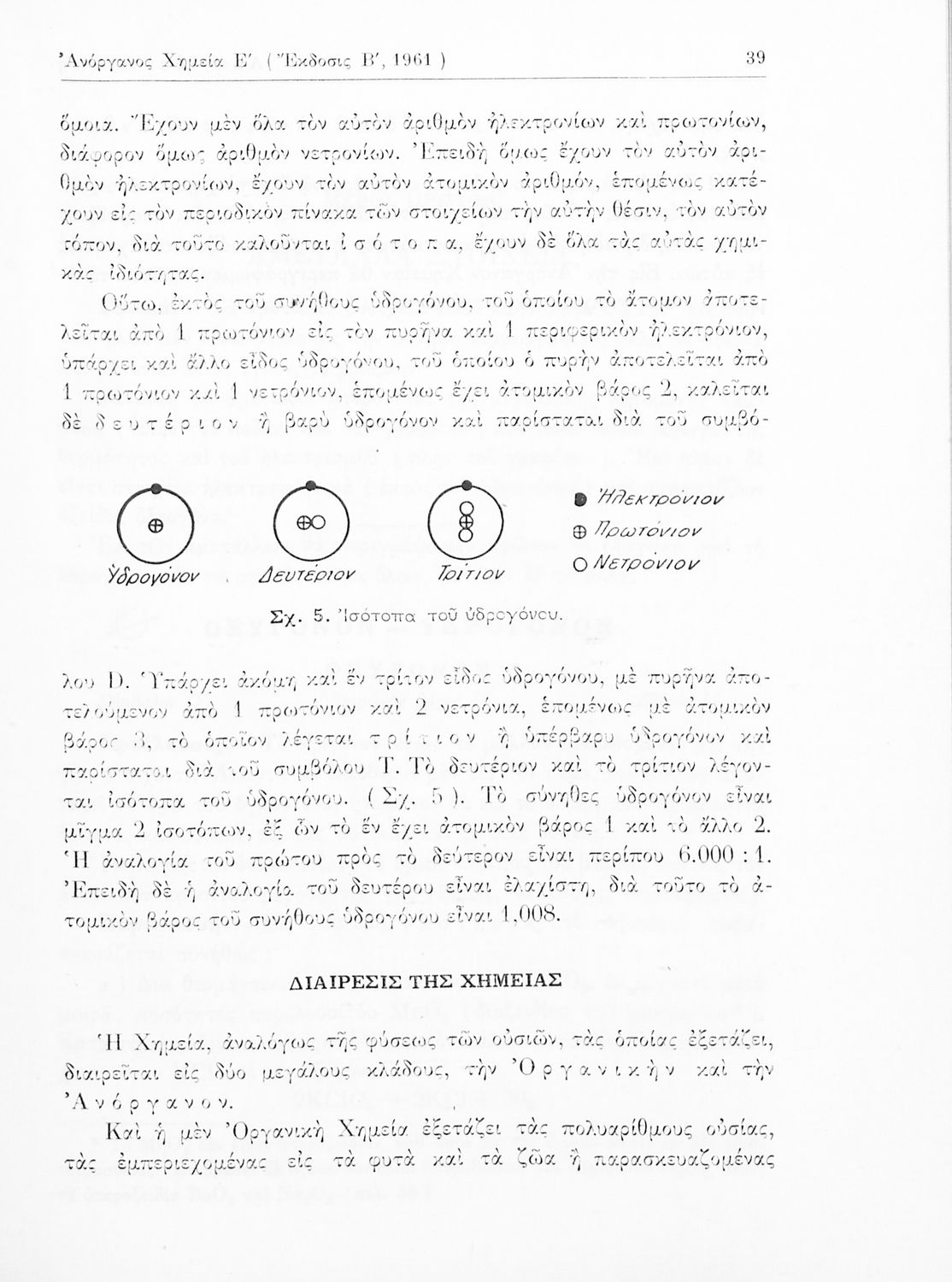 Σχολικό εγχειρίδιο Χημείας για τους μαθητές της Ε' Γυμνασίου. Χωρίζεται σε τρία μέρη. Στο πρώτο μέρος είναι μια γενική εισαγωγή στους θεμελιώδεις νόμους της Χημείας, τις χημικές αντιδράσεις, τα χημικά σύμβολα. Στο δεύτερο και το τρίτο μέρος υπάρχει η παρουσίαση των αμέταλλων στοιχείων όπως το οξυγόνο, το άζωτο και ο άνθρακας, τα παράγωγά και τις ιδιότητες τους. Στο τρίτο παρουσιάζονται τα μέταλλα και τα παράγωγά τους όπως ο χρυσός, ο αργύλιος, ο χαλκός. Τέλος, το βιβλίο ολοκληρώνει με μια σύντομη εισαγωγή στη ραδιενέργεια.