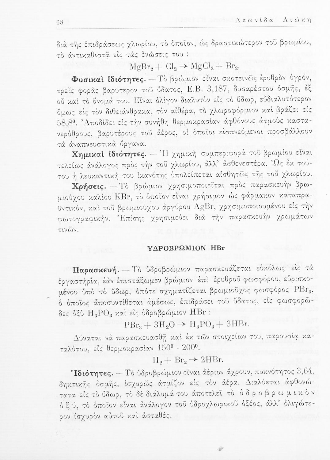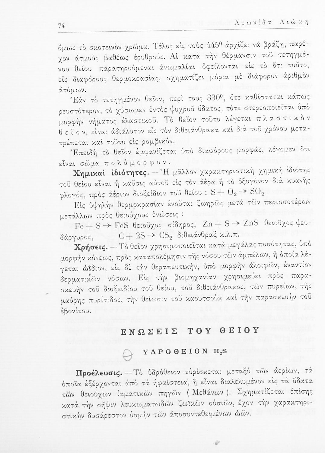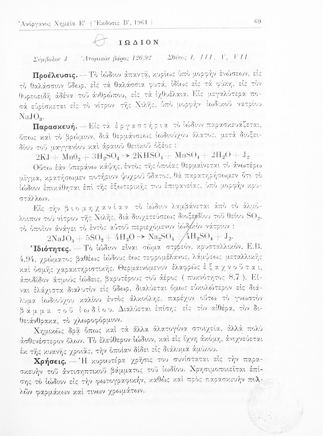 Σχολικό εγχειρίδιο Χημείας για τους μαθητές της Ε' Γυμνασίου. Χωρίζεται σε τρία μέρη. Στο πρώτο μέρος είναι μια γενική εισαγωγή στους θεμελιώδεις νόμους της Χημείας, τις χημικές αντιδράσεις, τα χημικά σύμβολα. Στο δεύτερο και το τρίτο μέρος υπάρχει η παρουσίαση των αμέταλλων στοιχείων όπως το οξυγόνο, το άζωτο και ο άνθρακας, τα παράγωγά και τις ιδιότητες τους. Στο τρίτο παρουσιάζονται τα μέταλλα και τα παράγωγά τους όπως ο χρυσός, ο αργύλιος, ο χαλκός. Τέλος, το βιβλίο ολοκληρώνει με μια σύντομη εισαγωγή στη ραδιενέργεια.