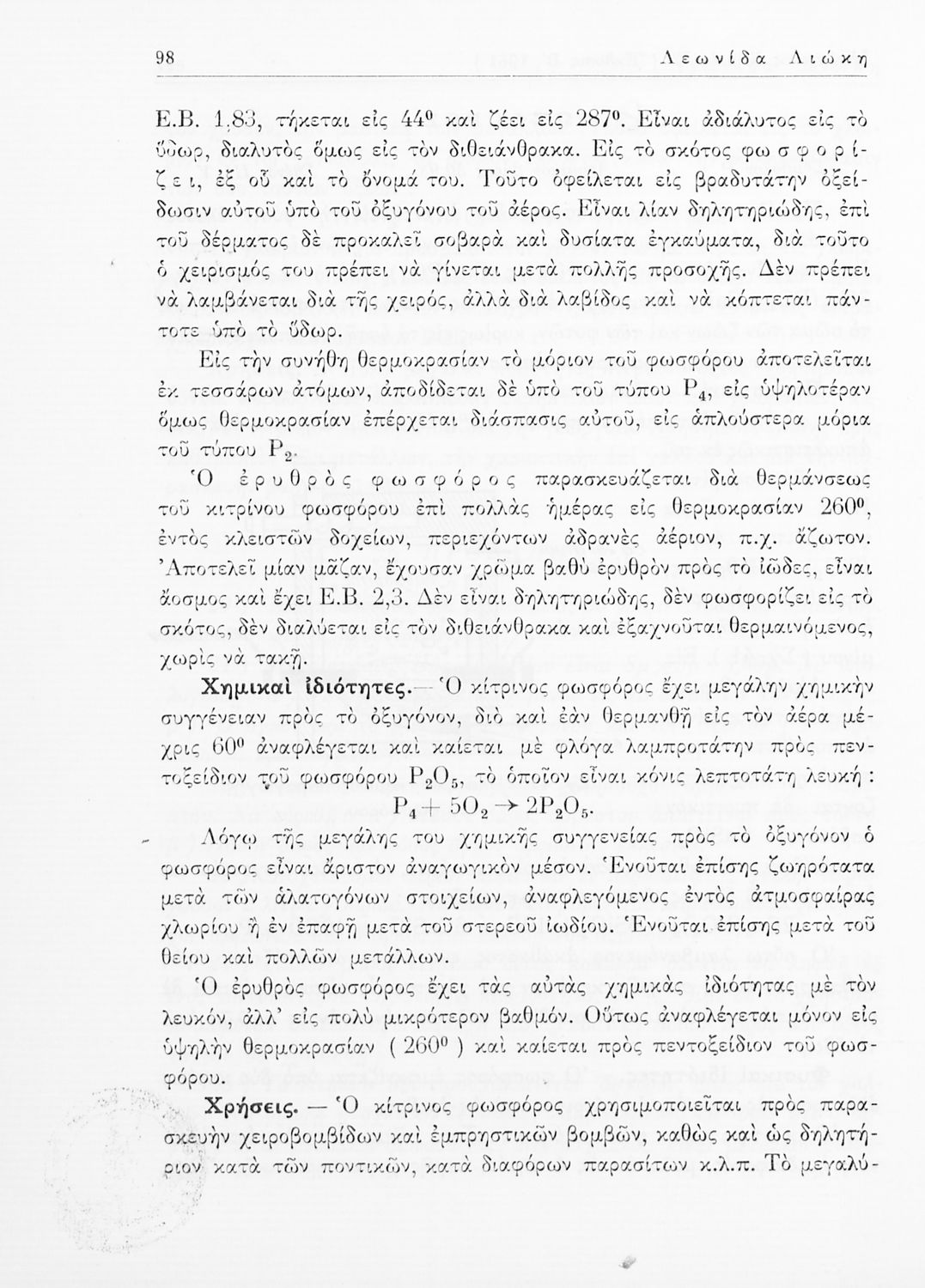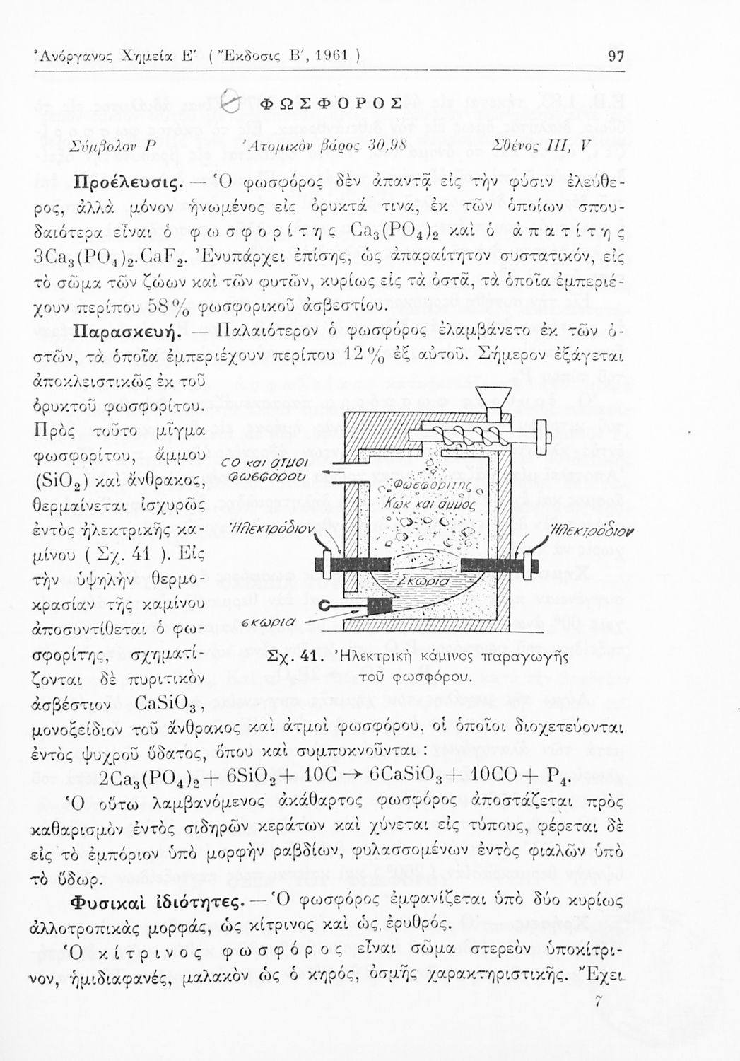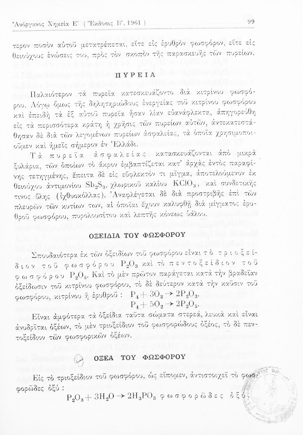 Σχολικό εγχειρίδιο Χημείας για τους μαθητές της Ε' Γυμνασίου. Χωρίζεται σε τρία μέρη. Στο πρώτο μέρος είναι μια γενική εισαγωγή στους θεμελιώδεις νόμους της Χημείας, τις χημικές αντιδράσεις, τα χημικά σύμβολα. Στο δεύτερο και το τρίτο μέρος υπάρχει η παρουσίαση των αμέταλλων στοιχείων όπως το οξυγόνο, το άζωτο και ο άνθρακας, τα παράγωγά και τις ιδιότητες τους. Στο τρίτο παρουσιάζονται τα μέταλλα και τα παράγωγά τους όπως ο χρυσός, ο αργύλιος, ο χαλκός. Τέλος, το βιβλίο ολοκληρώνει με μια σύντομη εισαγωγή στη ραδιενέργεια.