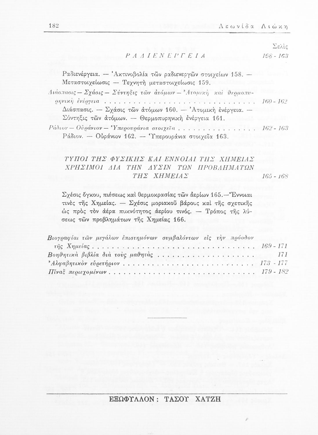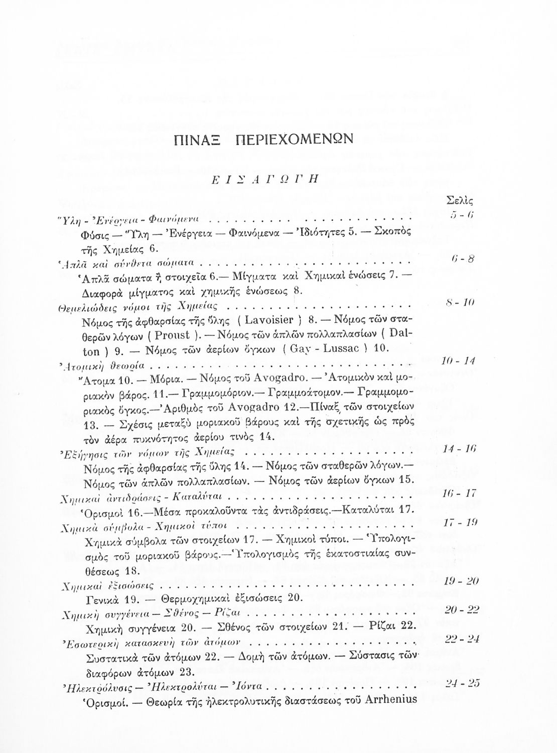 Σχολικό εγχειρίδιο Χημείας για τους μαθητές της Ε' Γυμνασίου. Χωρίζεται σε τρία μέρη. Στο πρώτο μέρος είναι μια γενική εισαγωγή στους θεμελιώδεις νόμους της Χημείας, τις χημικές αντιδράσεις, τα χημικά σύμβολα.