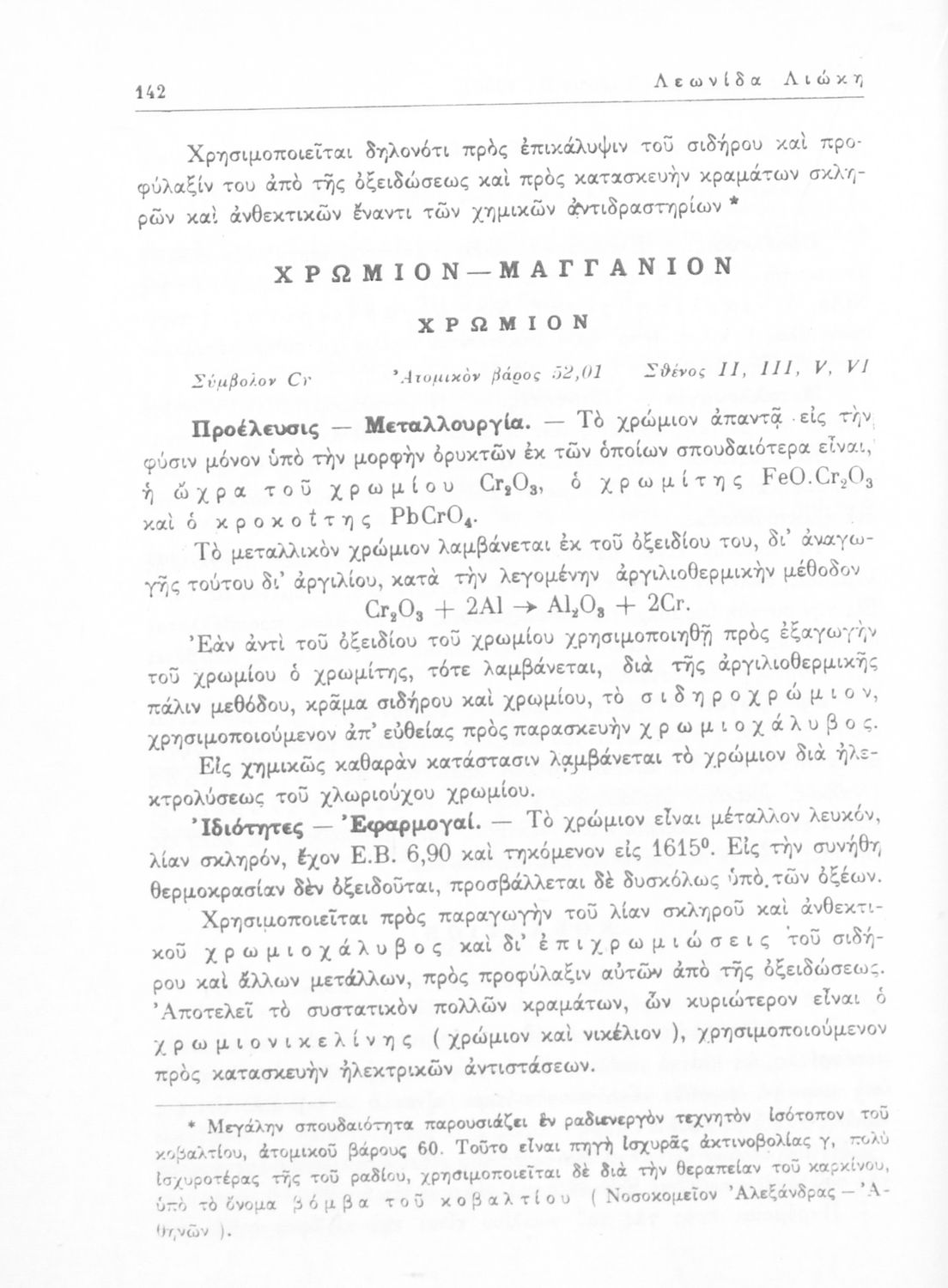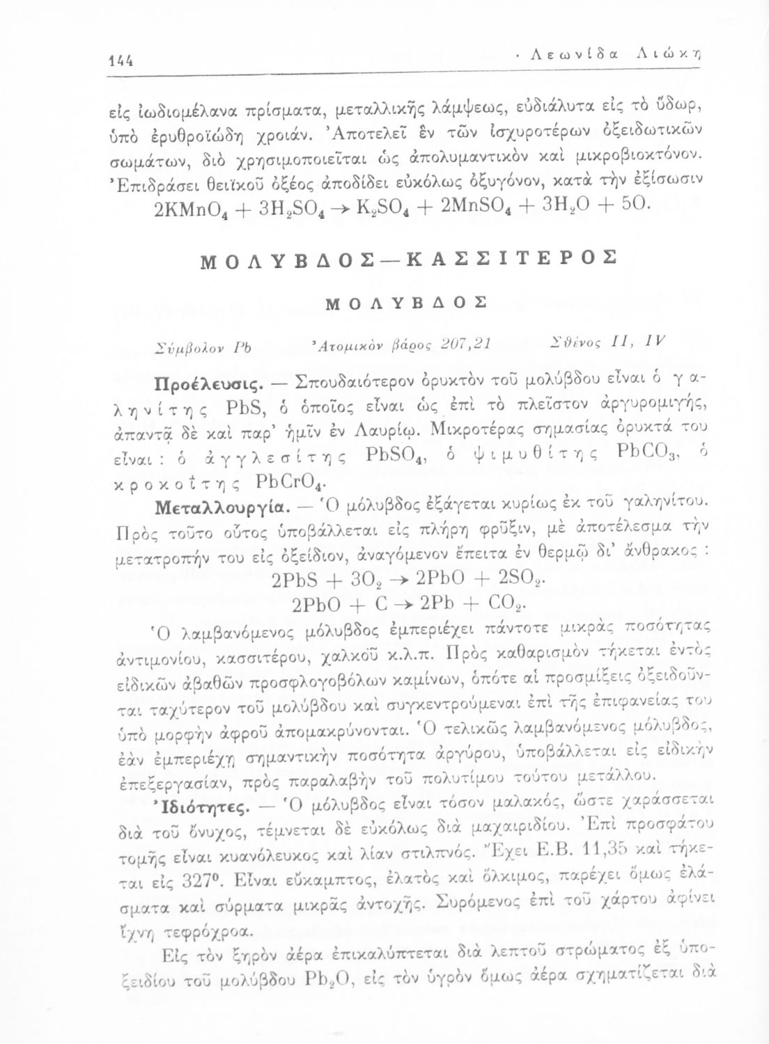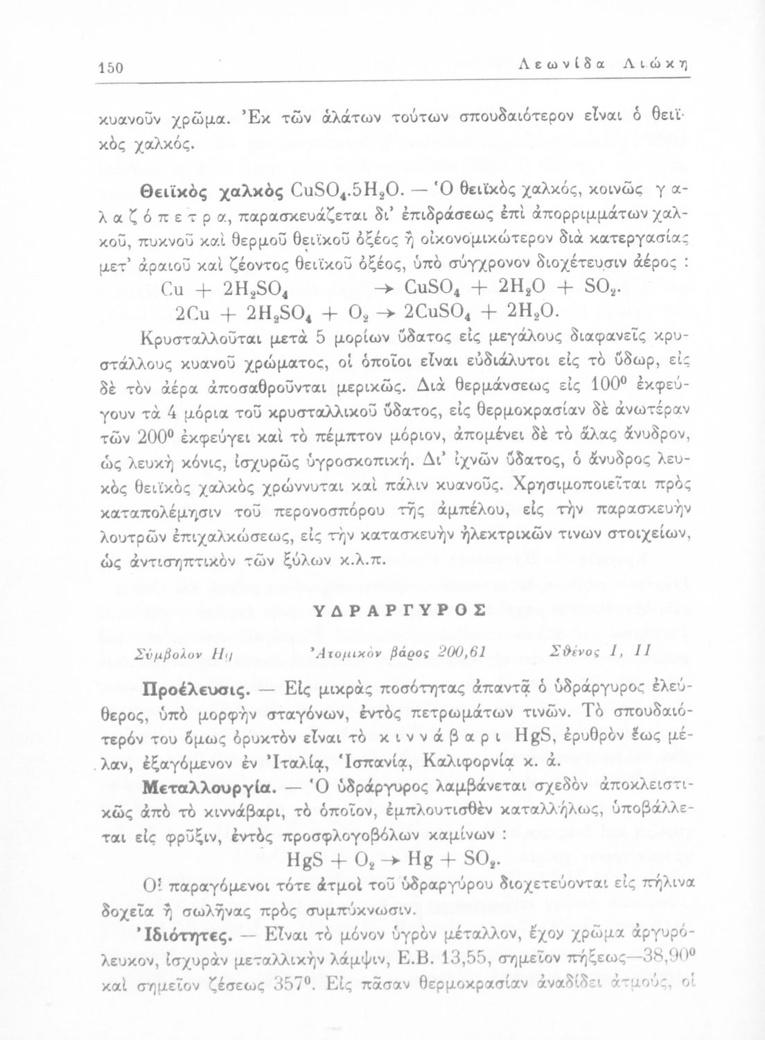 Σχολικό εγχειρίδιο Χημείας για τους μαθητές της Ε' Γυμνασίου. Χωρίζεται σε τρία μέρη. Στο πρώτο μέρος είναι μια γενική εισαγωγή που παρουσιάζει τους θεμελιώδεις νόμους της Χημείας, τις χημικές αντιδράσεις, τα χημικά σύμβολα. Στο δεύτερο και το τρίτο μέρος υπάρχει η παρουσίαση των αμέταλλων στοιχείων όπως το οξυγόνο, το άζωτο και ο άνθρακας, τα παράγωγά και τις ιδιότητες τους. Στο τρίτο παρουσιάζονται τα μέταλλα και τα παράγωγά τους όπως ο χρυσός, ο αργύλιος, ο χαλκός. Τέλος, το βιβλίο ολοκληρώνει με μια σύντομη εισαγωγή στη ραδιενέργεια.