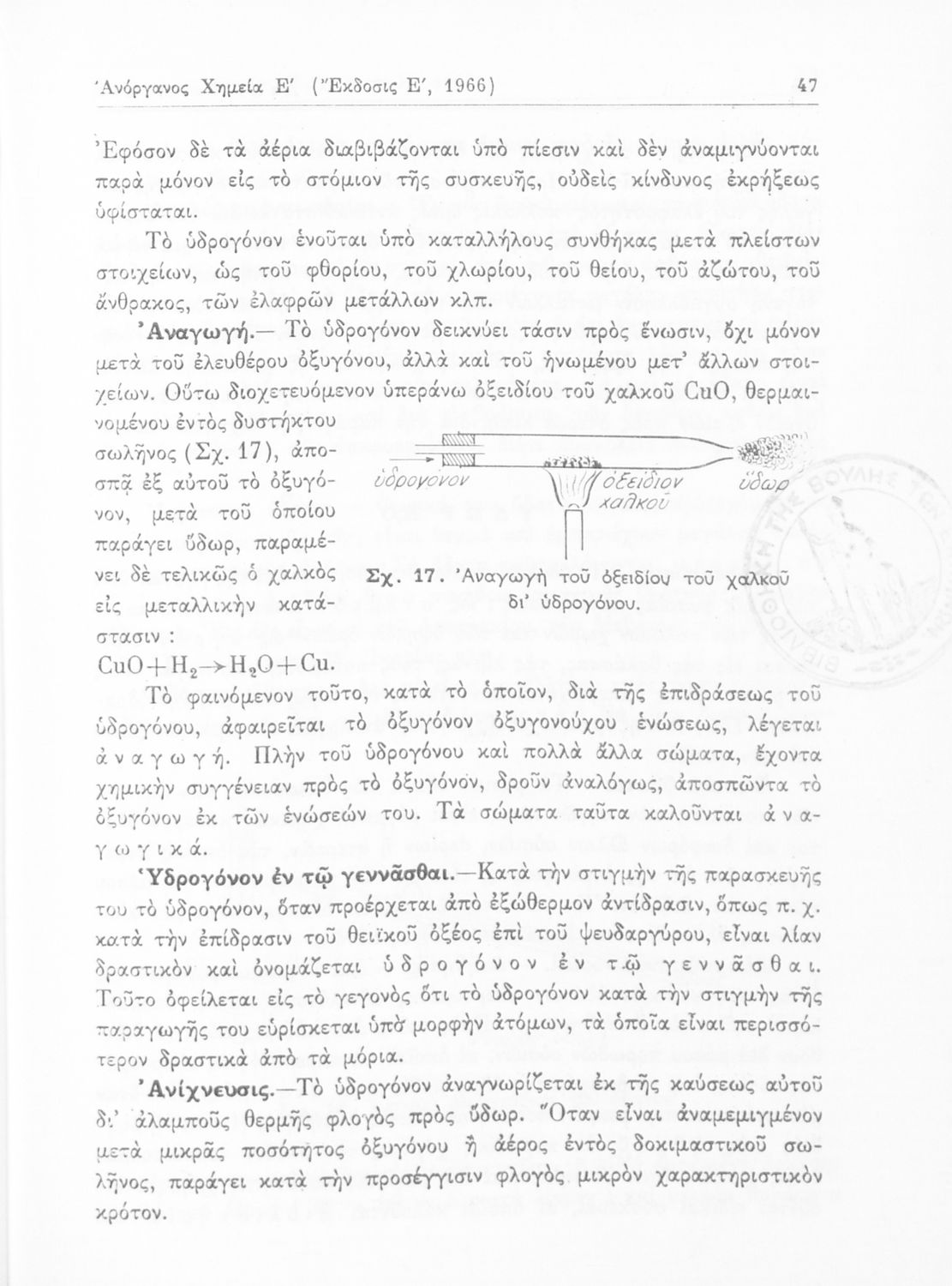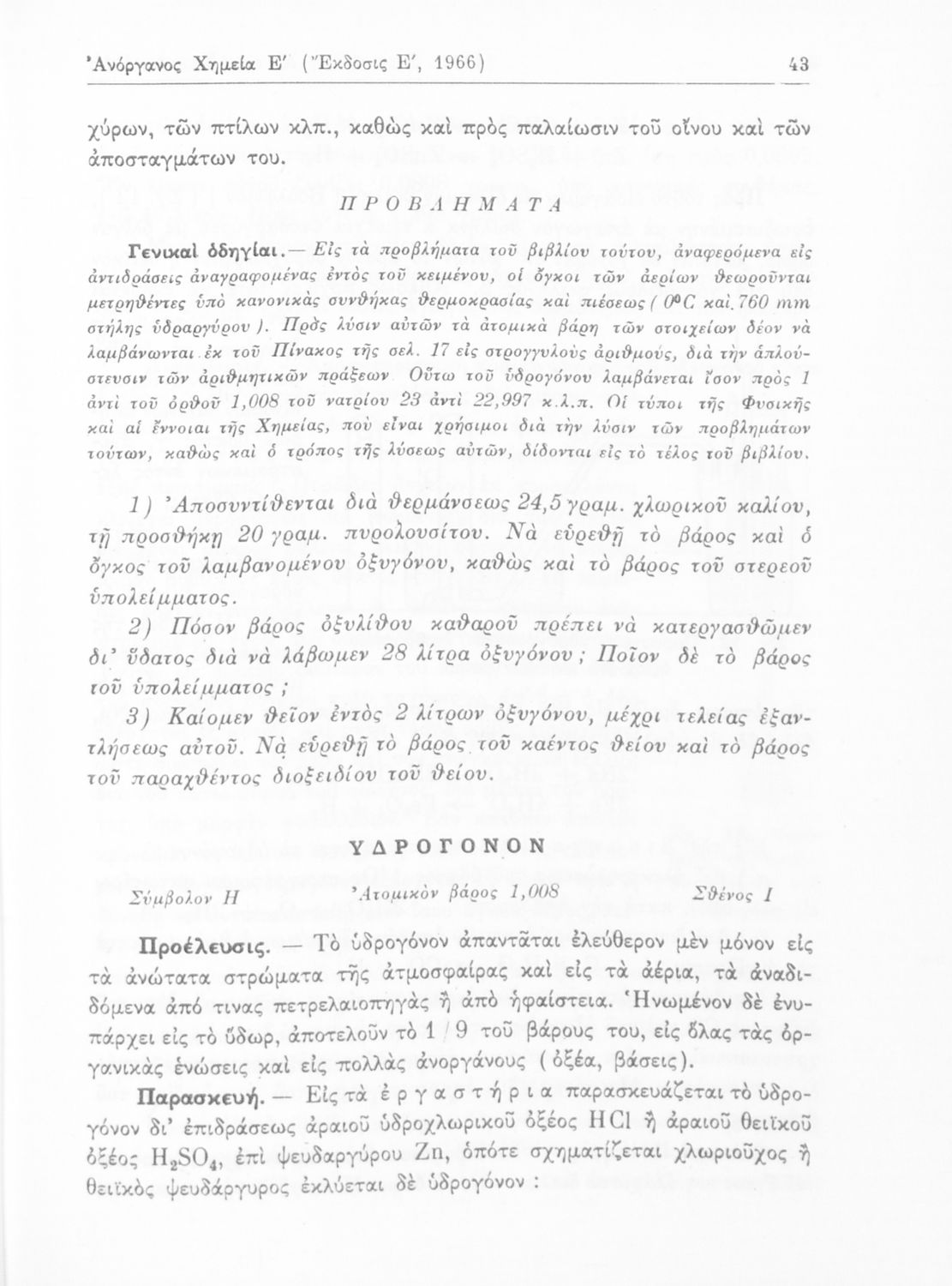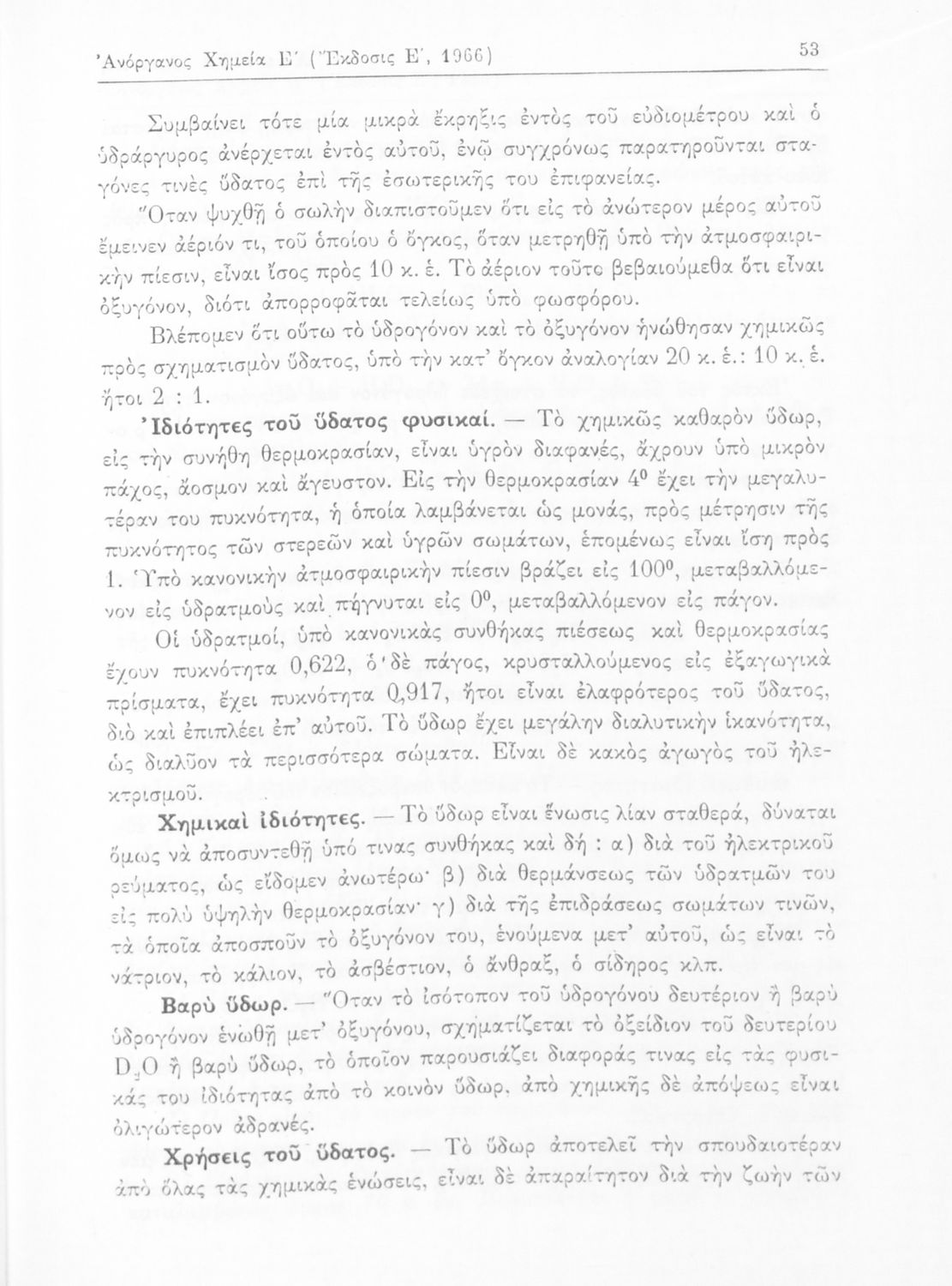 Σχολικό εγχειρίδιο Χημείας για τους μαθητές της Ε' Γυμνασίου. Χωρίζεται σε τρία μέρη. Στο πρώτο μέρος είναι μια γενική εισαγωγή που παρουσιάζει τους θεμελιώδεις νόμους της Χημείας, τις χημικές αντιδράσεις, τα χημικά σύμβολα. Στο δεύτερο και το τρίτο μέρος υπάρχει η παρουσίαση των αμέταλλων στοιχείων όπως το οξυγόνο, το άζωτο και ο άνθρακας, τα παράγωγά και τις ιδιότητες τους. Στο τρίτο παρουσιάζονται τα μέταλλα και τα παράγωγά τους όπως ο χρυσός, ο αργύλιος, ο χαλκός. Τέλος, το βιβλίο ολοκληρώνει με μια σύντομη εισαγωγή στη ραδιενέργεια.
