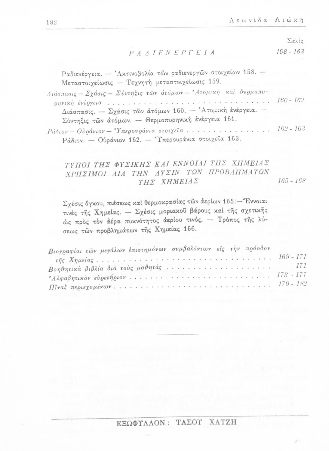 Σχολικό εγχειρίδιο Χημείας της Δευτεροβάθμιας Εκπαίδευσης. Το βιβλίο χωρίζεται σε τέσσερις ενότητες. Η πρώτη ενότητα είναι μια εισαγωγή στους βασικούς όρους και έννοιες της Χημείας όπως ύλη, ενέργεια και χημικές εξισώσεις. Στις επόμενες δύο ενότητες παρουσιάζει τις ιδιότητες και τα χαρακτηριστικά των αμέταλλων και των μετάλλων. Στην τελευταία ενότητα, αναφέρεται στη ραδιενέργεια και την διάσπαση των ατόμων.