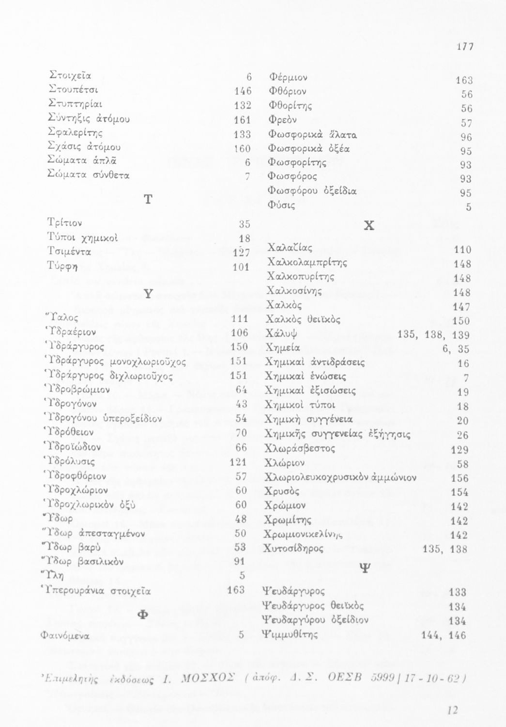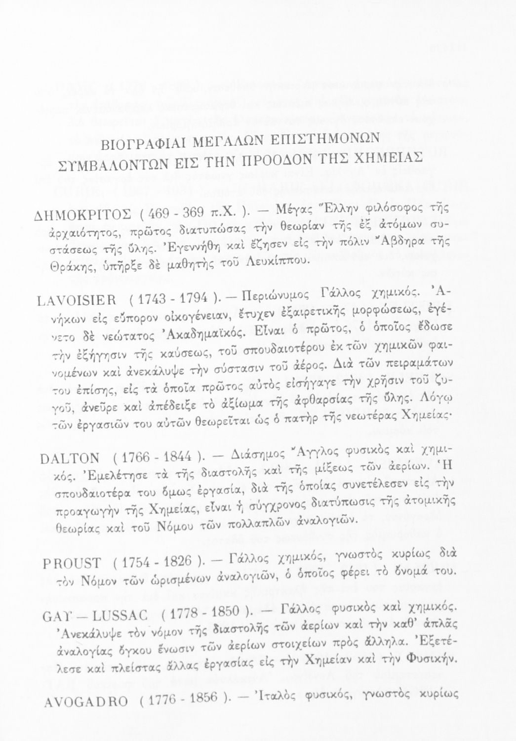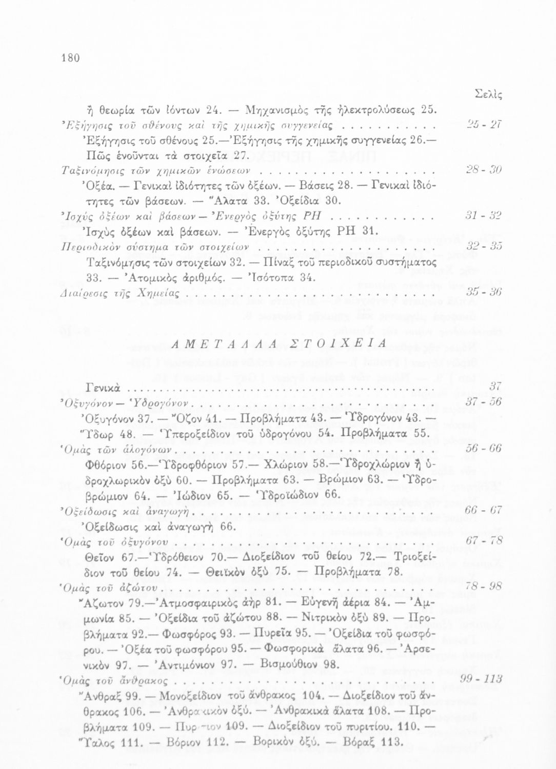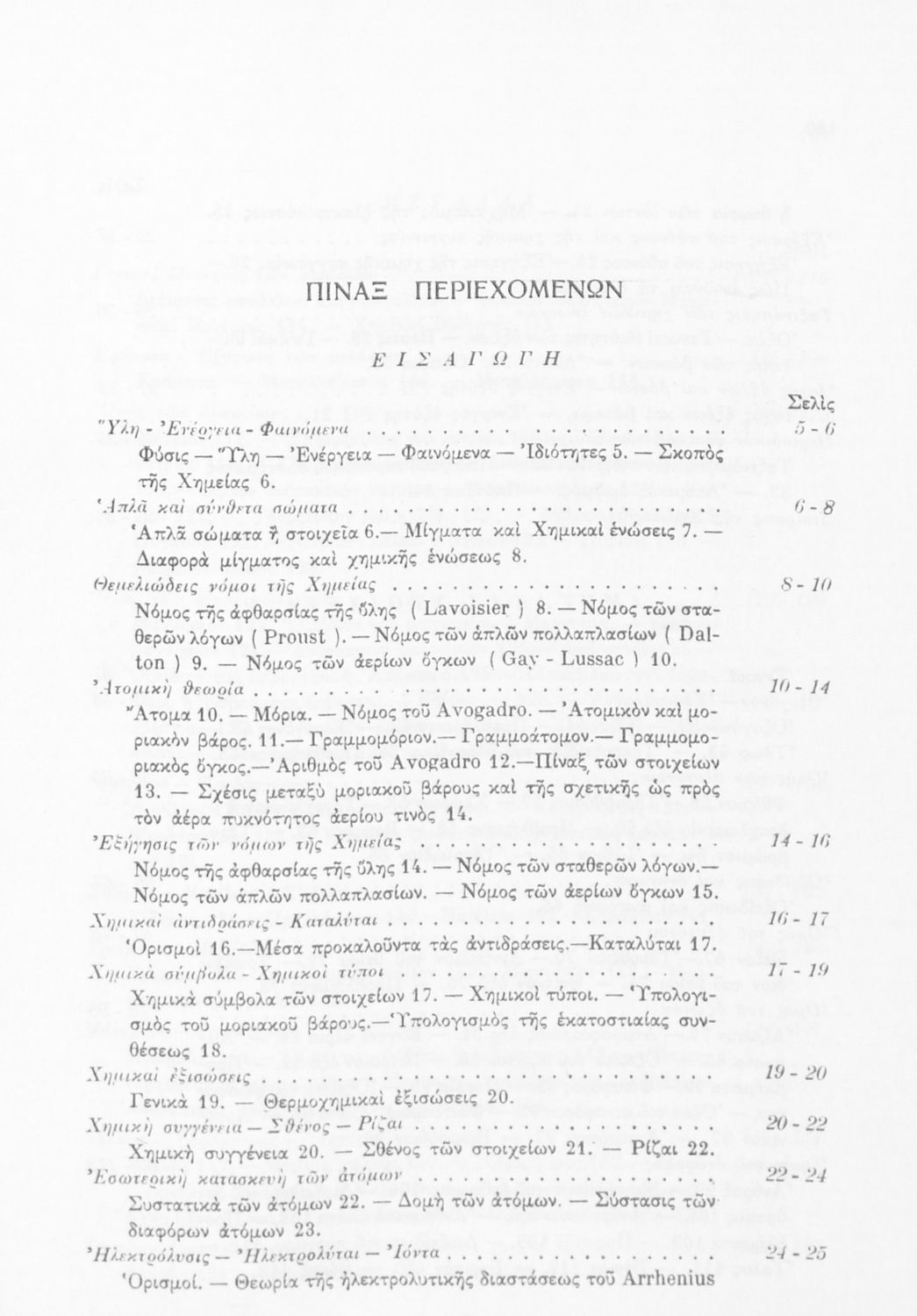 Σχολικό εγχειρίδιο Χημείας για τους μαθητές της Δ' και Ε' Γυμνασίου. Χωρίζεται σε τρία μέρη. Στο πρώτο μέρος είναι μια γενική εισαγωγή που παρουσιάζει τους θεμελιώδεις νόμους της Χημείας, τις χημικές αντιδράσεις, τα χημικά σύμβολα. Στο δεύτερο και το τρίτο μέρος υπάρχει η παρουσίαση των αμέταλλων στοιχείων όπως το οξυγόνο, το άζωτο και ο άνθρακας, τα παράγωγά και τις ιδιότητες τους. Στο τρίτο παρουσιάζονται τα μέταλλα και τα παράγωγά τους όπως ο χρυσός, ο αργύλιος, ο χαλκός. Τέλος, το βιβλίο ολοκληρώνει με μια σύντομη εισαγωγή στη ραδιενέργεια.