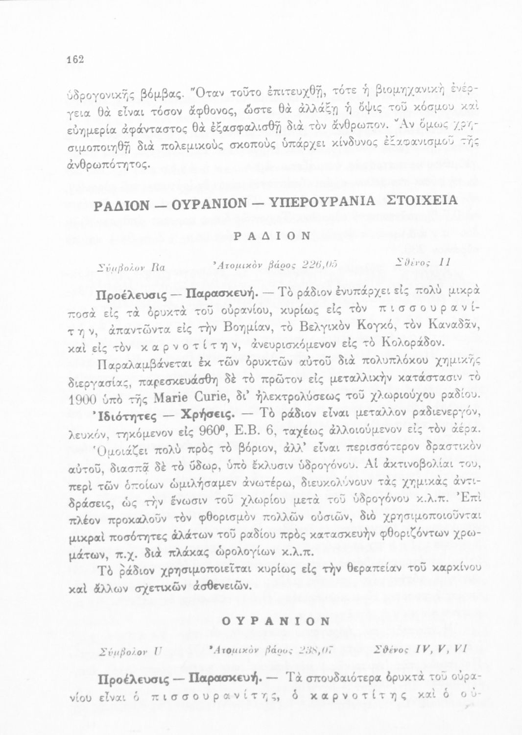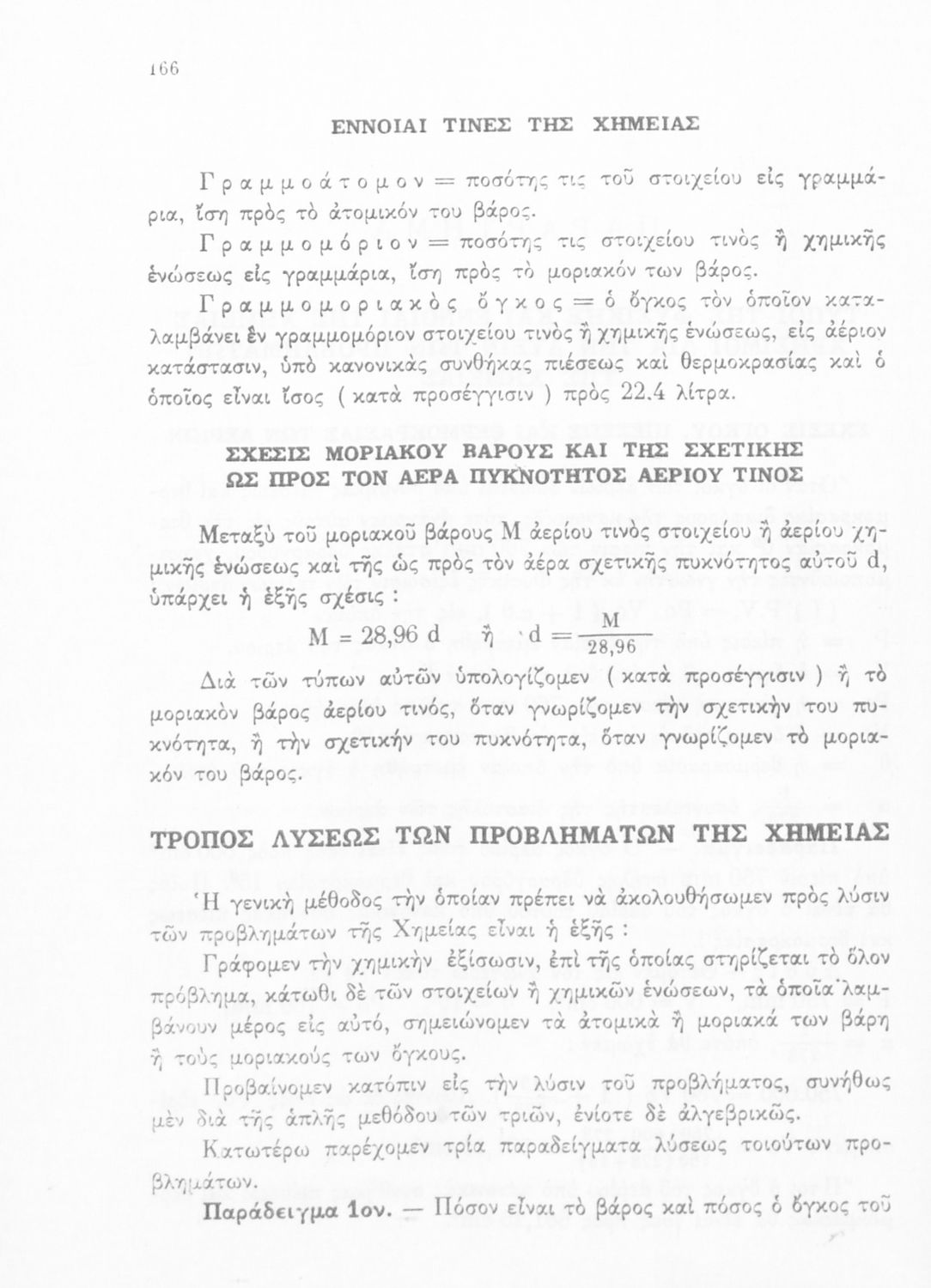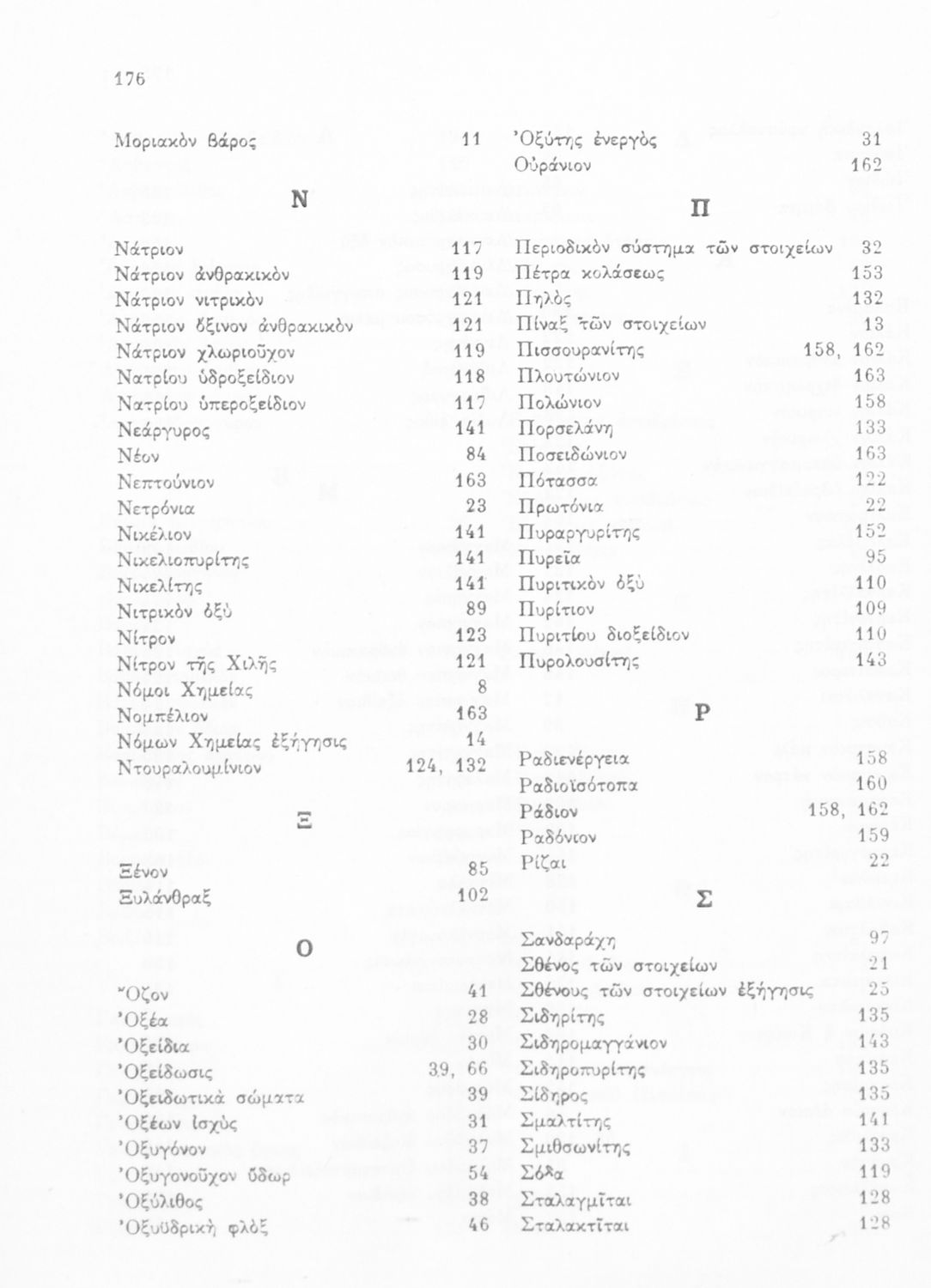Σχολικό εγχειρίδιο Χημείας για τους μαθητές της Δ' και Ε' Γυμνασίου. Χωρίζεται σε τρία μέρη. Στο πρώτο μέρος είναι μια γενική εισαγωγή που παρουσιάζει τους θεμελιώδεις νόμους της Χημείας, τις χημικές αντιδράσεις, τα χημικά σύμβολα. Στο δεύτερο και το τρίτο μέρος υπάρχει η παρουσίαση των αμέταλλων στοιχείων όπως το οξυγόνο, το άζωτο και ο άνθρακας, τα παράγωγά και τις ιδιότητες τους. Στο τρίτο παρουσιάζονται τα μέταλλα και τα παράγωγά τους όπως ο χρυσός, ο αργύλιος, ο χαλκός. Τέλος, το βιβλίο ολοκληρώνει με μια σύντομη εισαγωγή στη ραδιενέργεια.